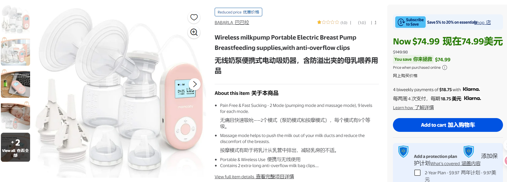 美国 momcozy 无线便捷式电动吸奶器 双泵头 医用食品级奶嘴 带按摩功能