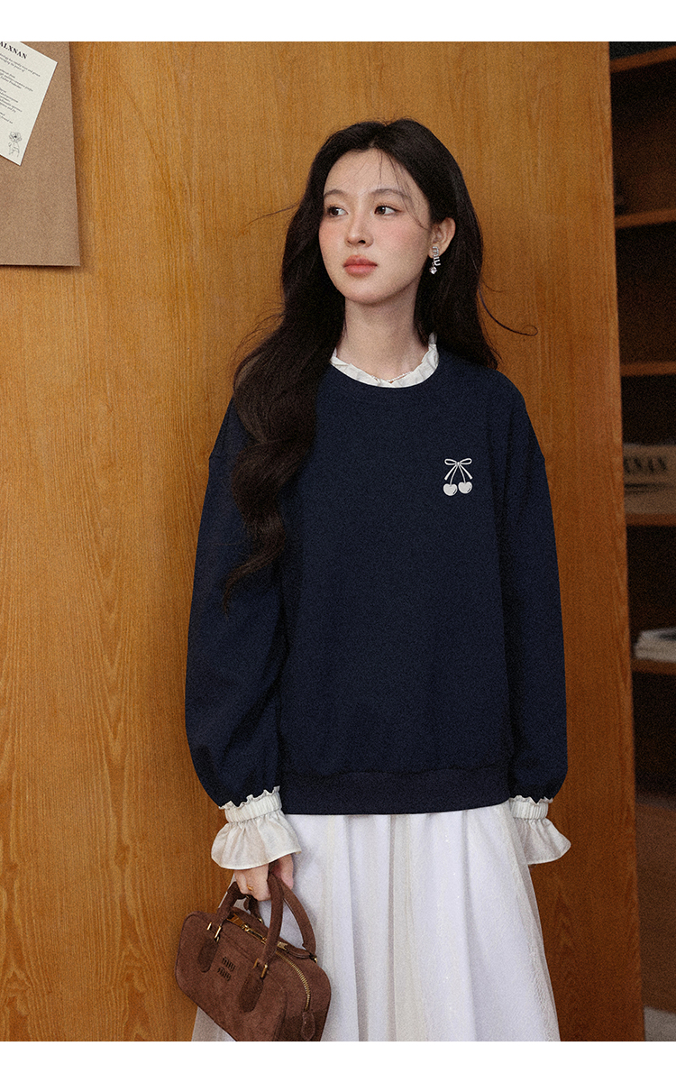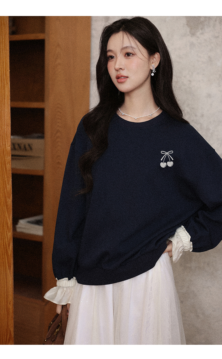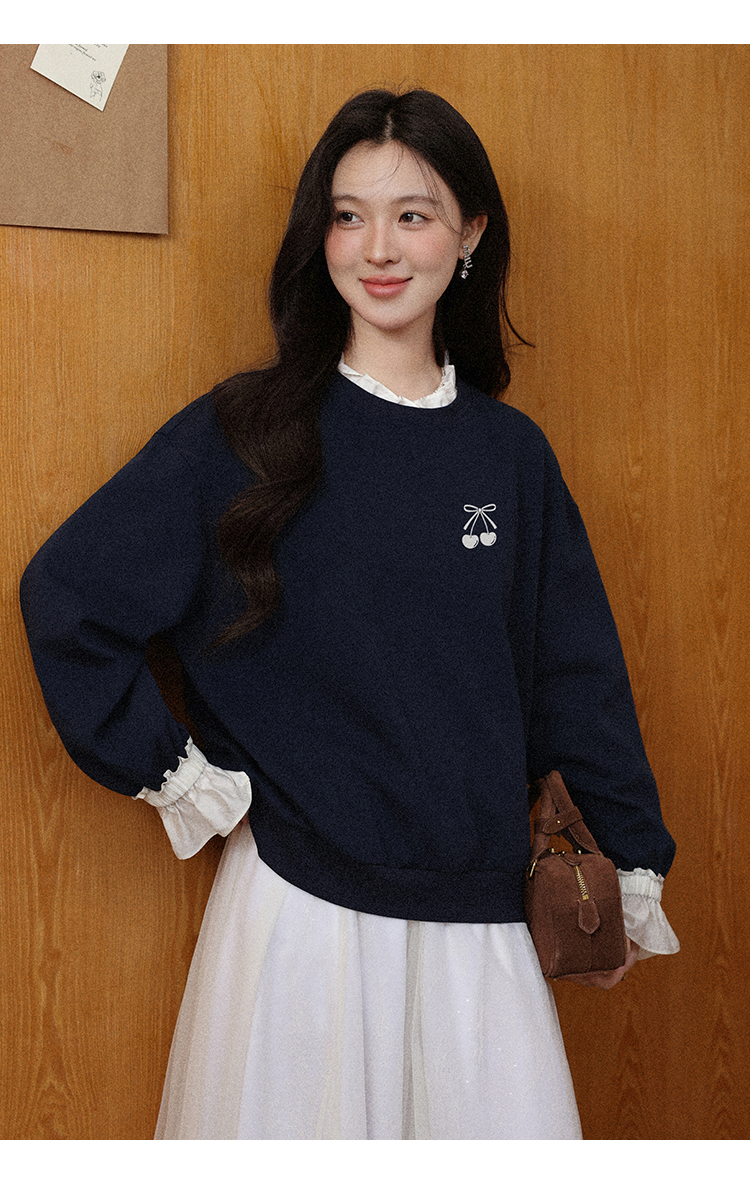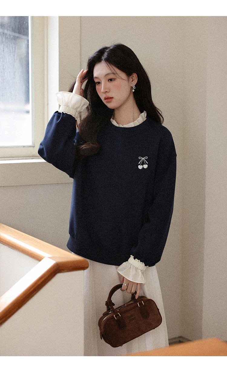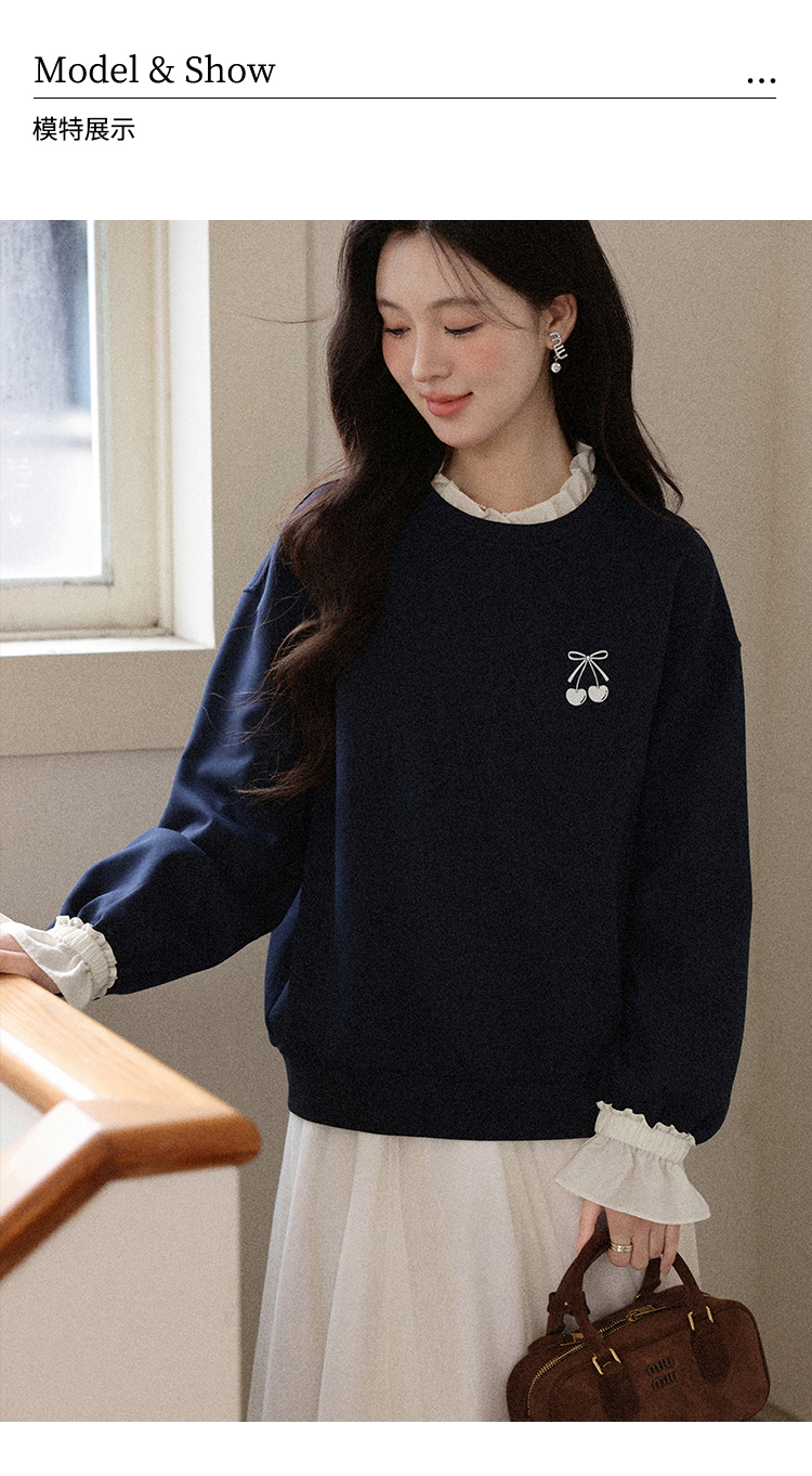 鹿向南「樱桃慕斯」假两件圆领卫衣女秋季宽松慵懒感黑色长袖上衣