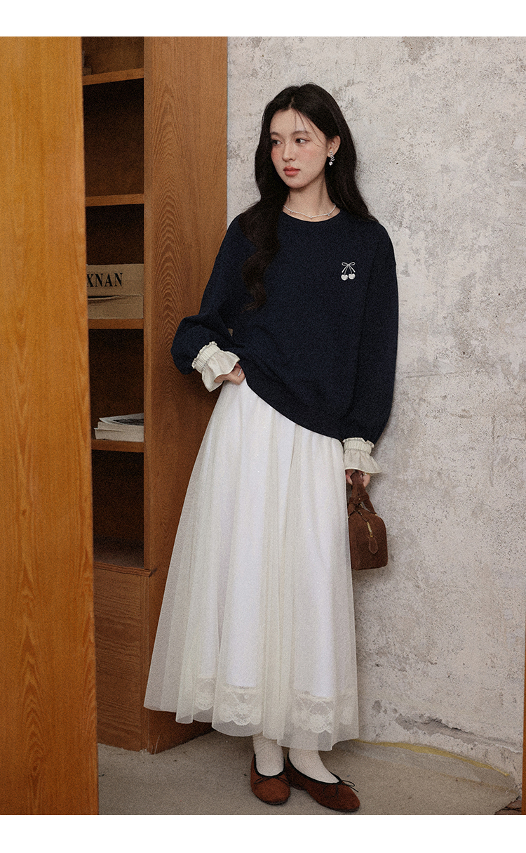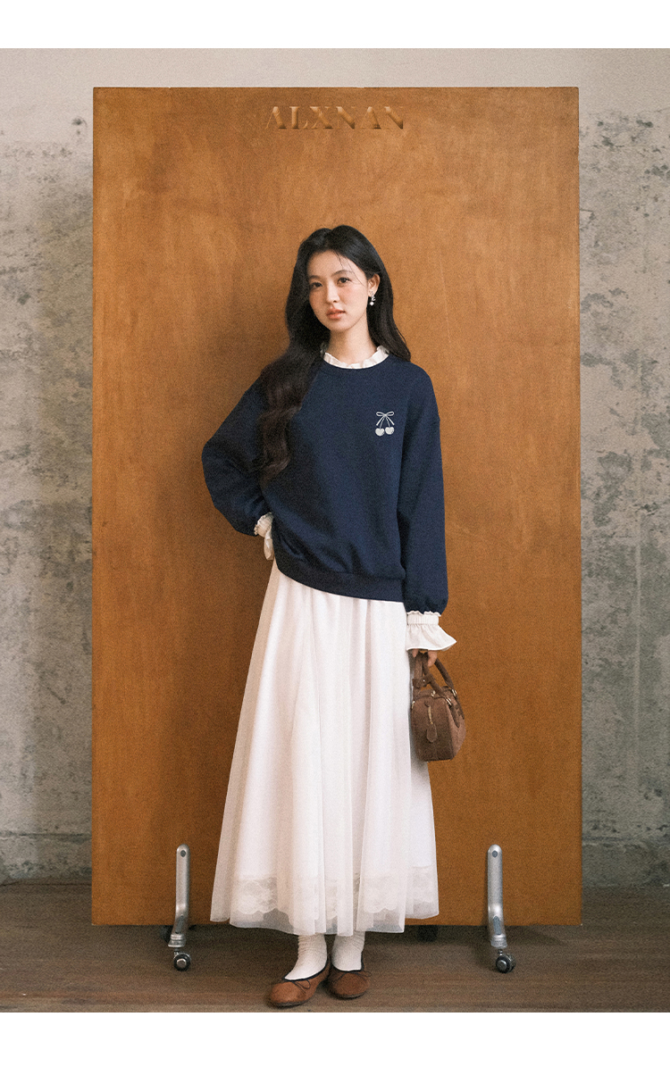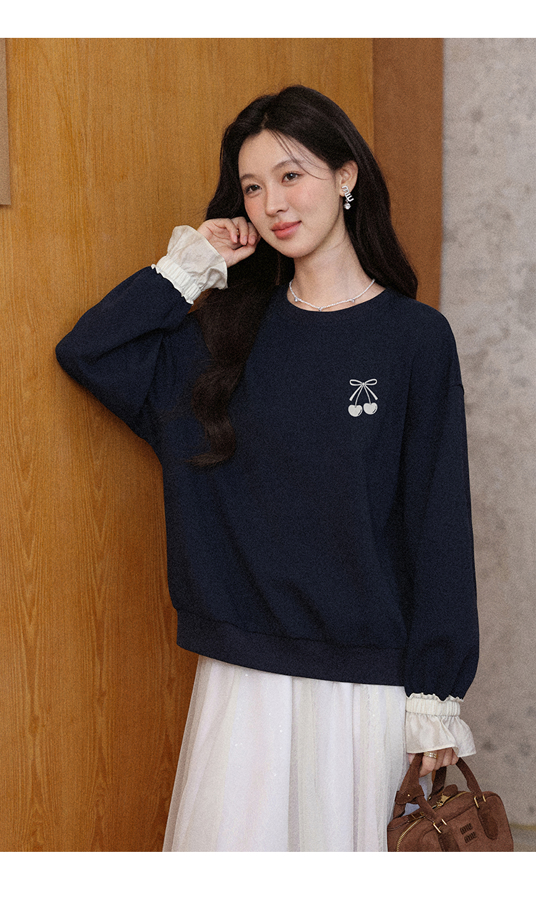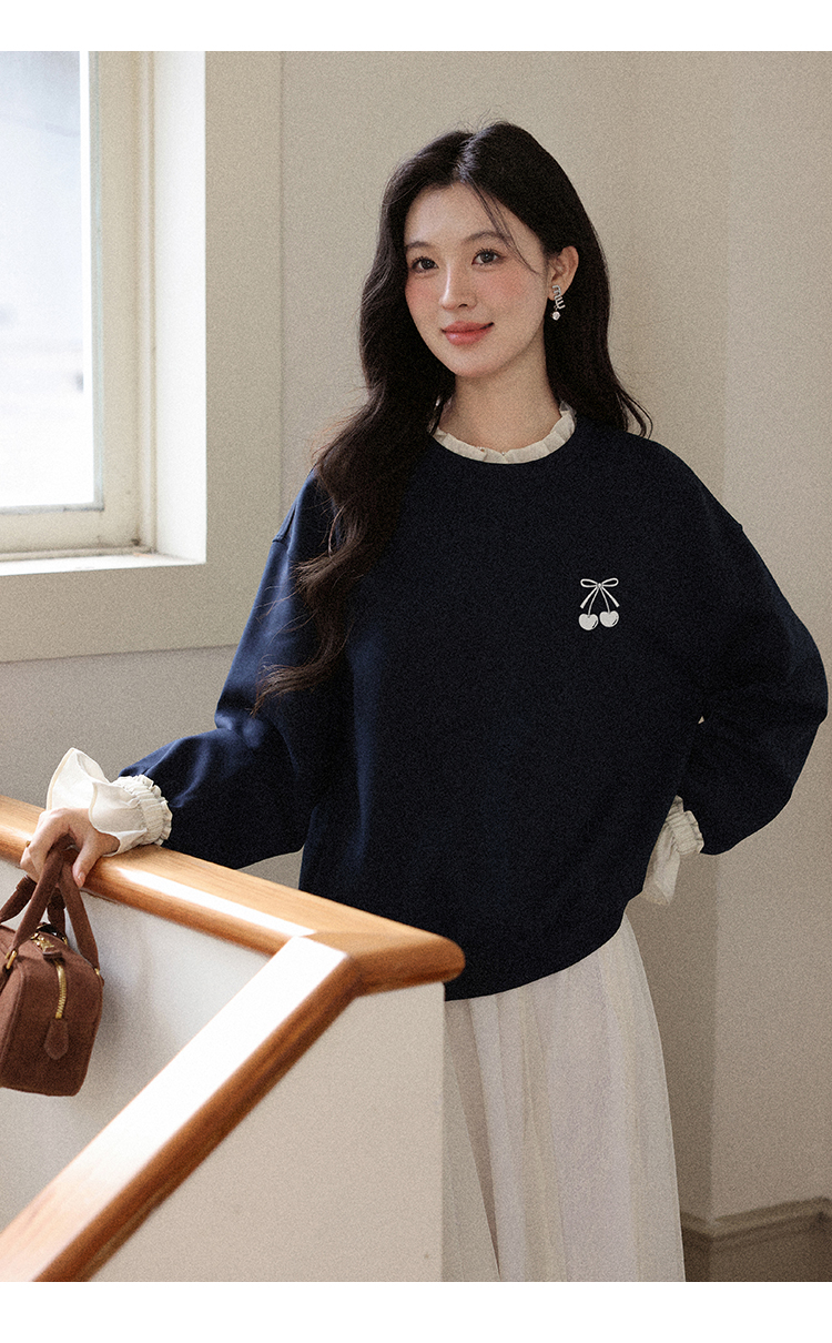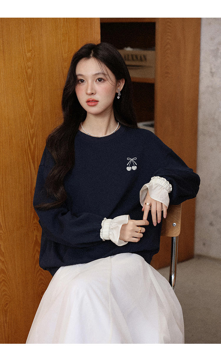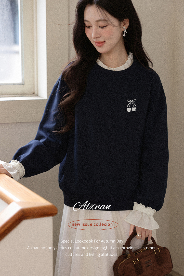 鹿向南「樱桃慕斯」假两件圆领卫衣女秋季宽松慵懒感黑色长袖上衣