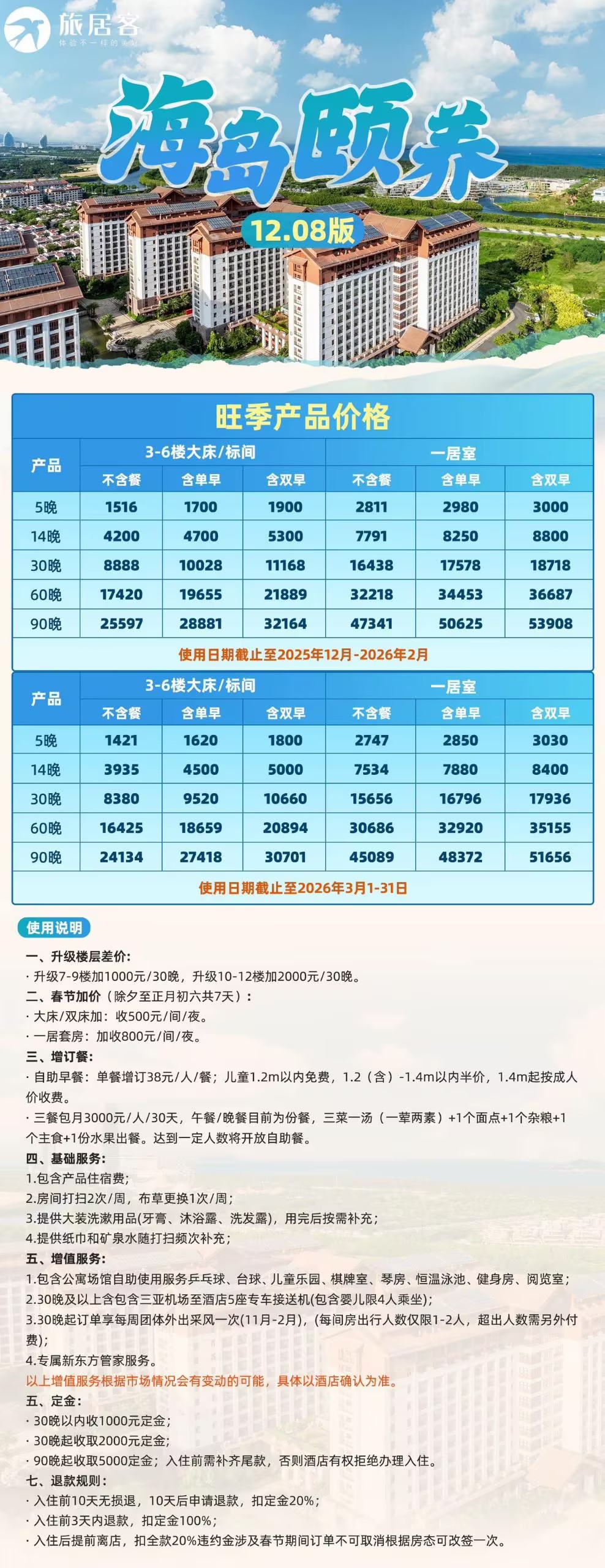1、本价格楼层为3-6楼,升级7-9楼加价1000元/30晚,升级10-12楼2000元/30晚。