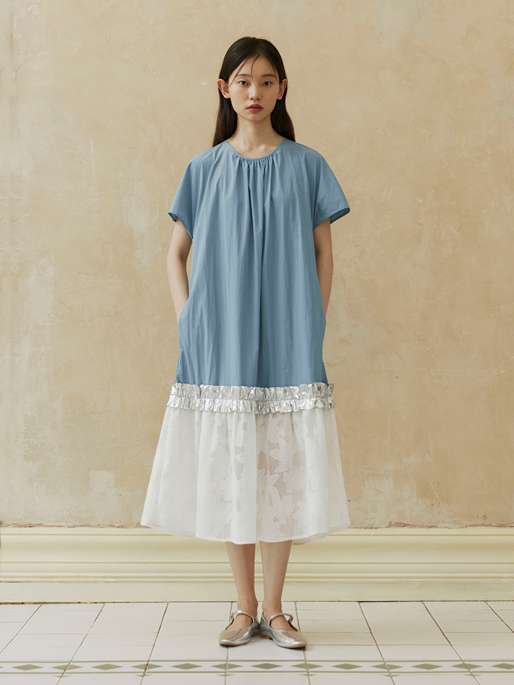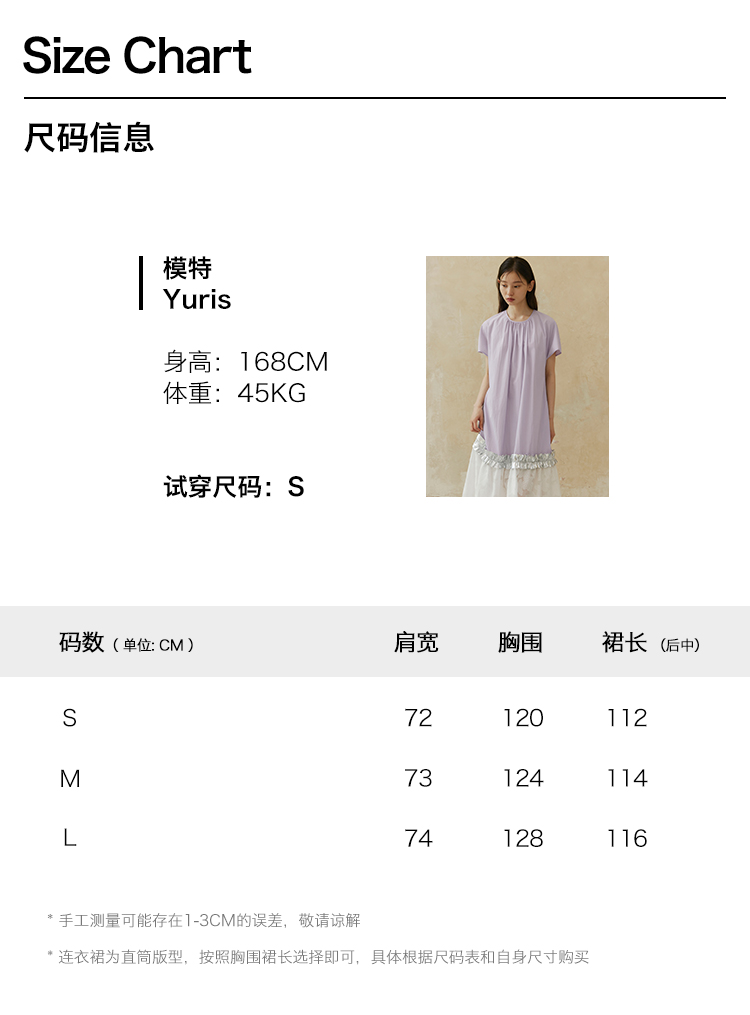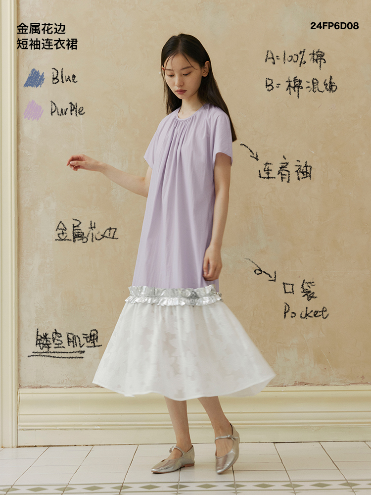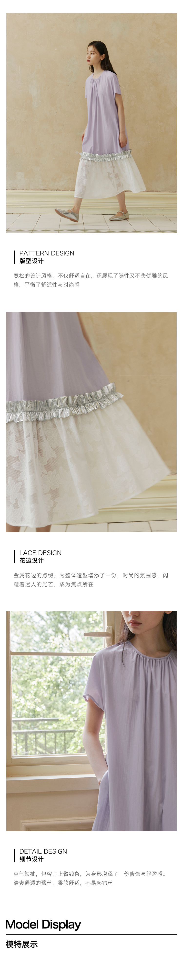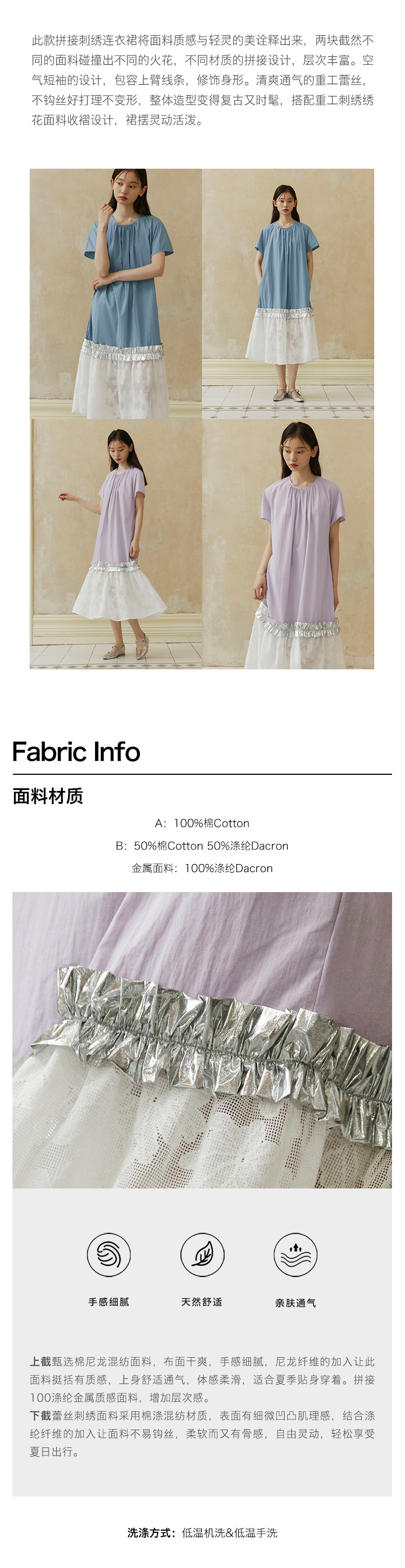 【会员周一口价】ForPoem 现货 24/SS原创设计夏季金属花边蕾丝拼接撞色圆领短袖连衣裙