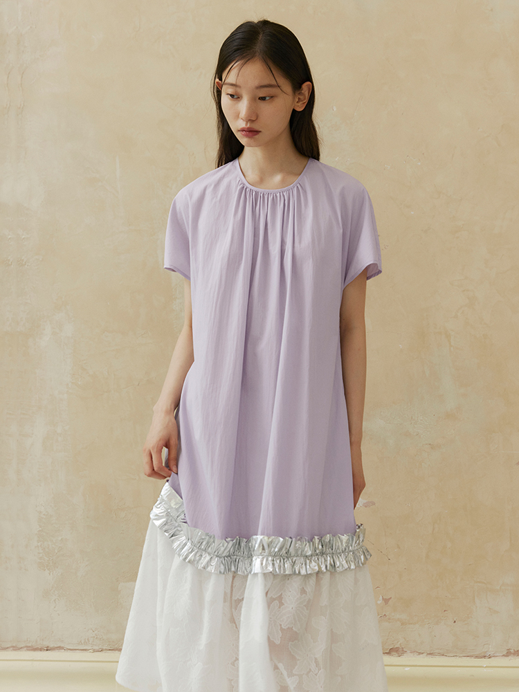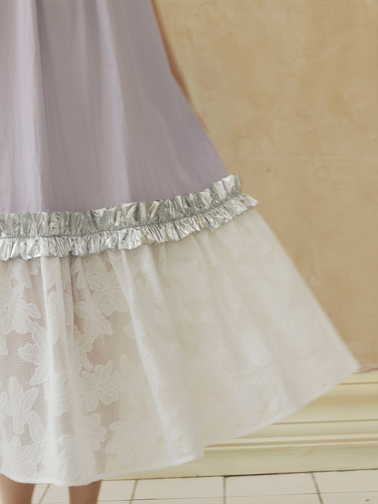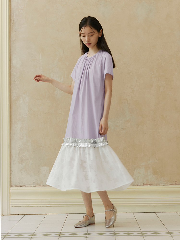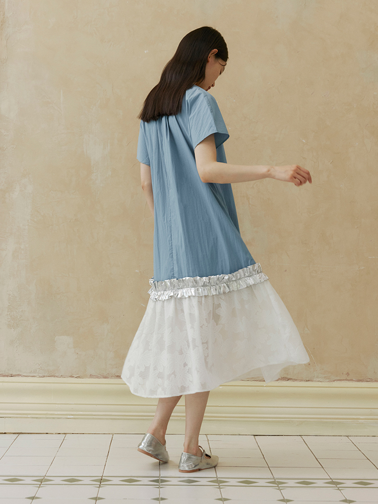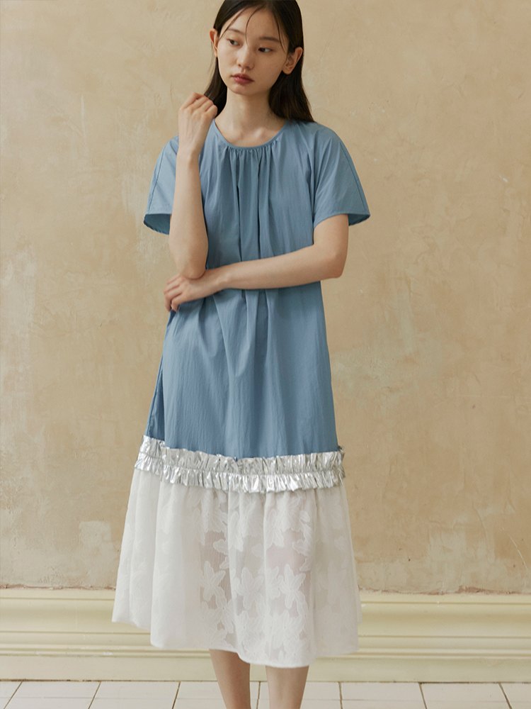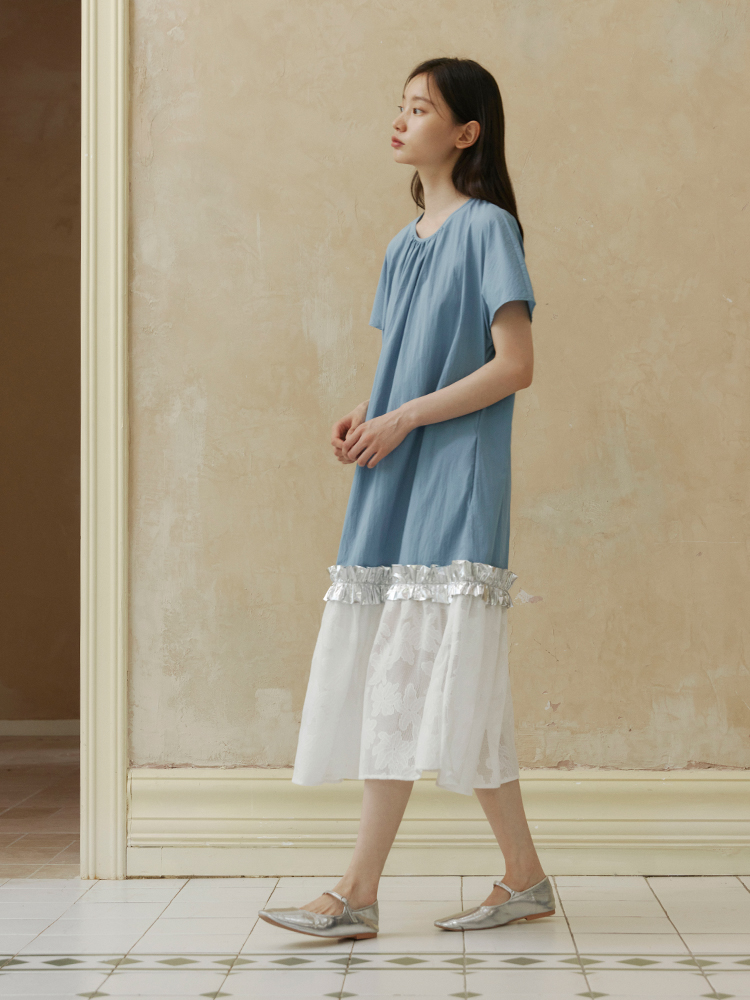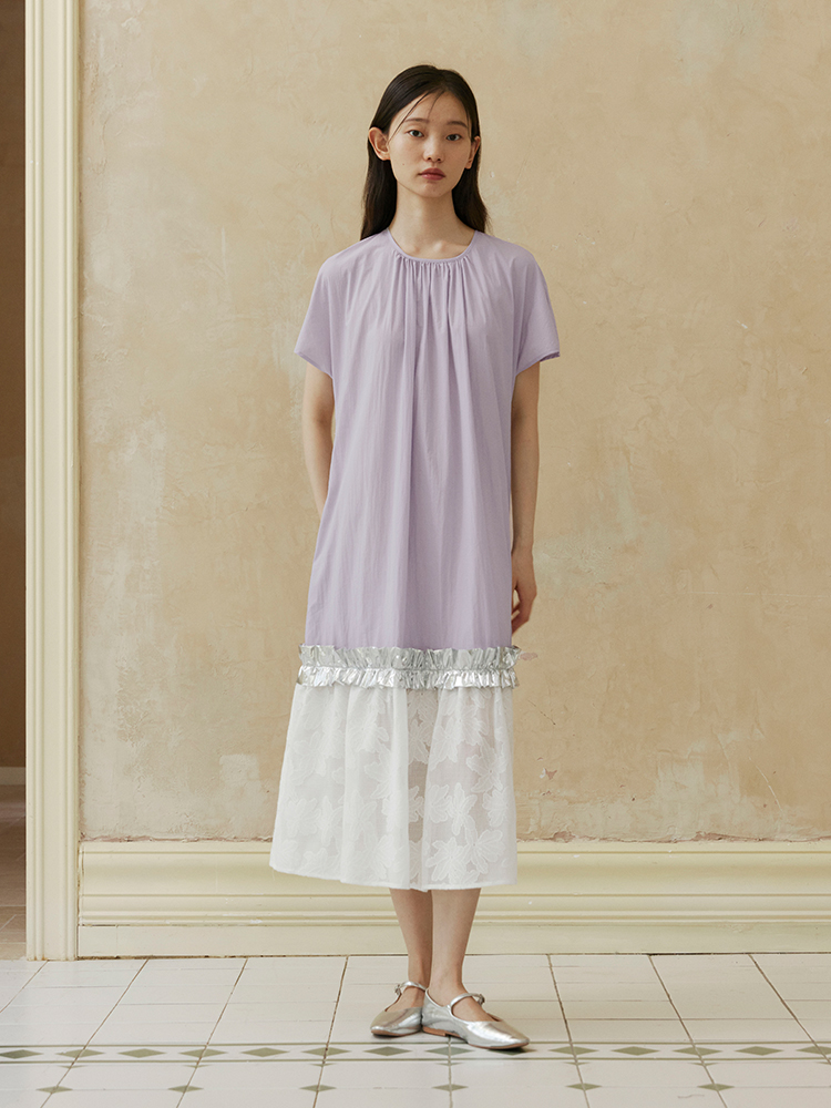 【会员周一口价】ForPoem 现货 24/SS原创设计夏季金属花边蕾丝拼接撞色圆领短袖连衣裙