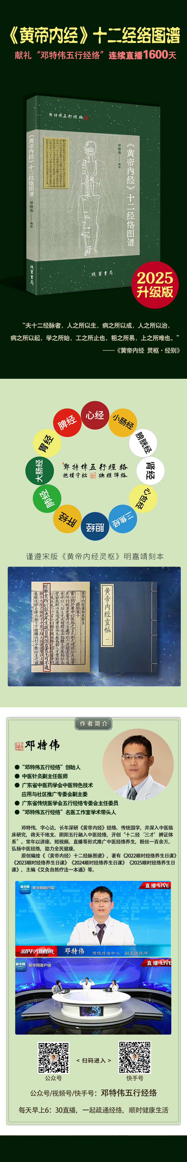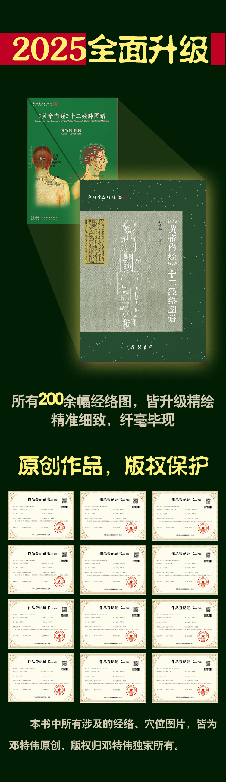 《黄帝内经》十二经络图谱(2025升级版),邓特伟医师编绘,线装书局。谨遵宋版《黄帝内经灵枢》,原创精绘200多幅高清经络图,360余腧穴,精准细致,纤毫毕现。献礼邓特伟五行经络连续直播1600天。