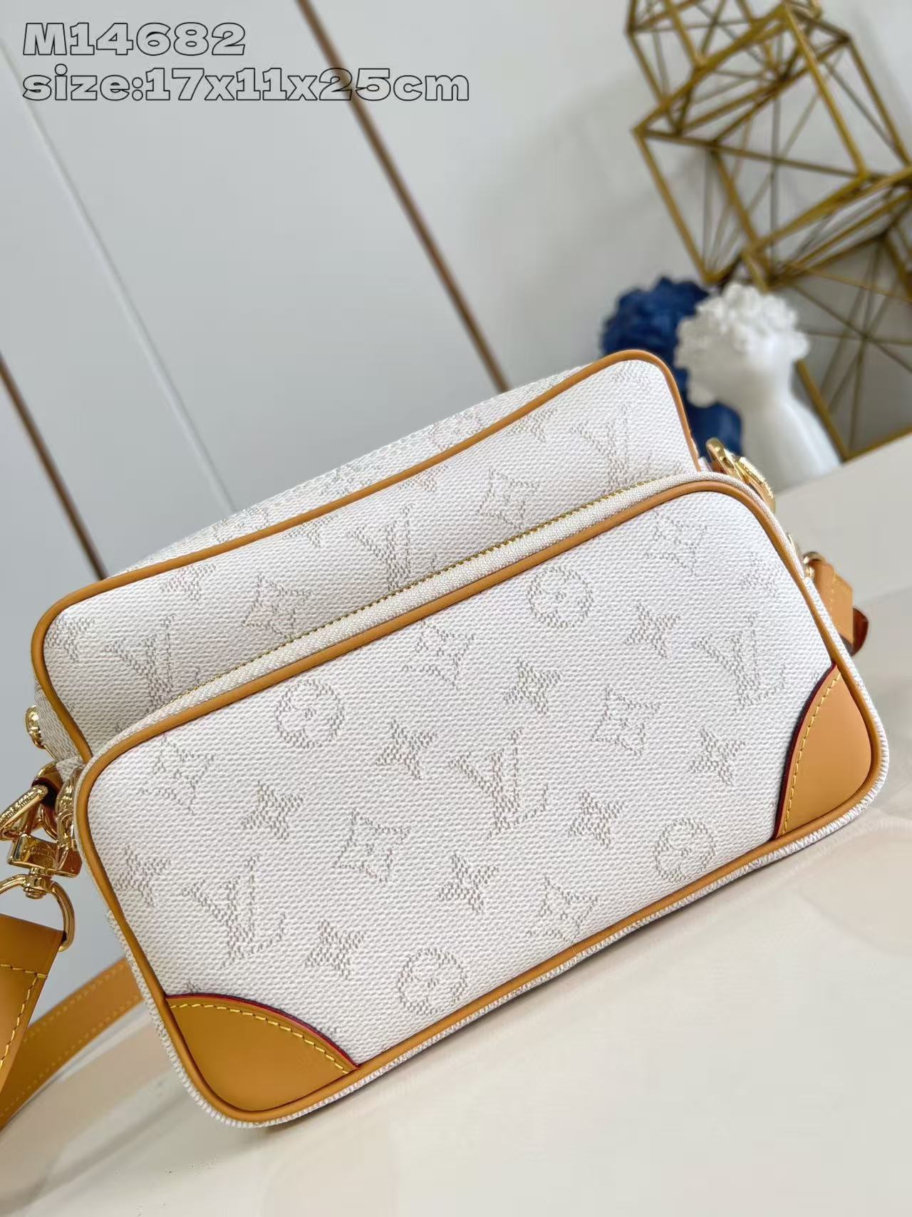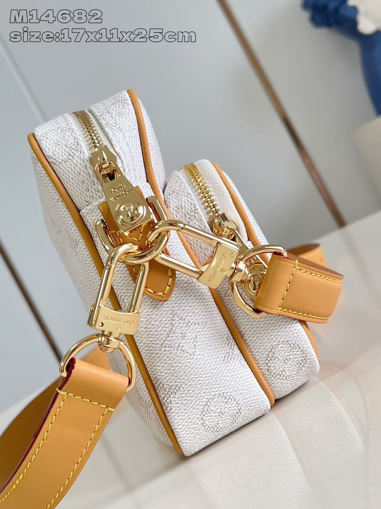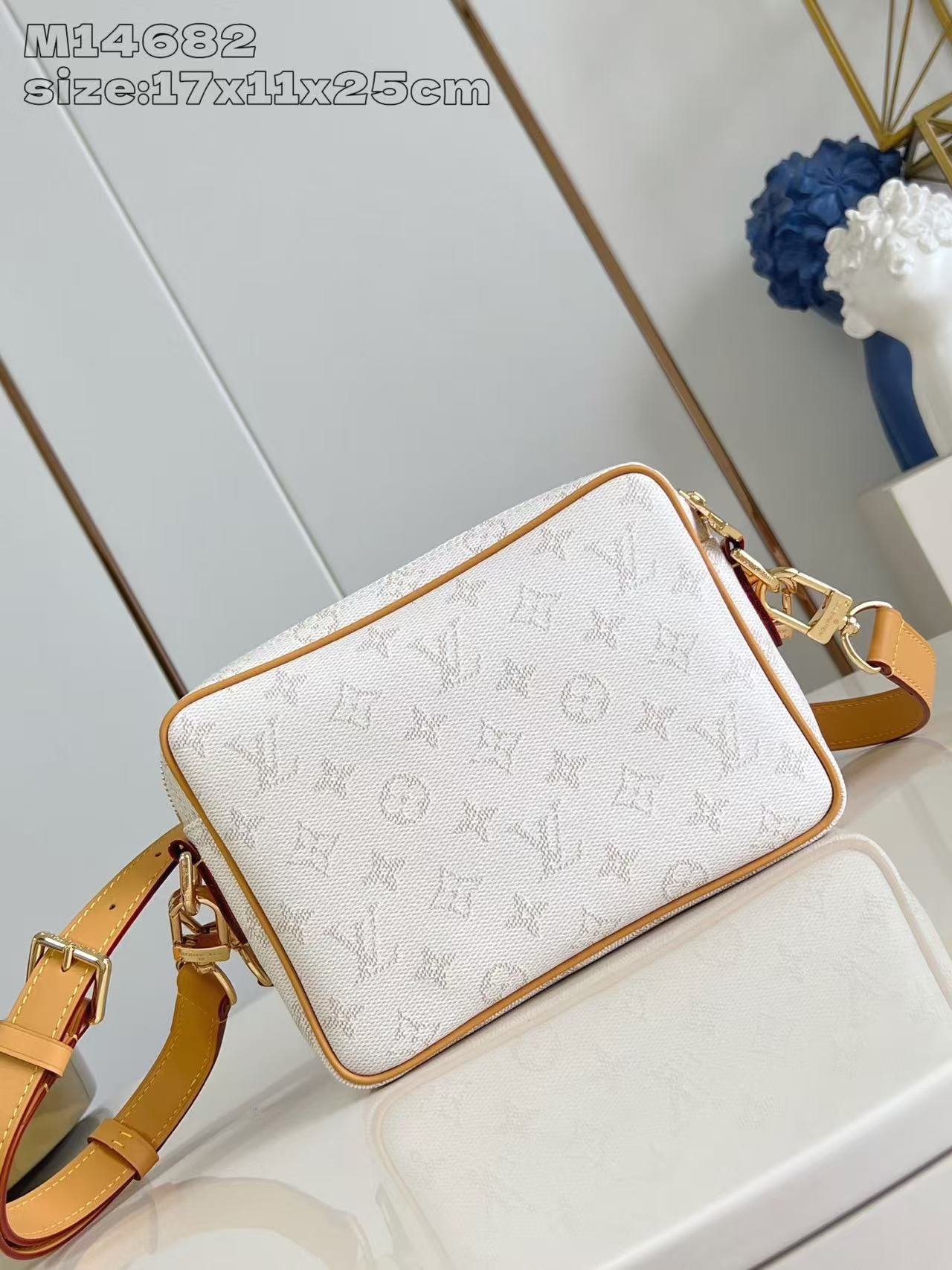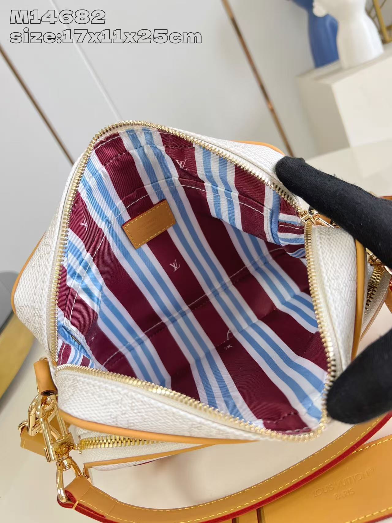 独家实拍 M14682白 】Pharrell Williams 采用 Monogram Heritage 涂层帆布重释 Nil 手袋,以海洋色调演绎复古风潮。紧凑构型囊括拉链主隔层和拉链前袋,俊朗包角回溯制箱传承。顶部手柄和皮革肩带均可拆卸,实现多种背携方式。17.5 x 11 x 25 厘米 (高 x 宽 x 长度)