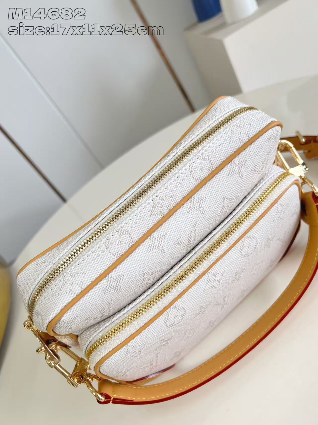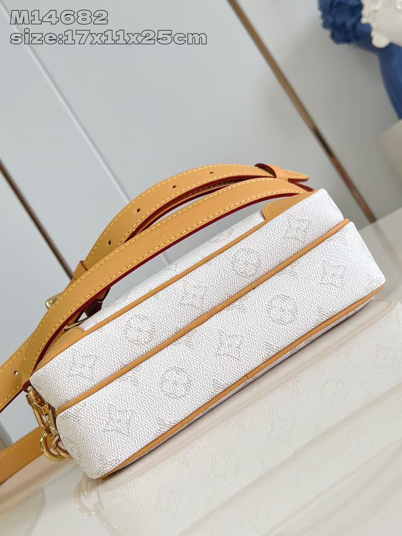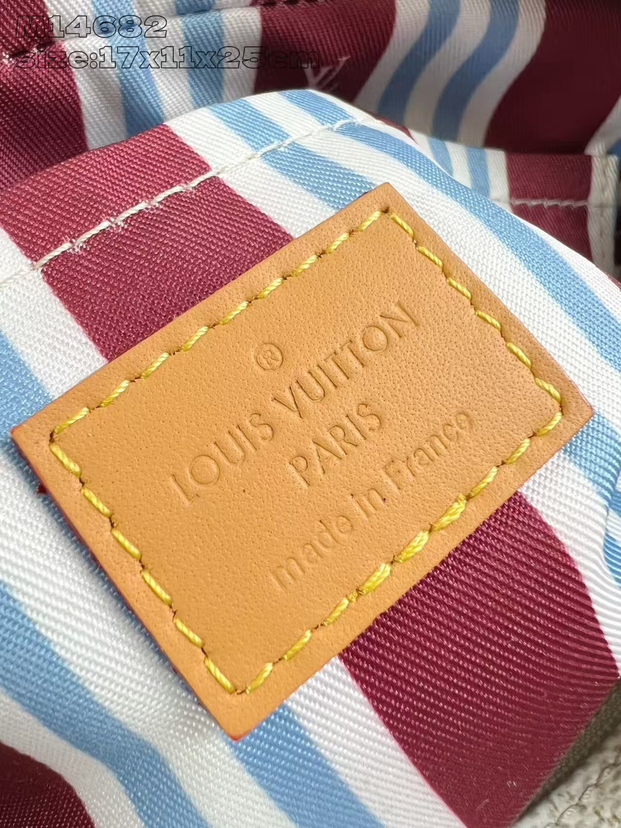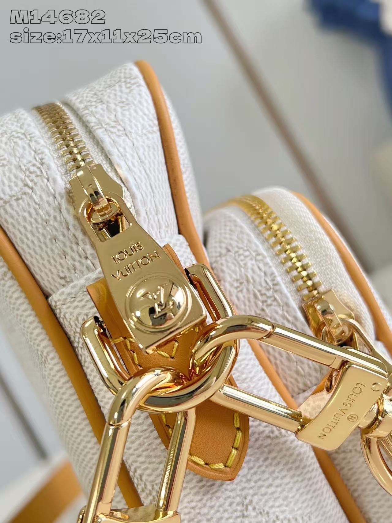 独家实拍 M14682白 】Pharrell Williams 采用 Monogram Heritage 涂层帆布重释 Nil 手袋,以海洋色调演绎复古风潮。紧凑构型囊括拉链主隔层和拉链前袋,俊朗包角回溯制箱传承。顶部手柄和皮革肩带均可拆卸,实现多种背携方式。17.5 x 11 x 25 厘米 (高 x 宽 x 长度)
