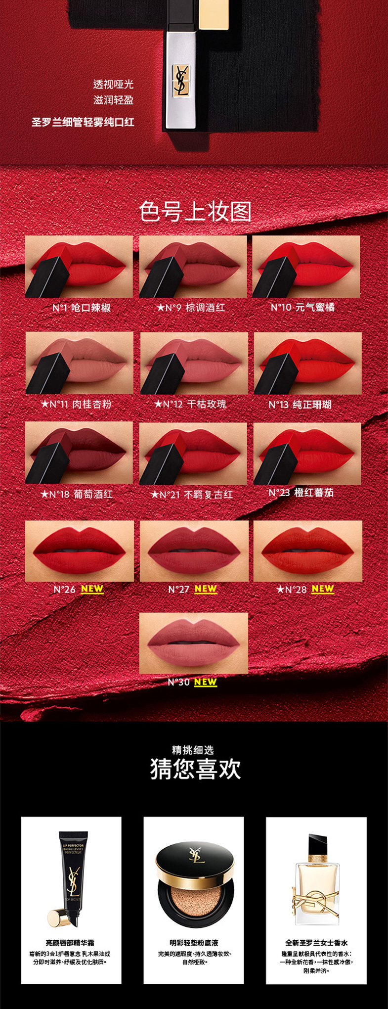 高定vs.随性,一线之间。高定管身设计,高定皮革哑亮妆效。创新方形斜面膏体,精准勾勒唇峰。