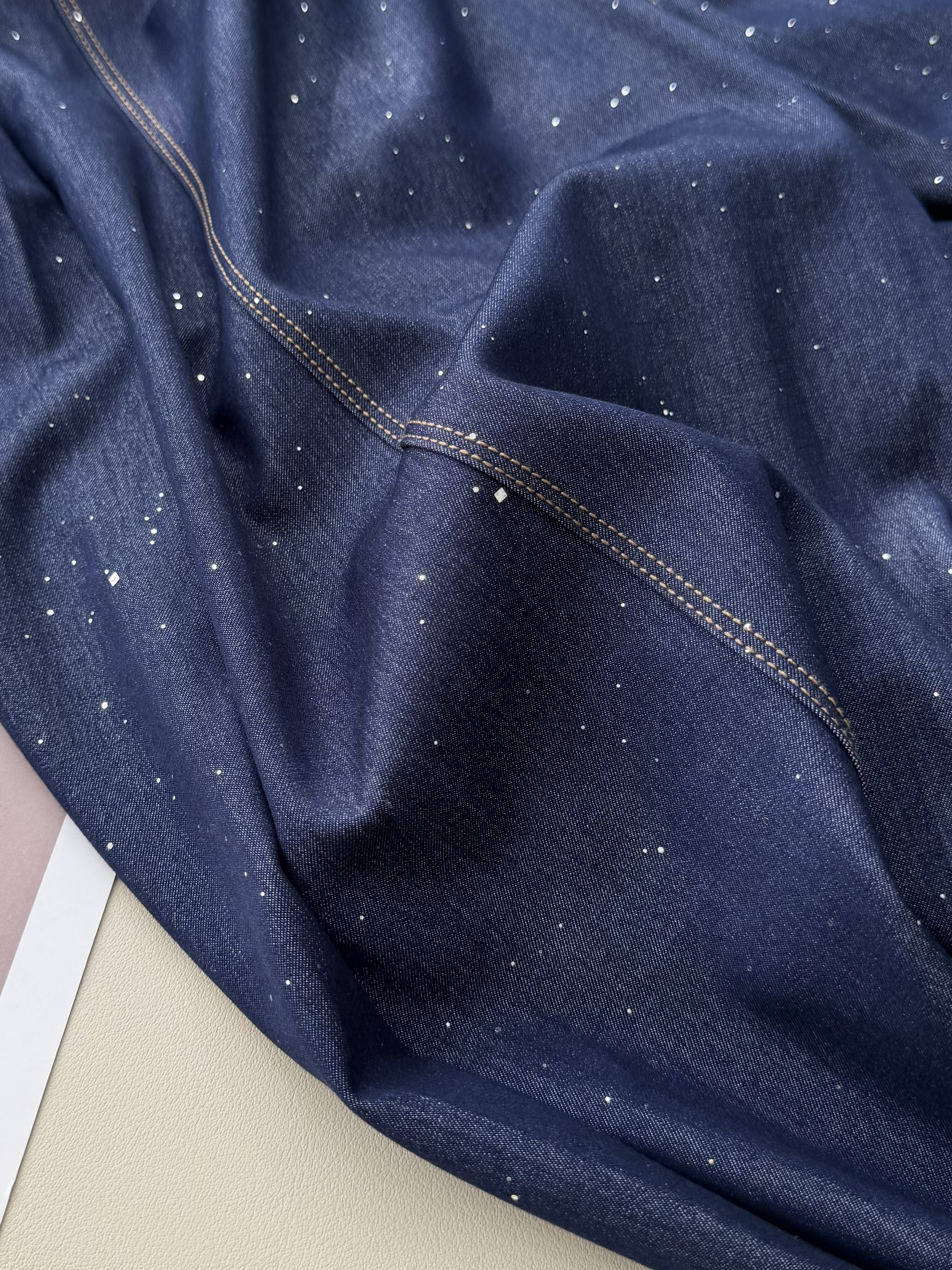意大利进口高温压烫亮片,指甲使劲抠、剪刀边缘刮,亮片牢牢嵌在面料里。