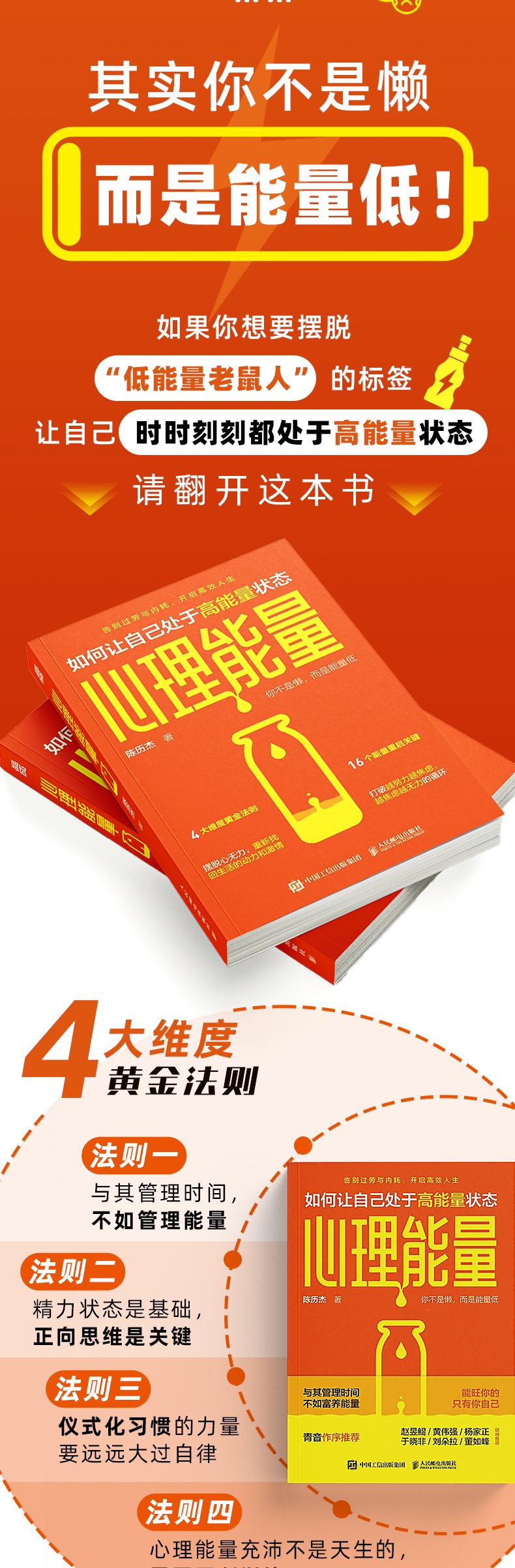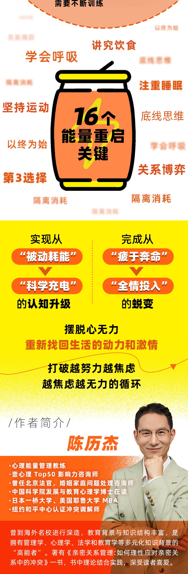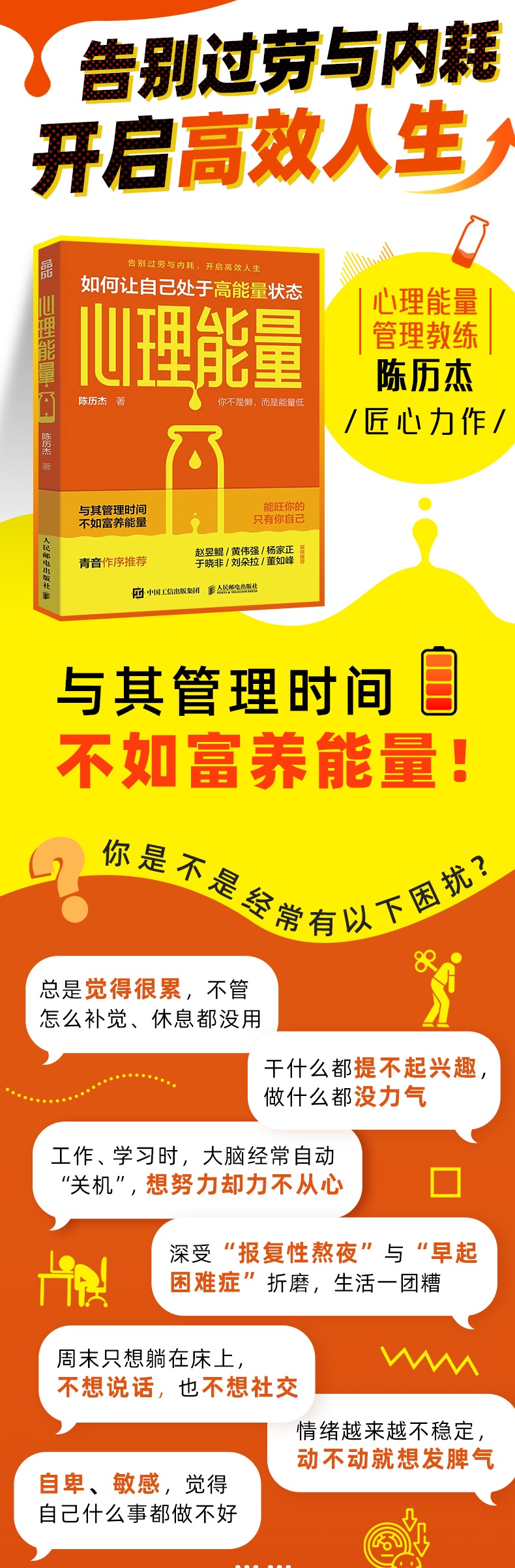 你是不是经常有以下困扰? ·总是觉得很累,不管怎么补觉、休息*没用; ·干什么*提不起兴趣,做什么*没力气; ·工作、学习时,大脑经常自动“关机”,想努力却力不从心; ·深受“报复性熬夜”与“早起困难症”折磨,生活一团糟; ·*只想躺在床上,不想说话,也不想社交; ·情绪越来越不稳定,动不动*想发脾气; ·自卑、敏感,觉得自己什么事*做不好…… 你时常自责,觉得自己不积极、不上进、太懒了。其实,你不是懒,而是能量太低了!生活的压力和长期的疲惫感使你的身体透支,让你长期陷于低能量的沼泽,难以抽身。当你感觉力不从心、筋疲力尽时,*要及时给自己“充电” 本书作者是横跨法学、管理学与心理学领域的能量管理*,基于多年咨询经验与跨学科研究,提出“能量管理优于时间管理”的核心观点。书中融合心理学*理论、真实案例与可操作工具,直击现代人“能量枯竭”的痛点;依据能量管理4大黄金法则、16 个能量重启关键,帮助读者摆脱过劳和内耗,实现从“被动耗能到“科学充电”的认知升级,*终完成从“疲于奔命”到“全情投入”的蜕变。 如果你渴望在快节奏的生活中稳住身心、*成长,这本书将为你提供一套从理论到实践的完整能量升级方案,让你在充满不确定性的时代,重新找回生活的动力和激情。