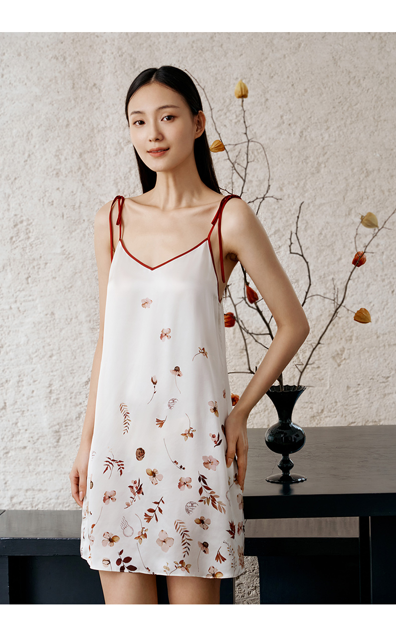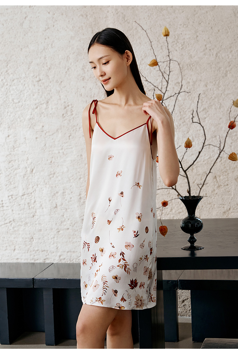 【印上秋天】100%桑蚕丝吊带睡裙V领蝴蝶肩带印花真丝睡衣女金三塔 YSFEC302
