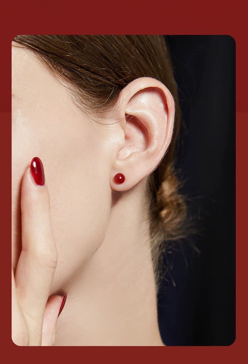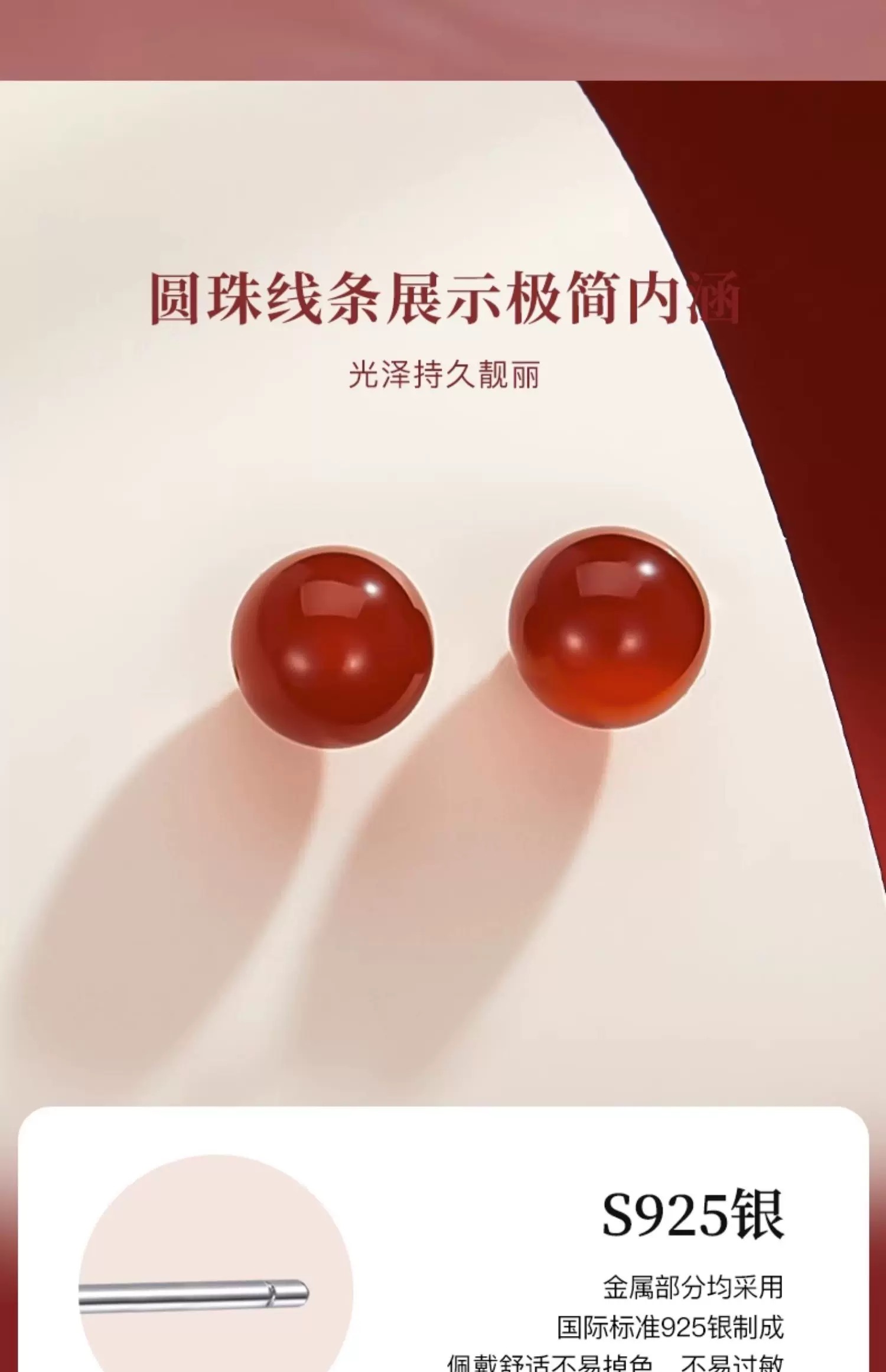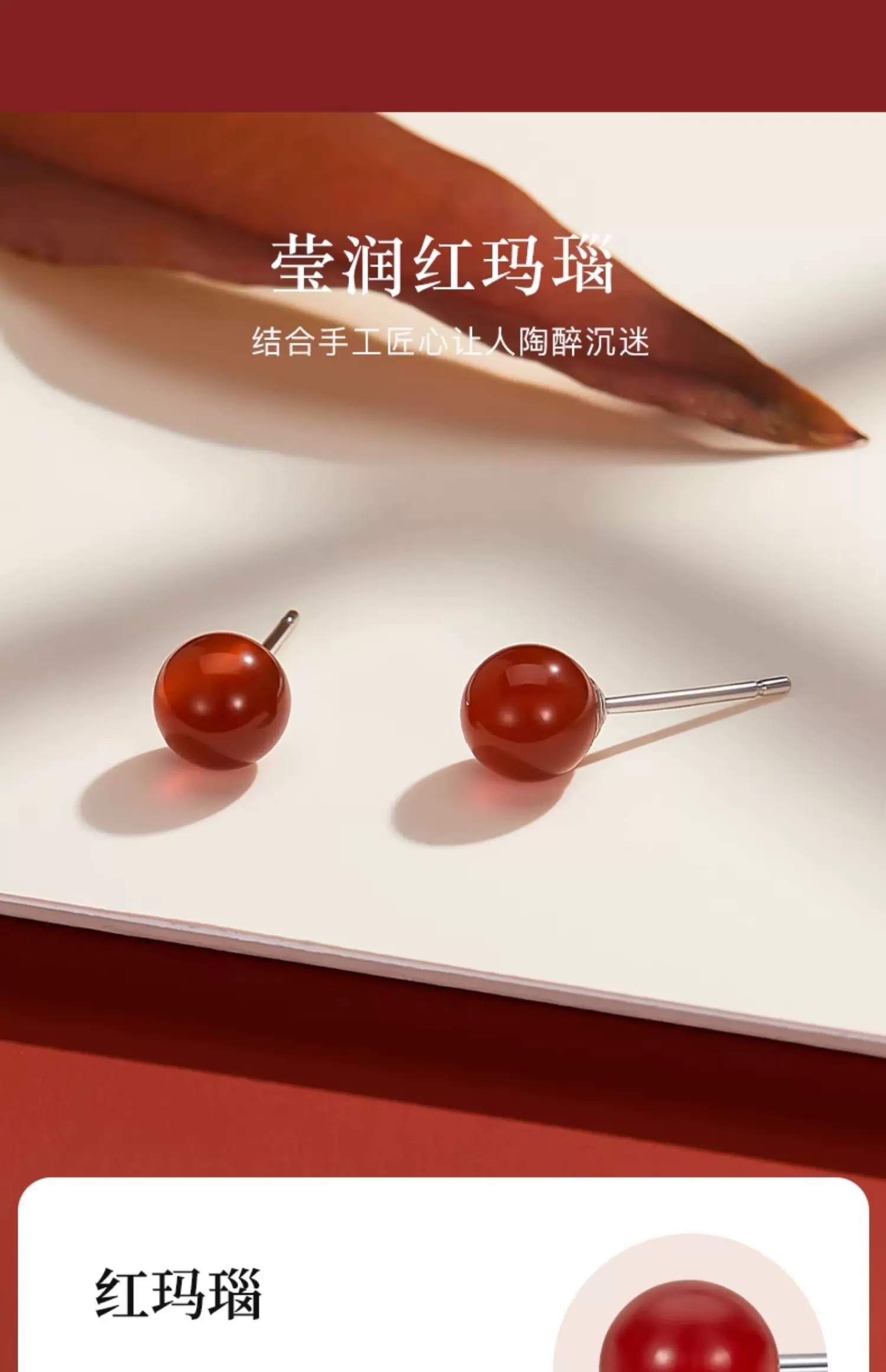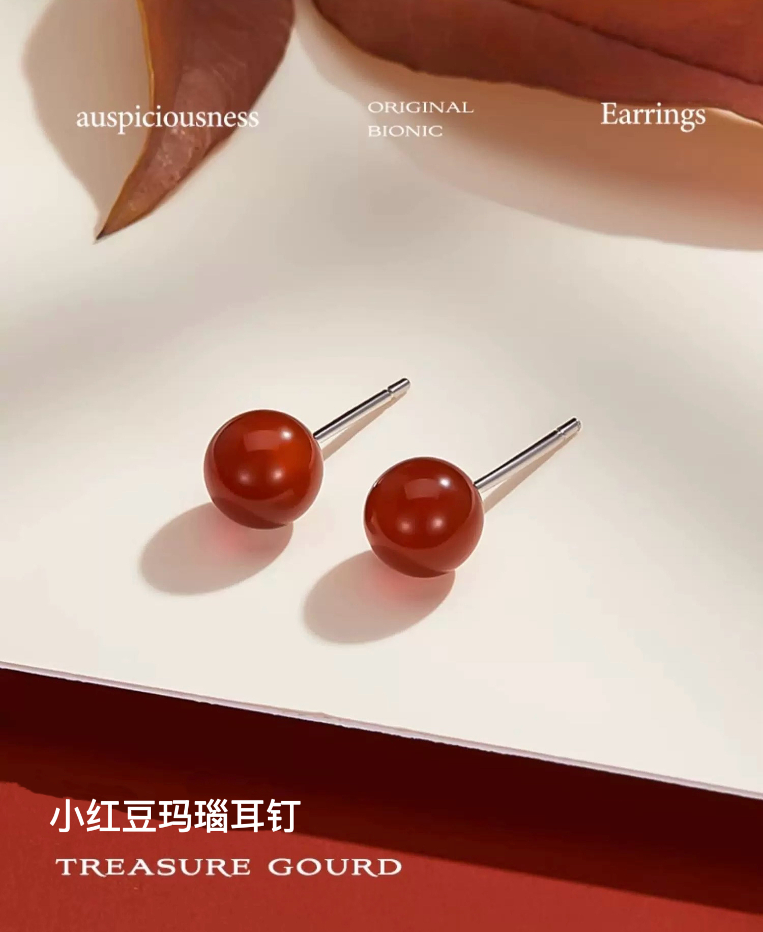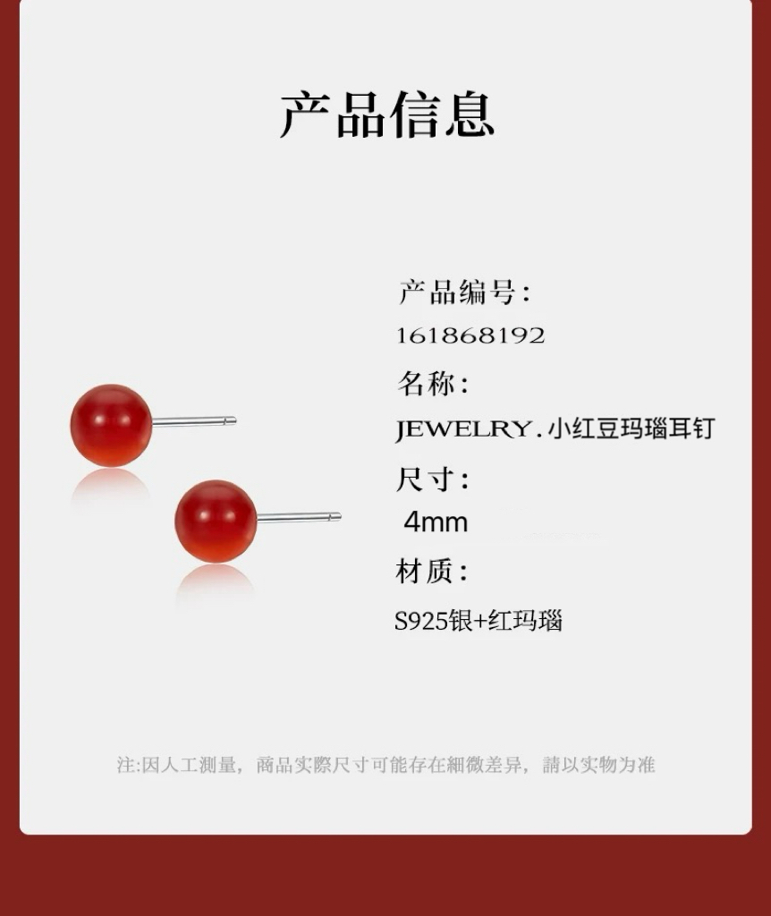 【JEWELLERY 小红豆玛瑙耳钉】4MM一对,纯银通体,玛瑙材质,晶莹剔透,优雅永存。