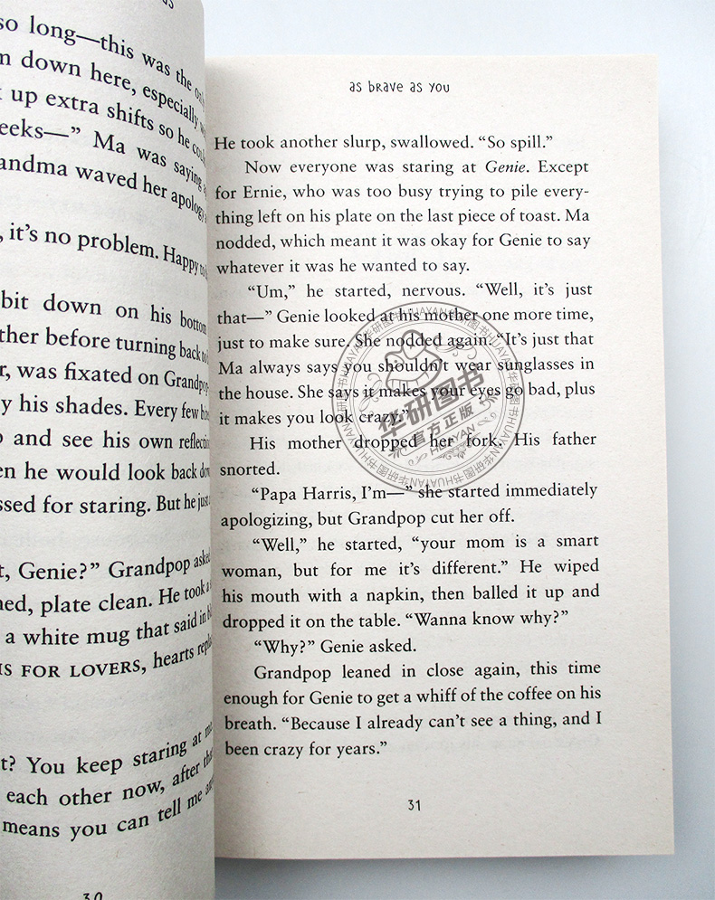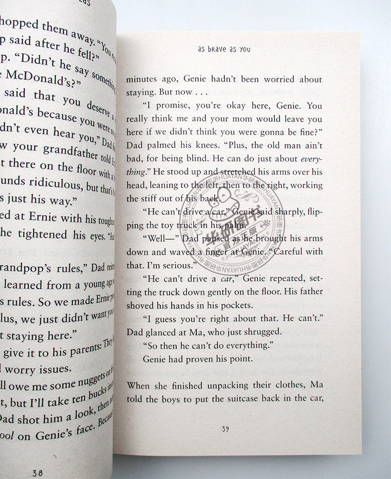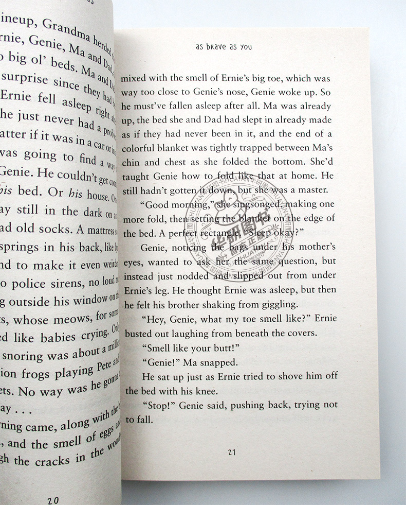 As Brave As You《勇敢如你》是纽约时报畅销书作家杰森·雷诺兹写的一部小说,讲述了Genie、Ernie两兄弟为了证明自己的勇敢,来到乡下与自己的“盲人”爷爷体验生活,在探索勇气小屋、决定是否学习枪法的过程中,渐渐地明白了勇敢之真谛的故事。本书故事情节性强,语言简单易懂,适合孩子们阅读,也可作为亲子读物使用。