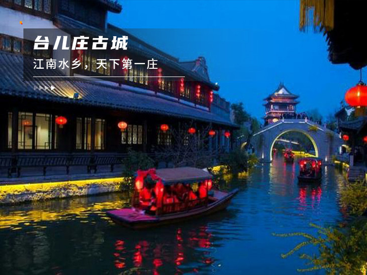 台儿庄古城位于京杭大运河的中心点,是著名的江北水乡、运河古城,也是二战遗存最多的抗战名城。城内留存的明清时期的古运河,是中国唯一一座东方古水城,可以乘舟遍游全城。丰富的建筑风格极具特色,既能看到鲁南民居、北方大院,又能看到徽派建筑、客家建筑。古城占地2平方公里,11个功能分区、8大景区和29个景点,是中国国内规模最大的古城,