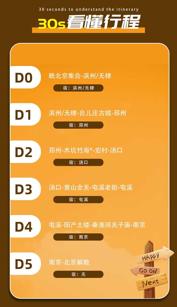 2)门票:台儿庄古城118元,黄山门票自行预约,宏村团体93元(门市104元),木坑竹海团体35元(门市40元),阳产土楼门票+小交通30元;以上费用供参考,以景区规定为准。以上门票供参考,以景区当天实际为准。