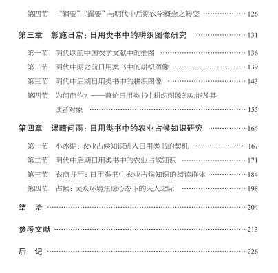 本书在系统收集明代中后期各种版本的日用类书,厘清其撰者、文献来源及版本翻刻之过程的基础上,以明代书坊刊刻的诸种日用类书如《便民图纂》《致富奇书》《万宝全书》等为经,以其中的耕作、蚕桑、树艺、占候、牧养等各门具体农学知识为纬,从知识社会学的视角来剖析日用类书中的农学知识,考察促使其产生与发展的社会背景,编纂者如何根据民间社会的需求将它们进行采集、加工与“编码”,这些农学知识在之前已有知识基础上做了何种创新,以及它们的读者受众群体是谁等重点问题。目的是分析日用类书与传统农书中的农学知识在知识获取、生成、传播与应用等方面的不同之处,以及探究明代中后期社会转型与农学知识书写之间的相互关系。