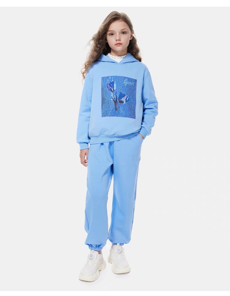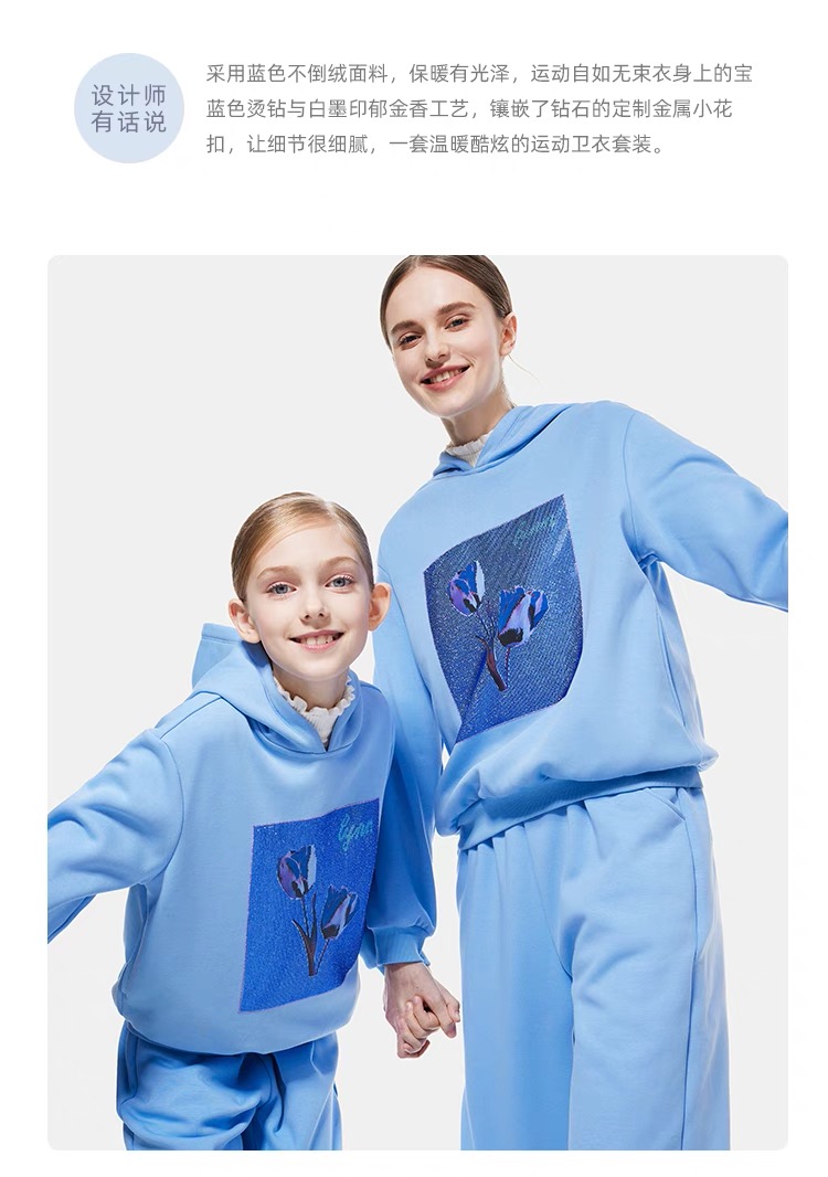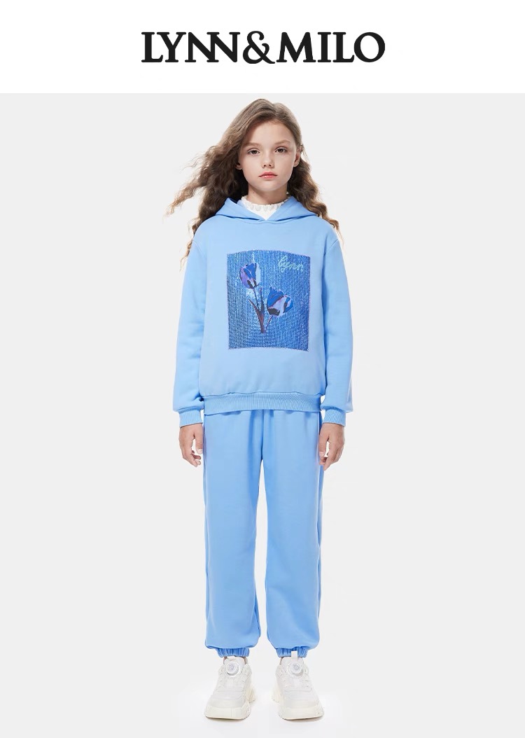 【春上新】8楼琳麦罗 LYNN&MILO 蓝色不倒绒白墨印花烫钻连帽卫衣套装