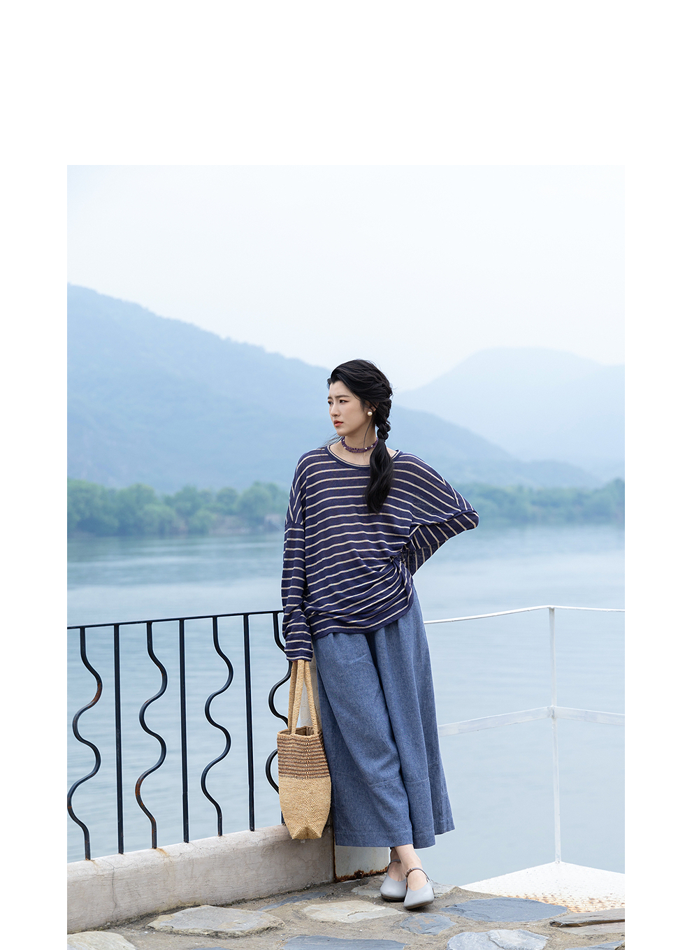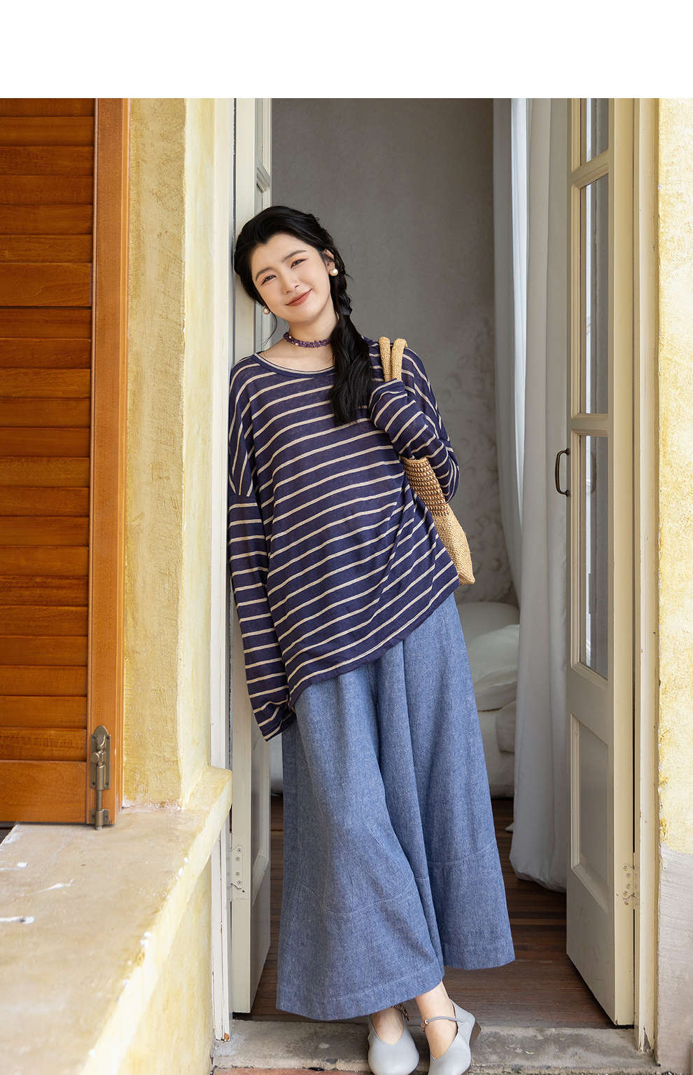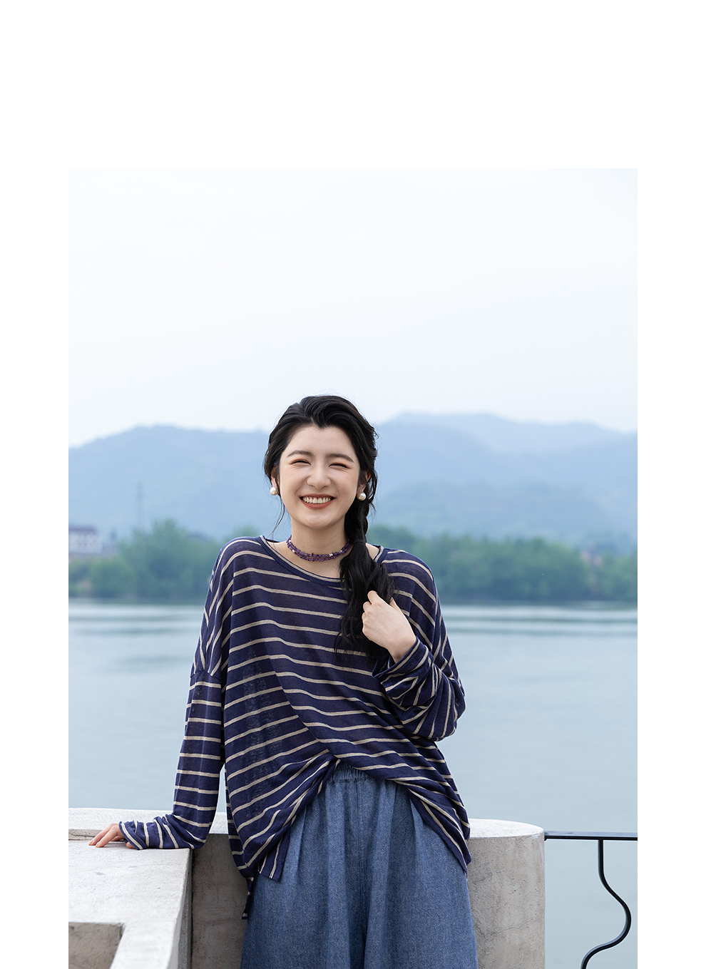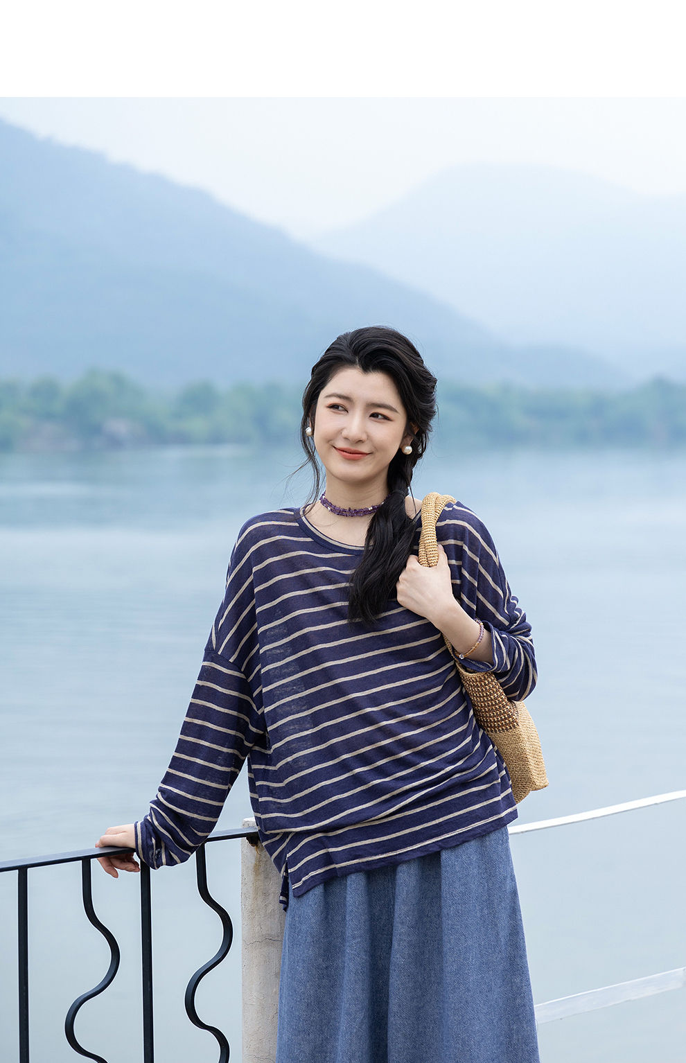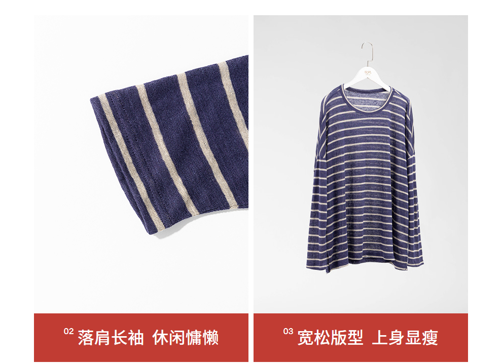 绽放旅行女装333朵【海街日记】亚麻针织条纹落肩长袖宽松防晒T恤