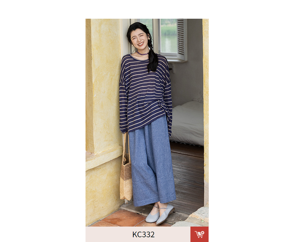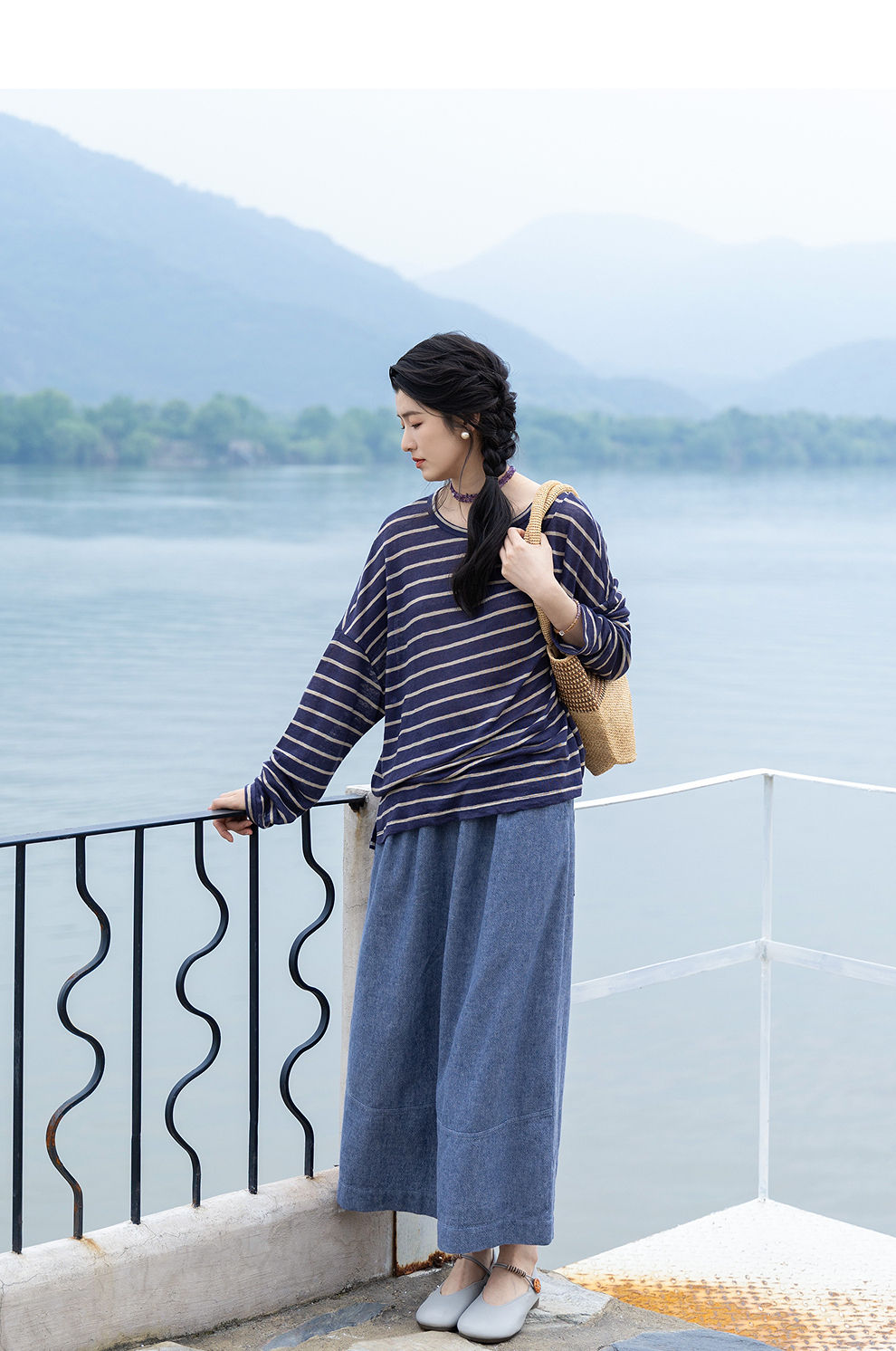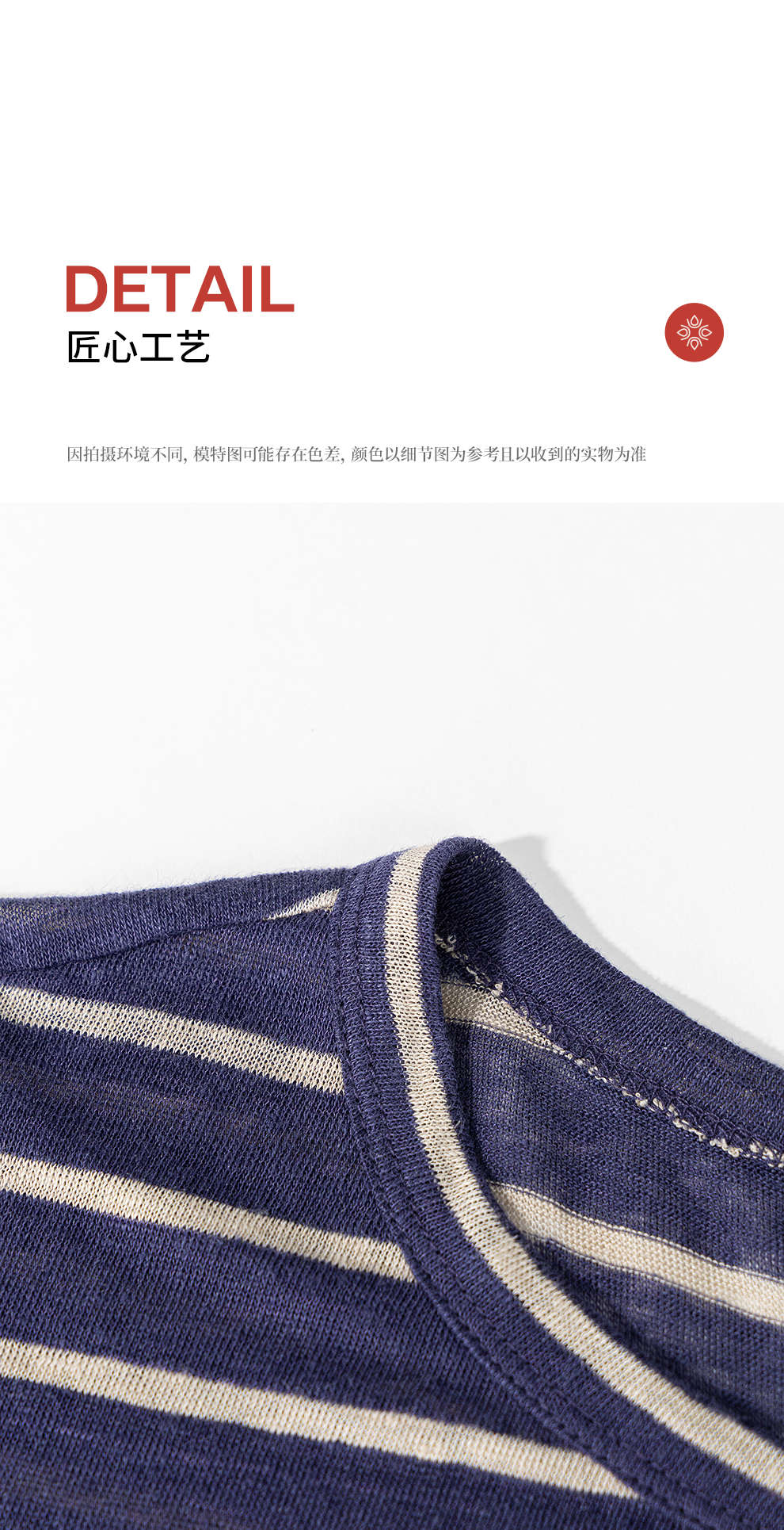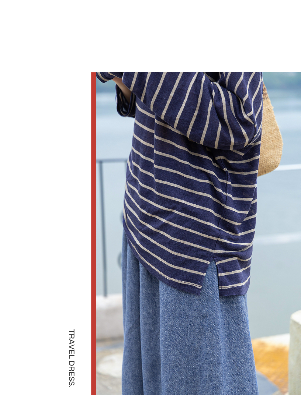 绽放旅行女装333朵【海街日记】亚麻针织条纹落肩长袖宽松防晒T恤