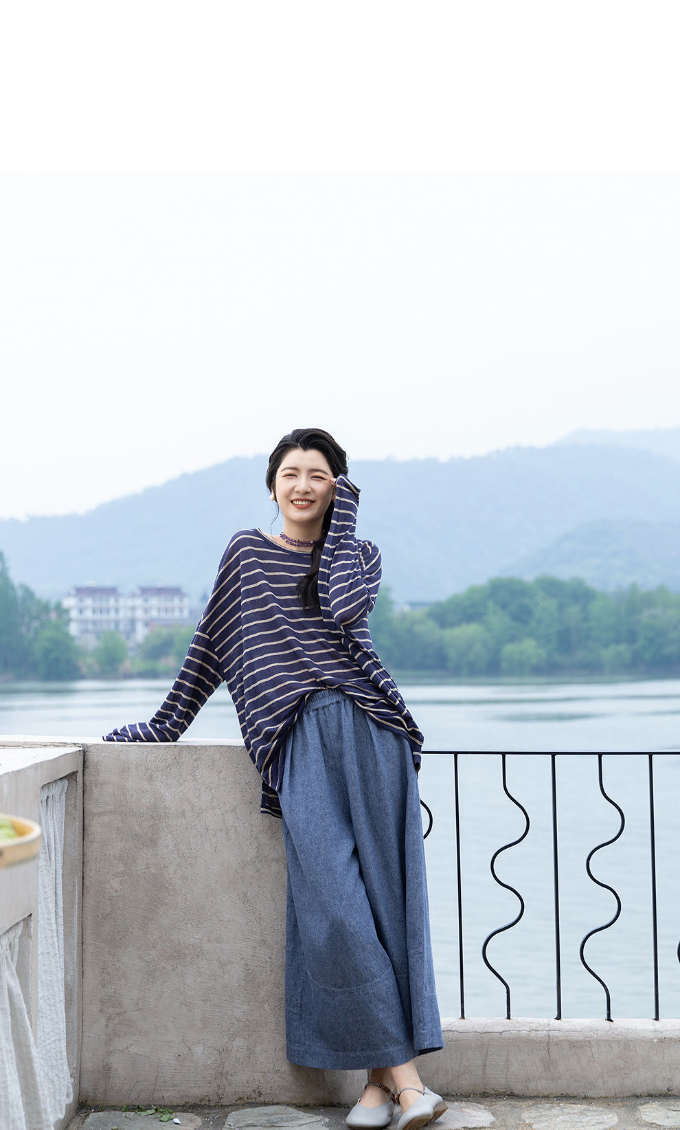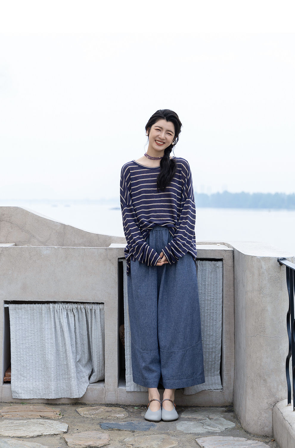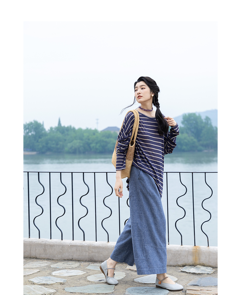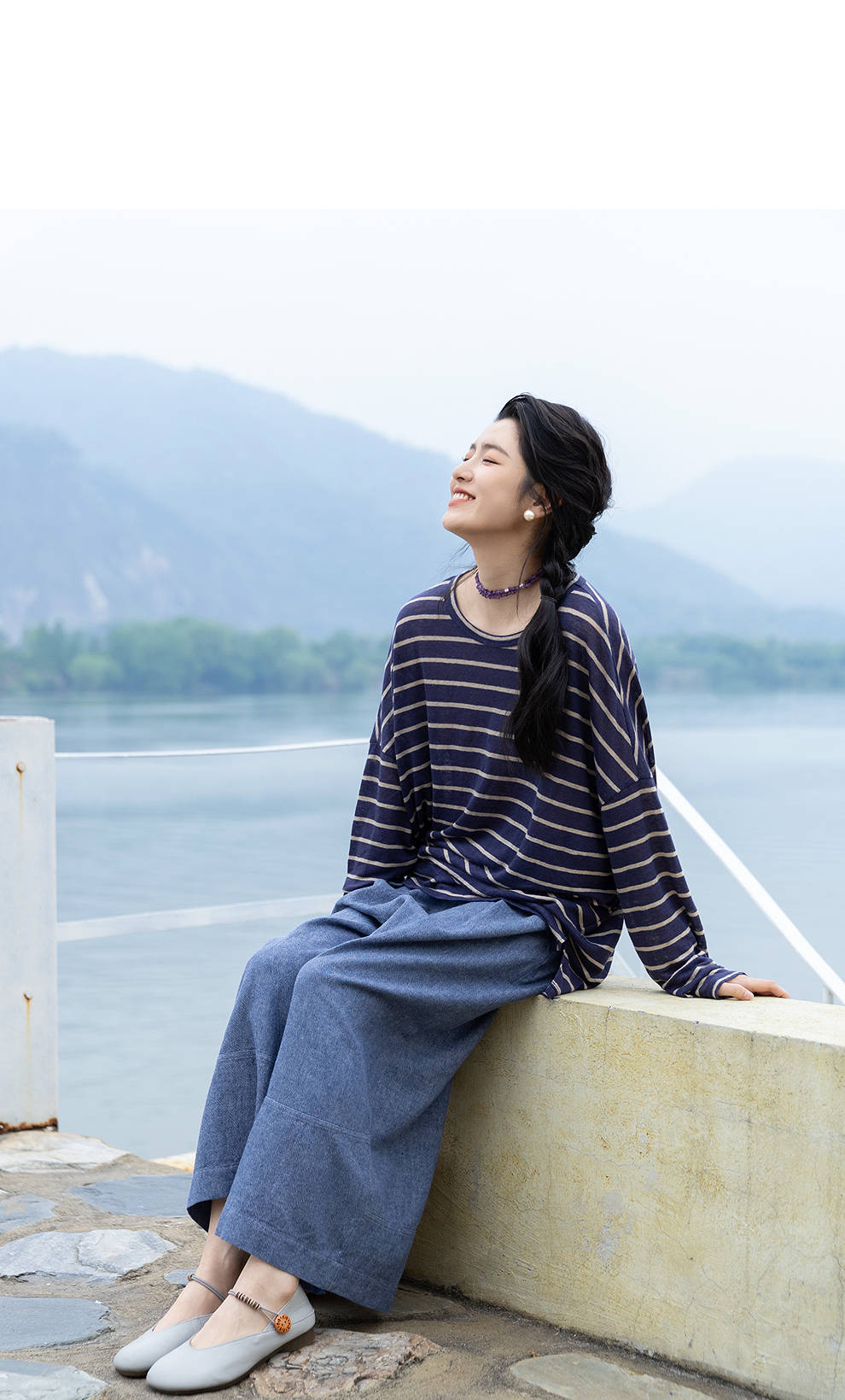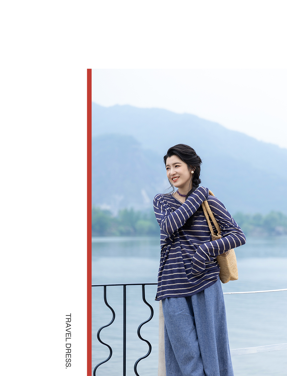 绽放旅行女装333朵【海街日记】亚麻针织条纹落肩长袖宽松防晒T恤