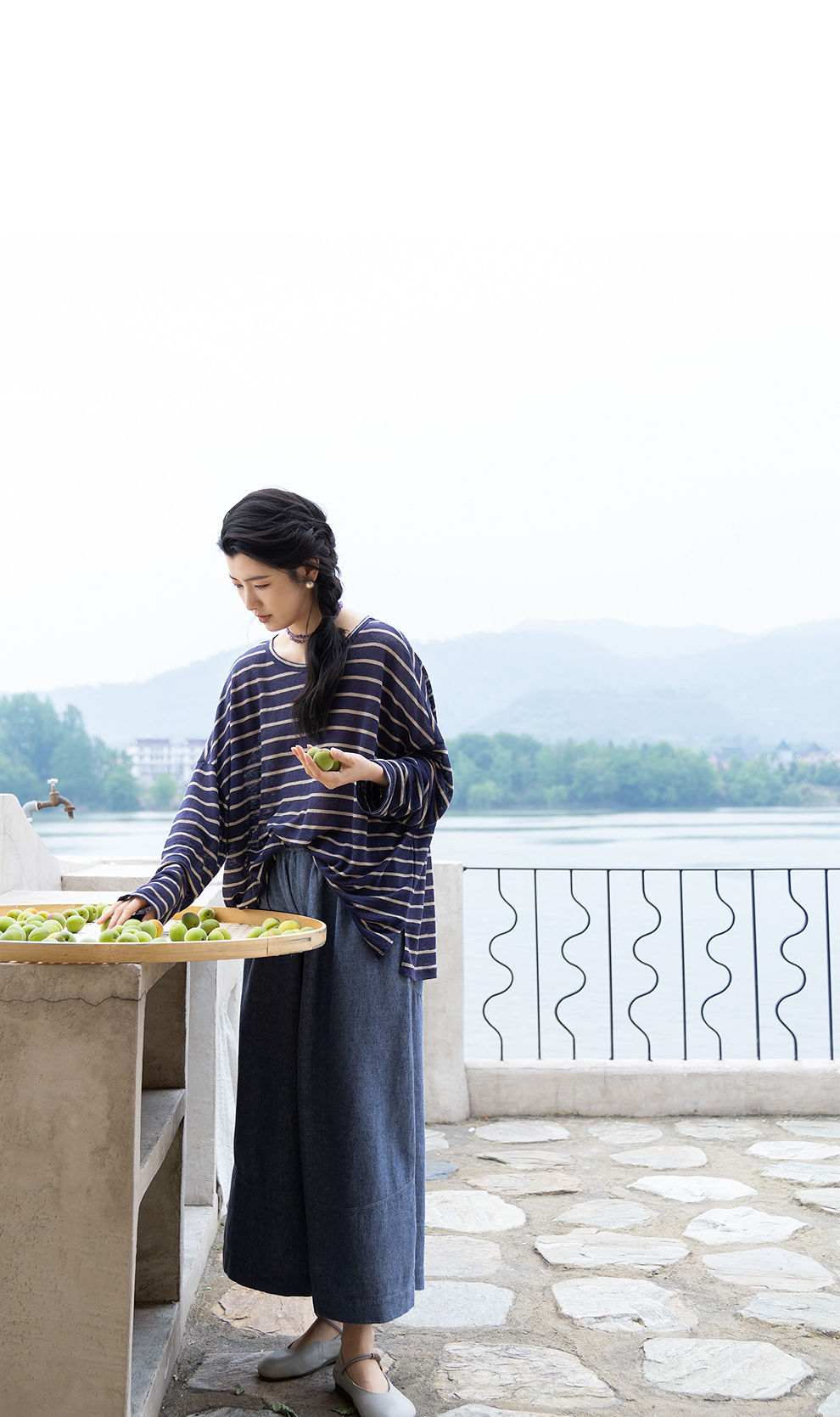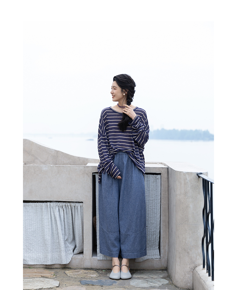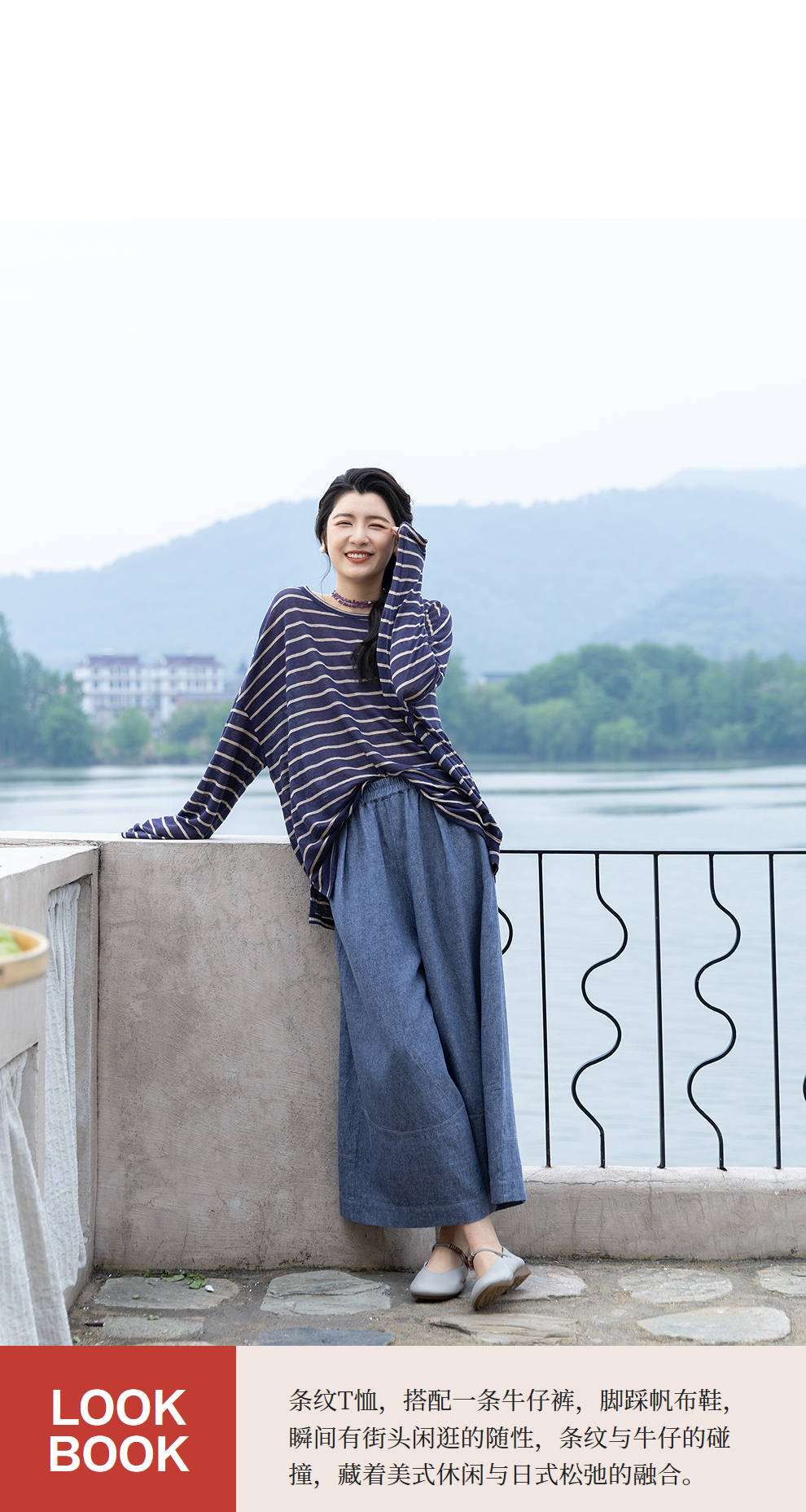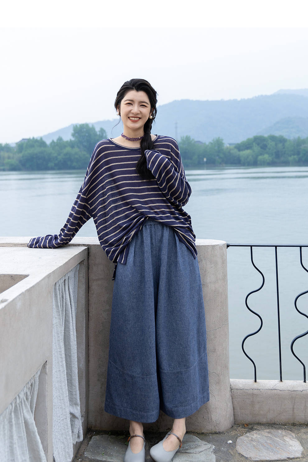 绽放旅行女装333朵【海街日记】亚麻针织条纹落肩长袖宽松防晒T恤