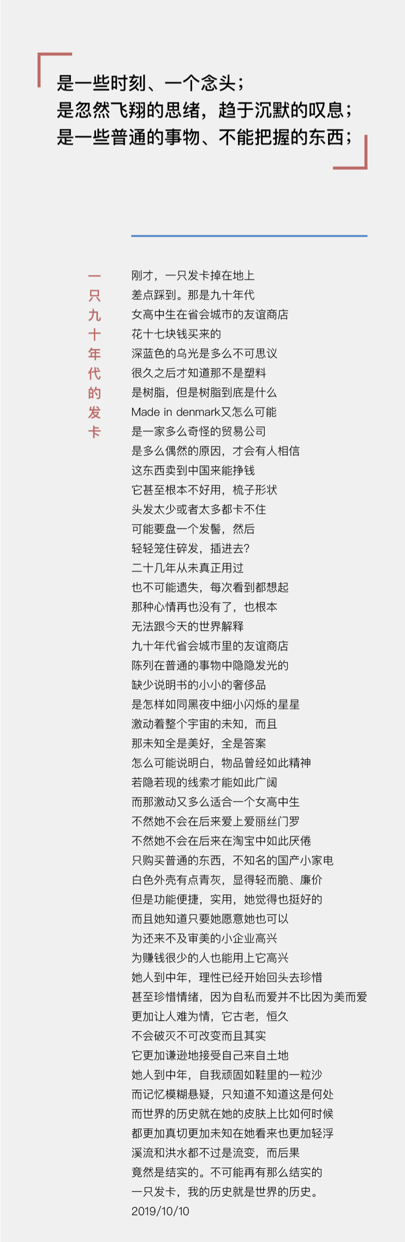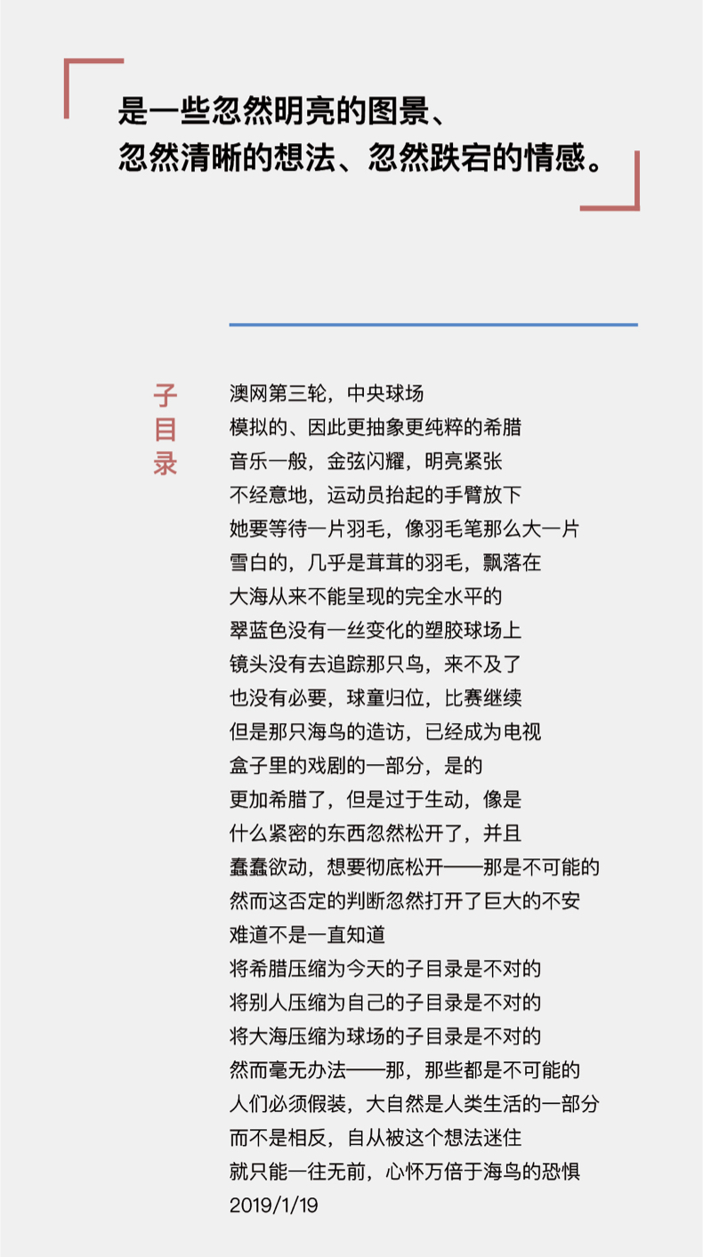 “作品”写作不是要表达,是要铸造存在,这些诗够不上,我对诗也还没有那个企图心,我只是在表达。表达与分享的核心是要诚实。我是一个老实人,年轻的时候很向往诗人,但是自己心里没有,就从没试过要模仿。中年之后忽然写诗,都是真情实感,没有为写诗矫情过。我也不是跟着语言走的写作者,大体上写出来都忠诚的。选诗的时候只有一个标准,就是诗里的意思还算值得一说。