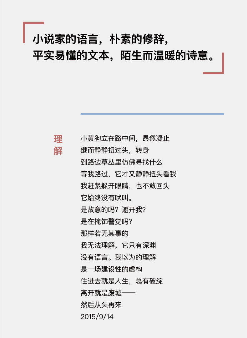 但这并非是体验过所谓中年人生况味才能感应到的诗,在不知道值不值得过的一天,被某个瞬间击中时,便能理解那“混沌中的光”。这也并非是需要诸多阐释才能读懂的诗,没有对语言的矫饰与卖弄,亲切而真诚的诗意,和呼吸一起起伏。