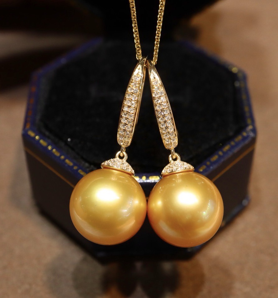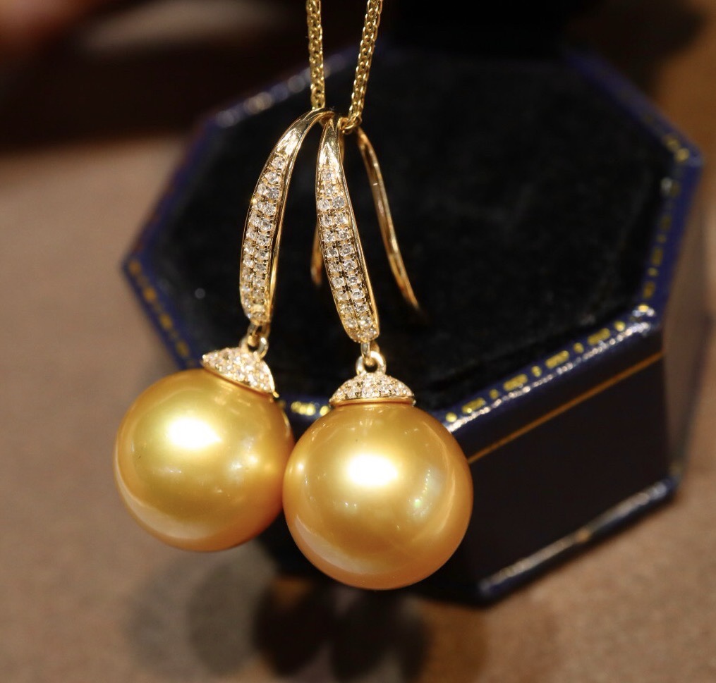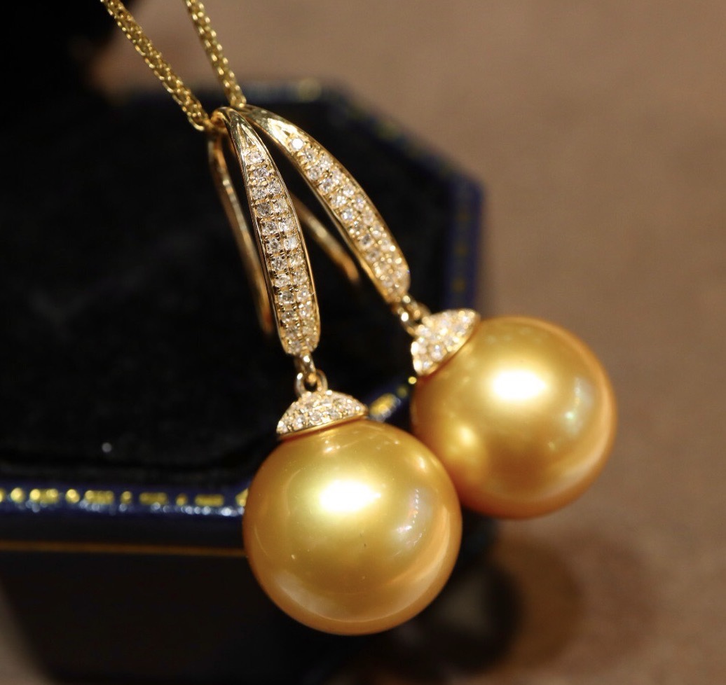 18k金钻石镶嵌,珠子正圆浓金强光极微瑕,色标级别