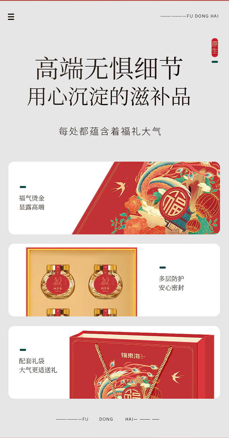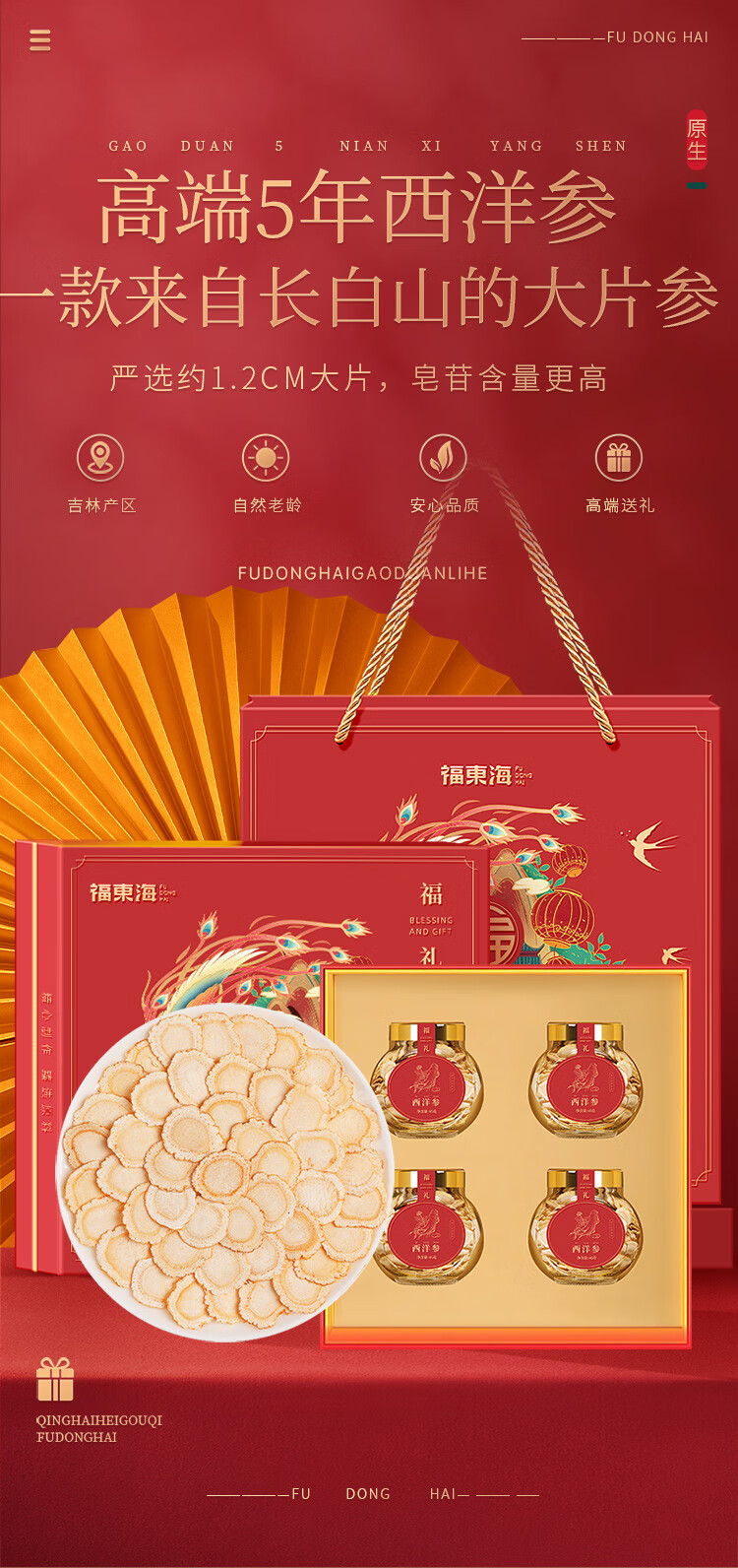 【年货礼盒】福东海 西洋参礼盒 精挑大片 花旗参人参皂苷滋补 泡水煲汤泡酒 送礼佳品 180g(45克*4瓶)