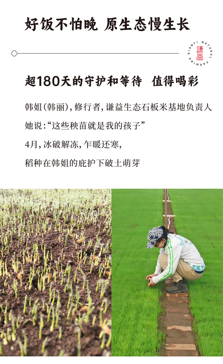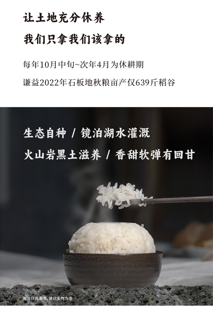 火山岩石板大米,均来自品牌方位于世界四大黑土带之一的牡丹江自有种植基地。每1公分黑土层需300年的时间才能形成,而这样的黑土,为稻谷的生长源源不断输送天然有机质、矿物质、微量元素,加上石板岩层特殊的气孔,白天吸热,晚上放热,也为水稻生长“充电续航”,让稻花香2号的有效积温达2800℃,比一般水稻仅有1900℃高出很多,而有效积温越高,水稻越饱满,口感也更好。除此外,基地还采用镜泊湖响水灌溉,水质澄清无污染,全程古法种植,不使用农药、化肥和除草剂,确保了大米的食品安全,每一粒都是镜泊湖纯净水源的恩赐,是长达180天的生长周期的结晶。品牌方为了保证大米的原始营养和口感,还采用最新鲜的大米进行粗加工的方式,不抛光不打蜡,保留了更多的营养成分。