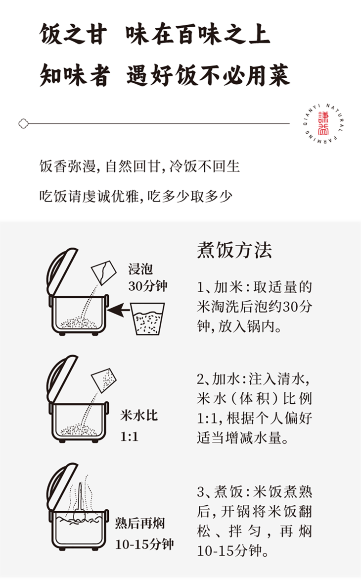 包装很简单,就如同品牌理念一样,保留本真,关注食物本身。饱满的米粒偏椭圆,晶莹剔透,生米就已经很香了,泡上30分钟,放上1:1的水,电饭煲一煮,开锅真的是米香四溢,米油晶亮,白饭我就能吃完!我已经是偷懒的快煮做法了,多加了些水,更软糯甜美,还留了一碗第二天炒饭,那个锅巴,真的香死!