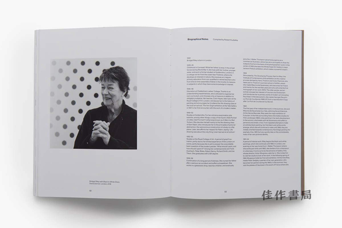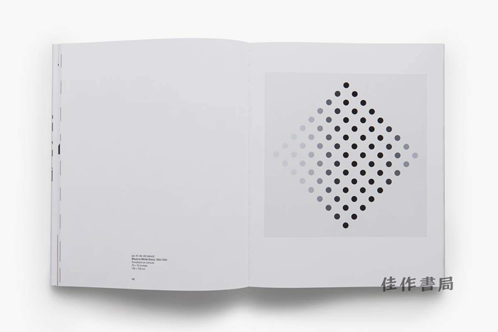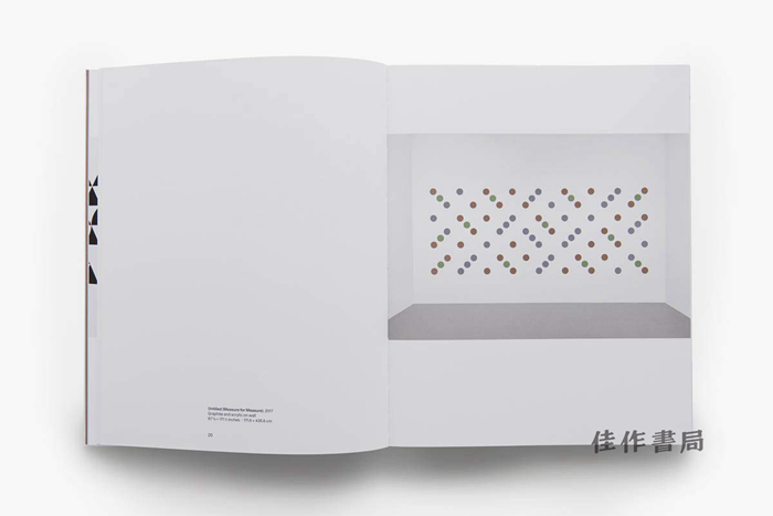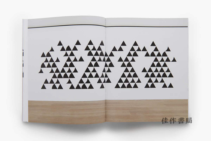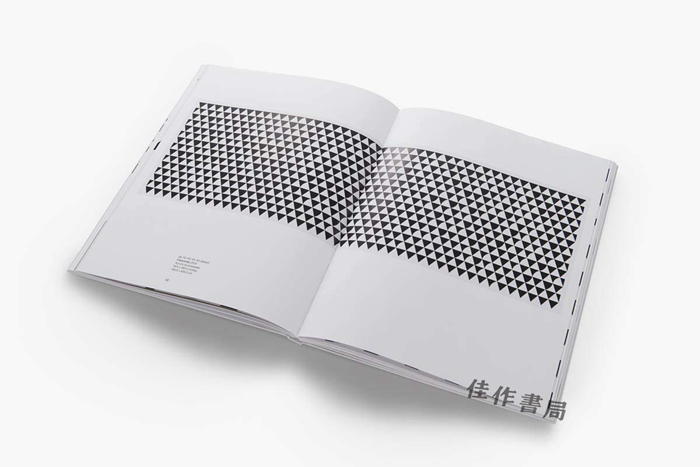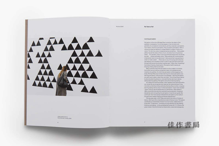 这份出版物沿着赖利在卓纳画廊伦敦空间举办的2018年展览的路线展开。从探索黑白等边三角形开始,赖利带领观众了解一面墙壁或一块画布如何影响三角形这样一个看似简单的形状。当赖利在展示这些微妙的变化时,以扭曲形状的边来操纵图形。乍一看,观众可能会觉得这是一种分裂,但随着人们继续观察,蛇形运动或带大阴影的三角形出现了,呈现前进和后退的效果。这些画作通过观众的观察不断进行自我重塑。