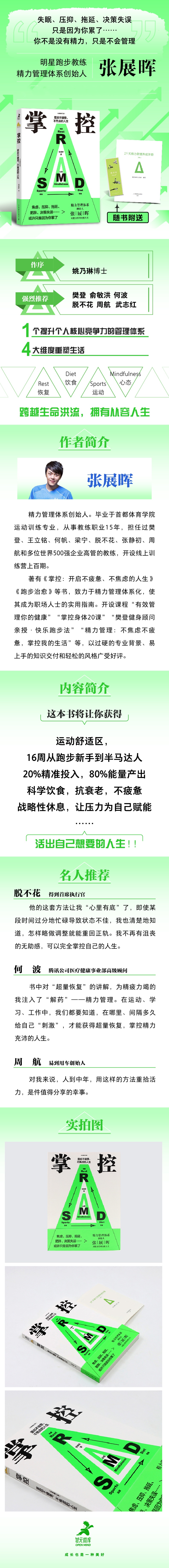 《掌控:重启不疲惫、不焦虑的人生》是一本从运动、饮食、休息和心态四个维度讲述如何保持旺盛精力的自我心态管理书。 减重十公斤是一个目标,而正确饮食是一种体系。 四小时跑完马拉松是一个目标,而科学锻炼是一种体系。 六十秒入睡是一个目标,而高质量的恢复是一种体系。 体系是什么?体系包含着你定期做,并且在长远看来可以增加幸福概率的事情。 精力管理要建立的是这样一种日常体系。 它看上去简单朴素,却可以让我们在不确定性中抓住确定的部分轻松胜任工作、健康生活,有余力享受休闲时光,从容应对身体突发状况,活出自己想要的人生。