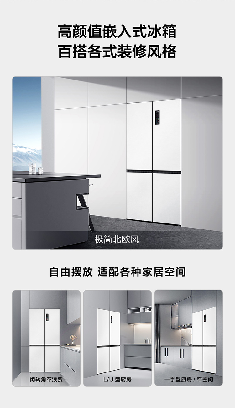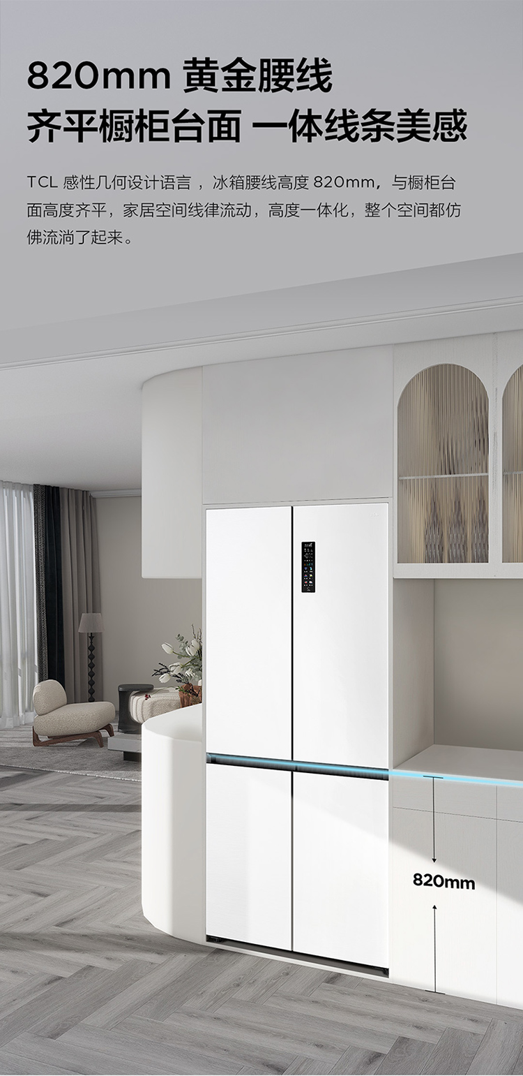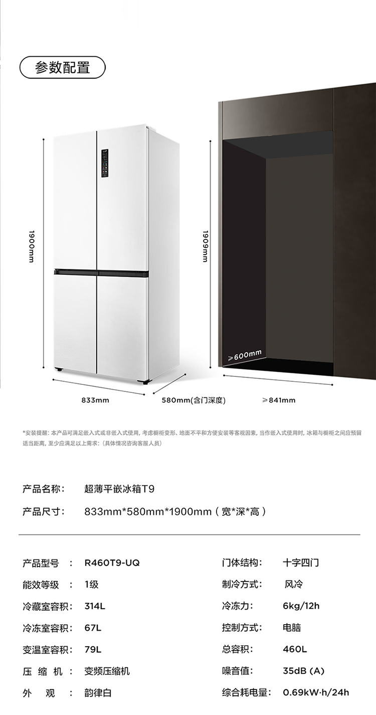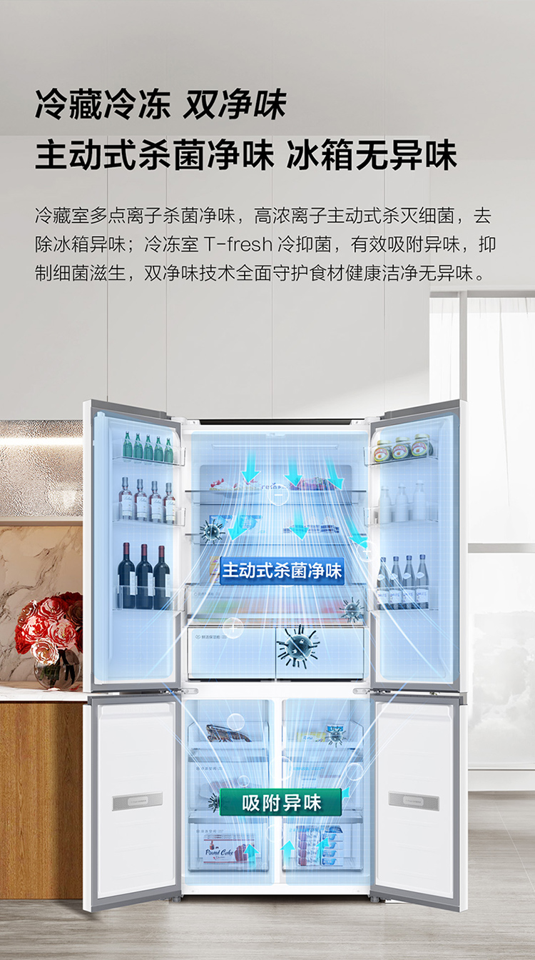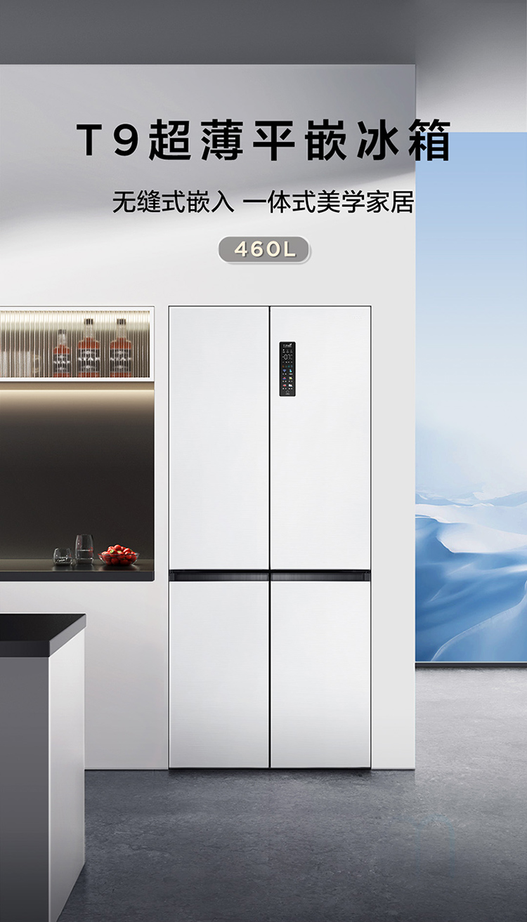 TCL 460升T9十字四开门58cm超薄零嵌入式底部散热双净味宽幅变温冰箱 R460T9-UQ