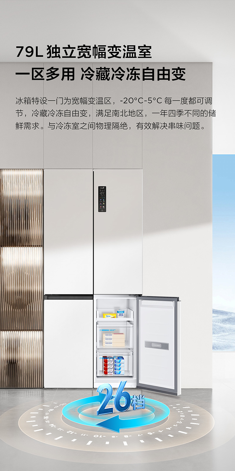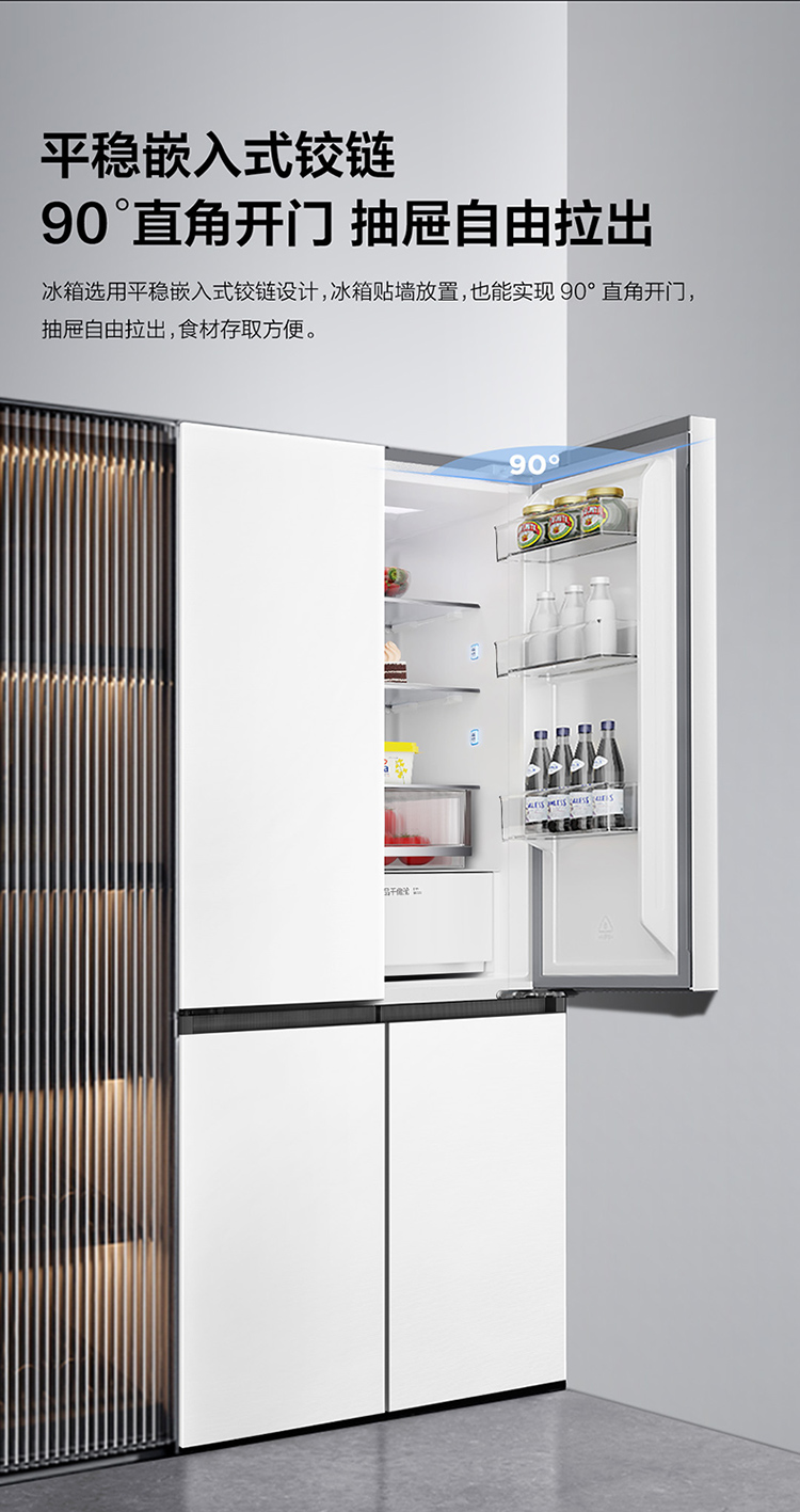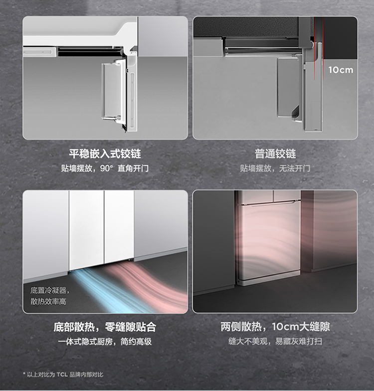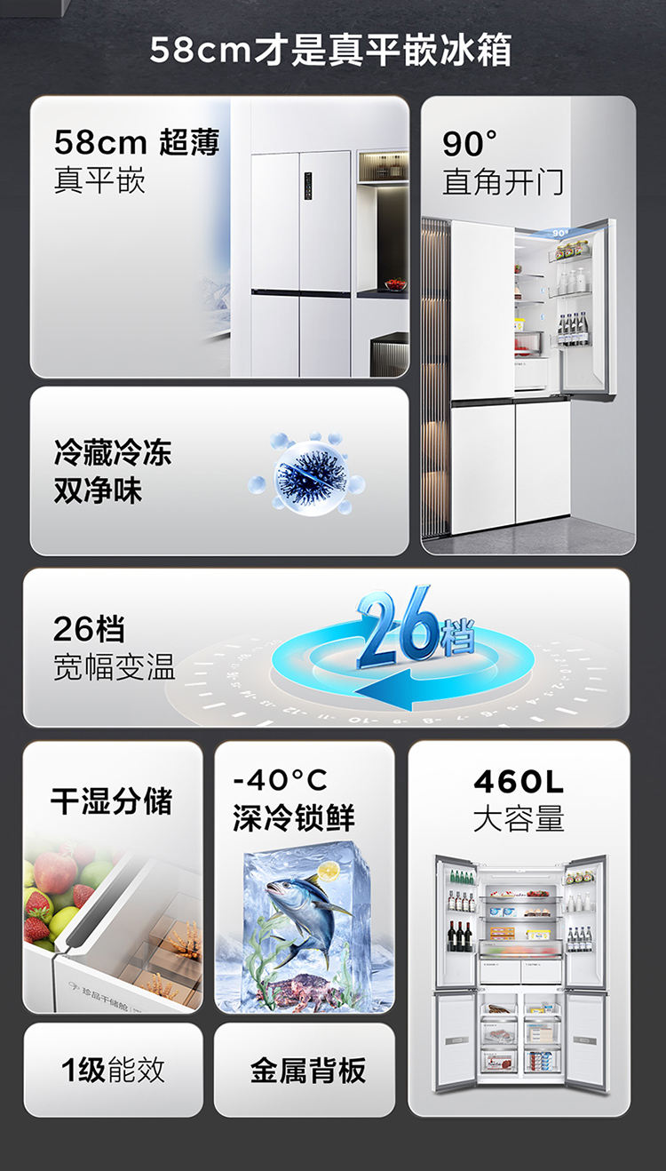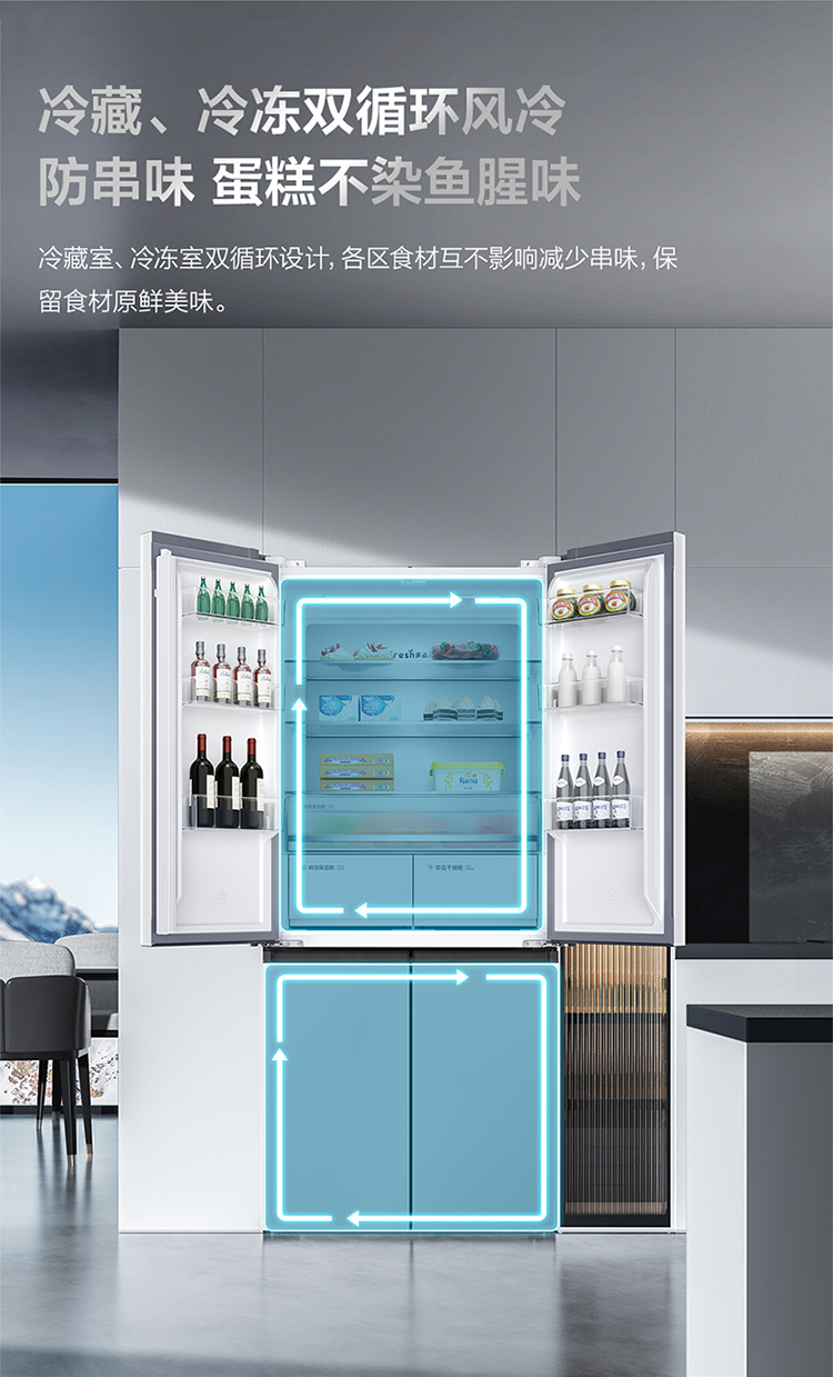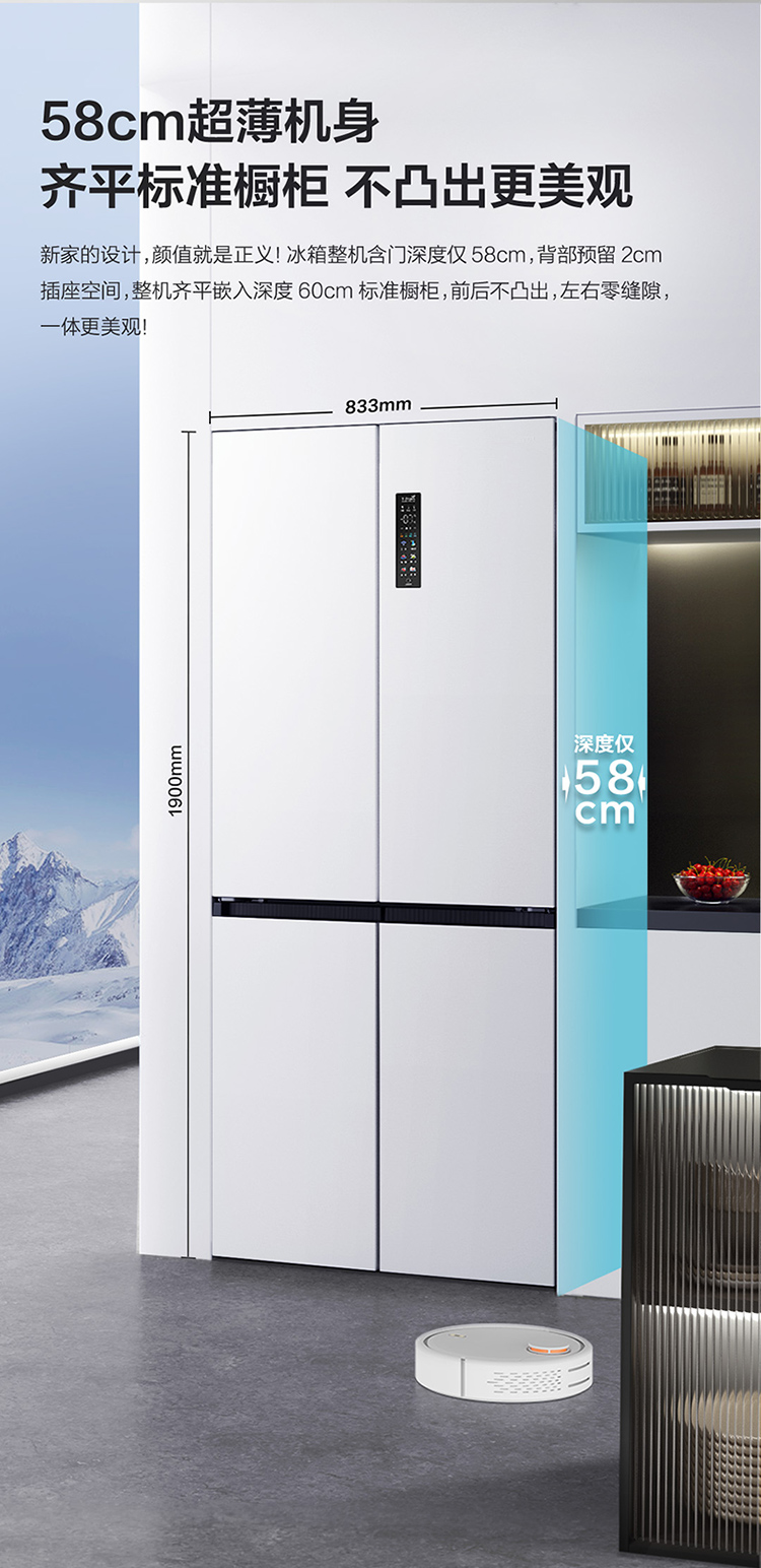 TCL 460升T9十字四开门58cm超薄零嵌入式底部散热双净味宽幅变温冰箱 R460T9-UQ