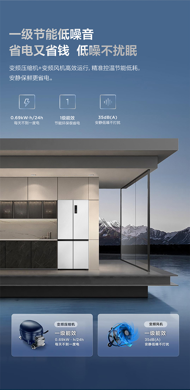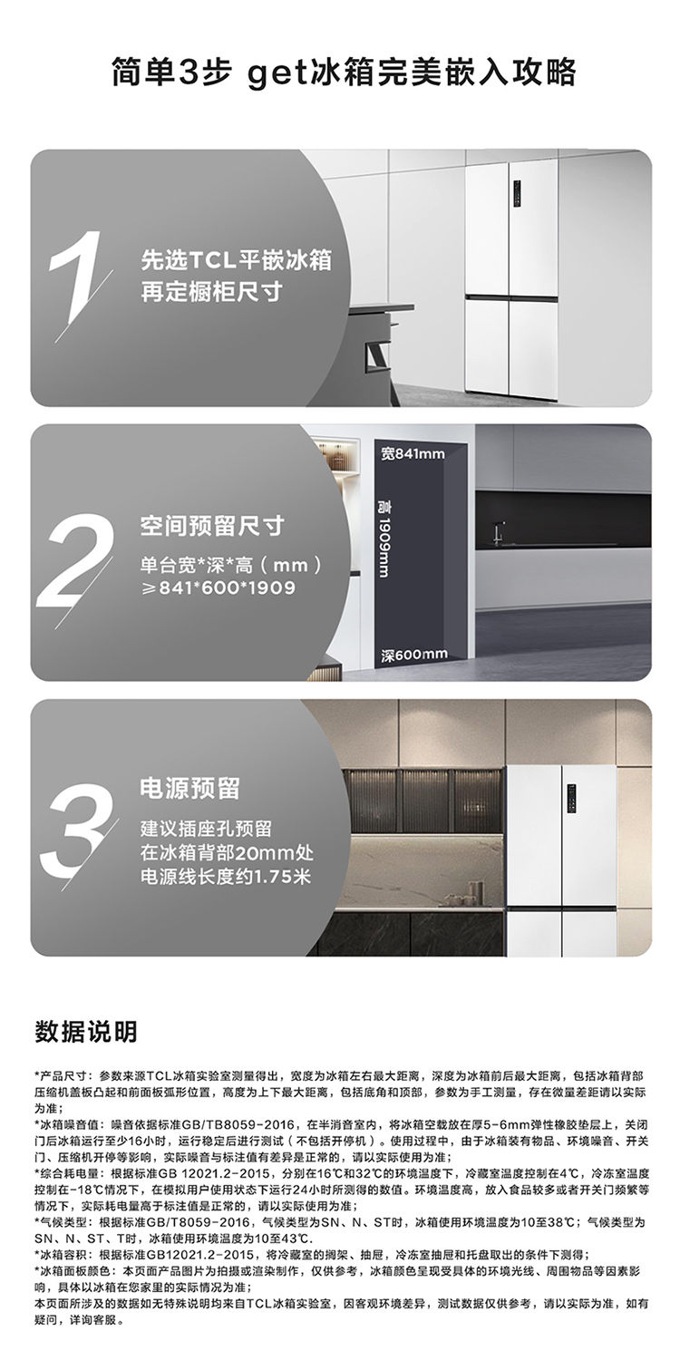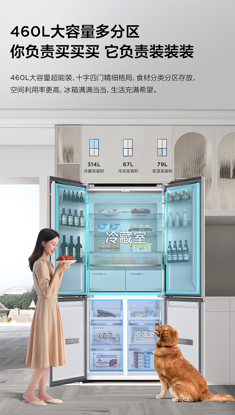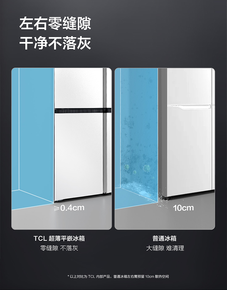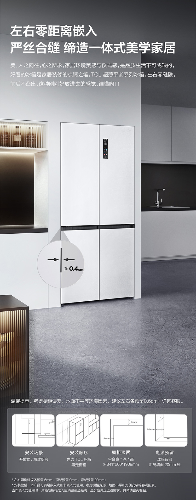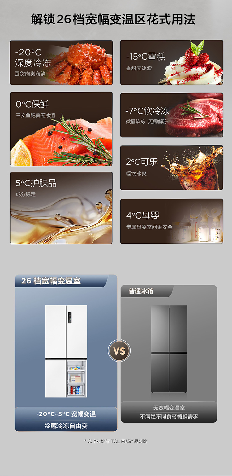 TCL 460升T9十字四开门58cm超薄零嵌入式底部散热双净味宽幅变温冰箱 R460T9-UQ