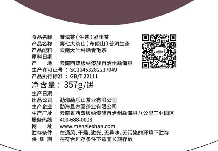 勐乐山七山系列普洱生茶(布朗山)生饼357g