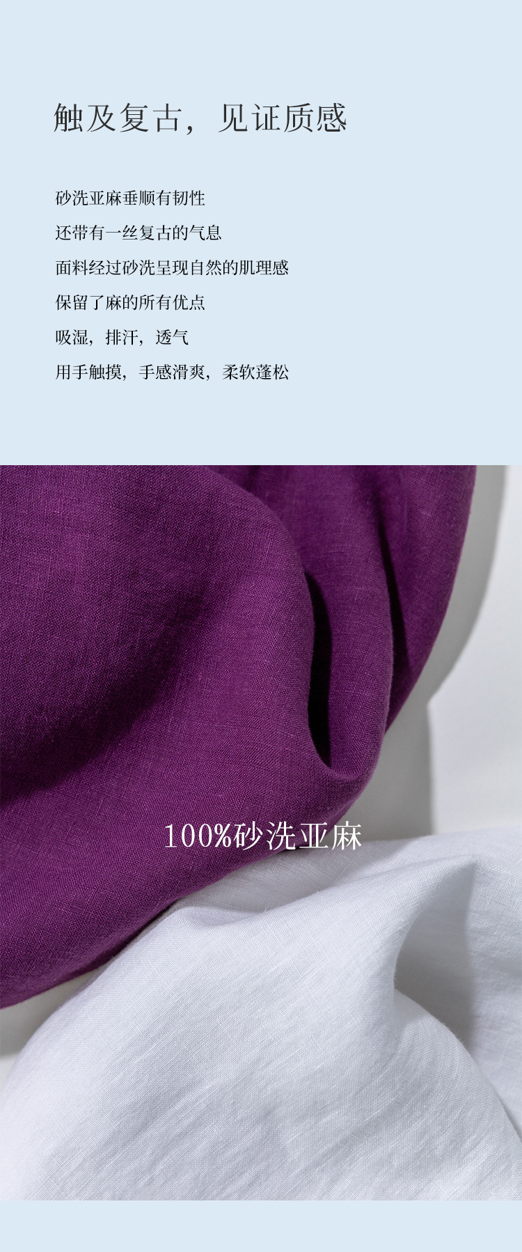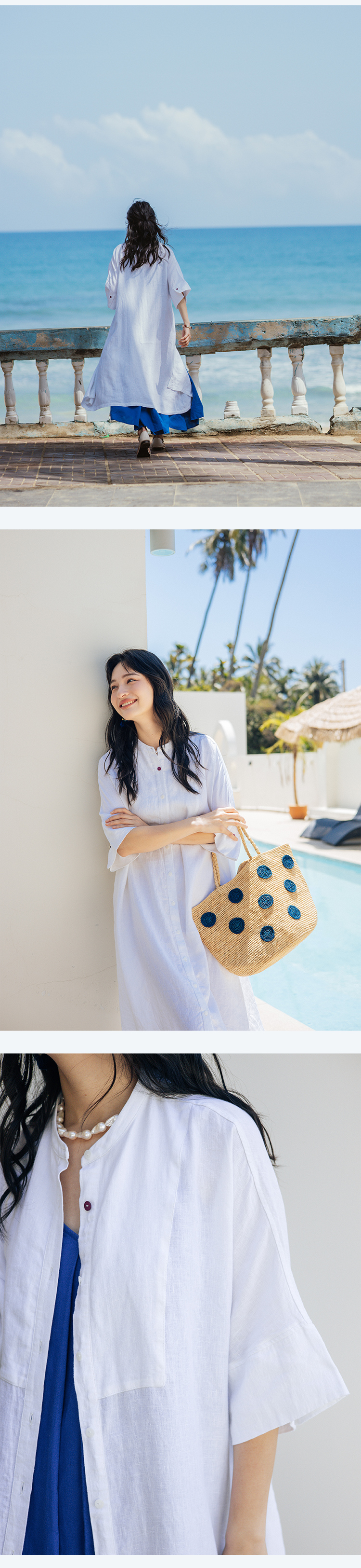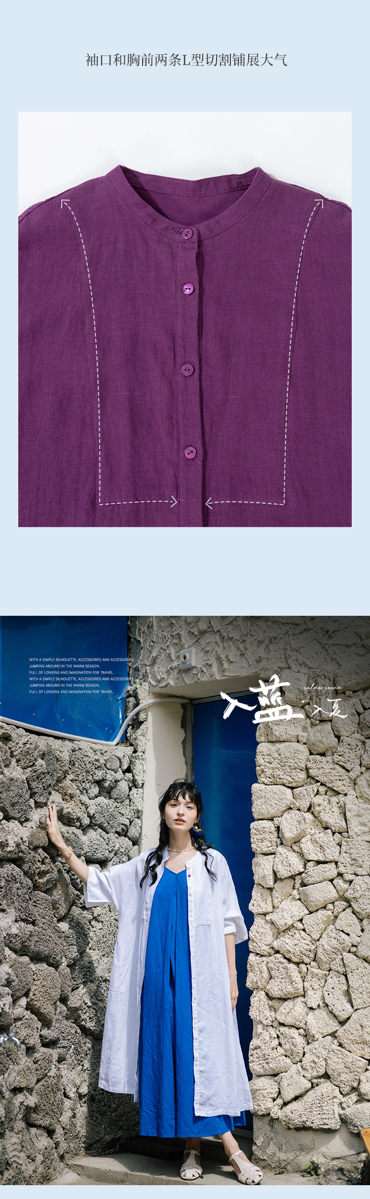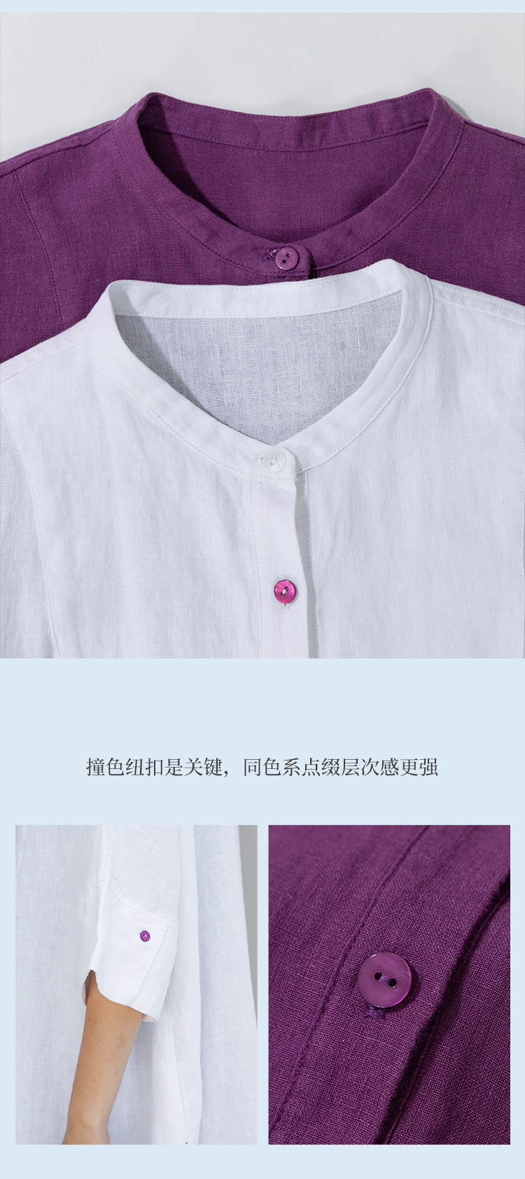 绽放351朵【入蓝系列】100%砂洗亚麻立领翻领两穿宽松休闲连衣裙