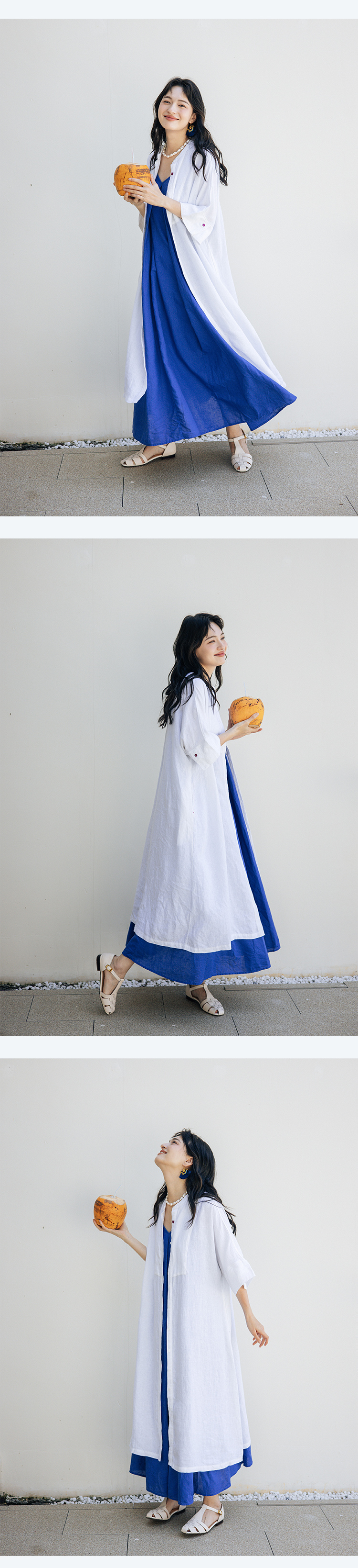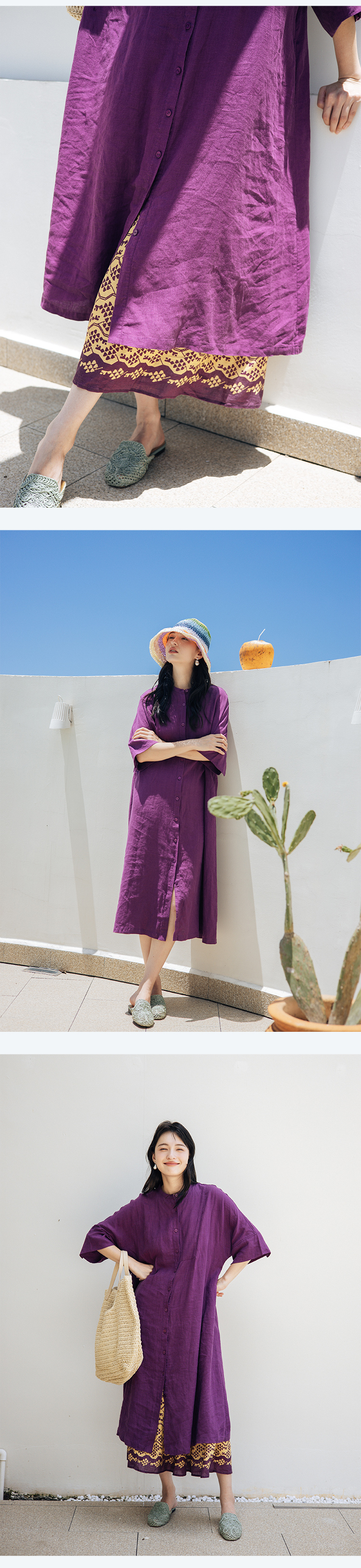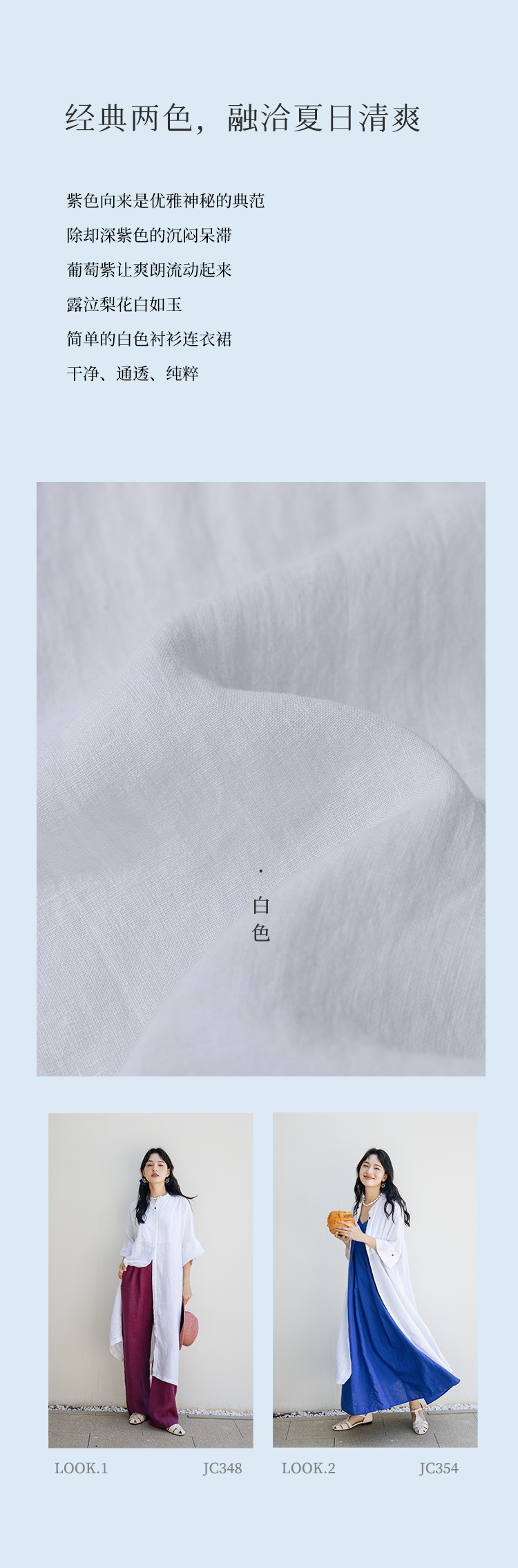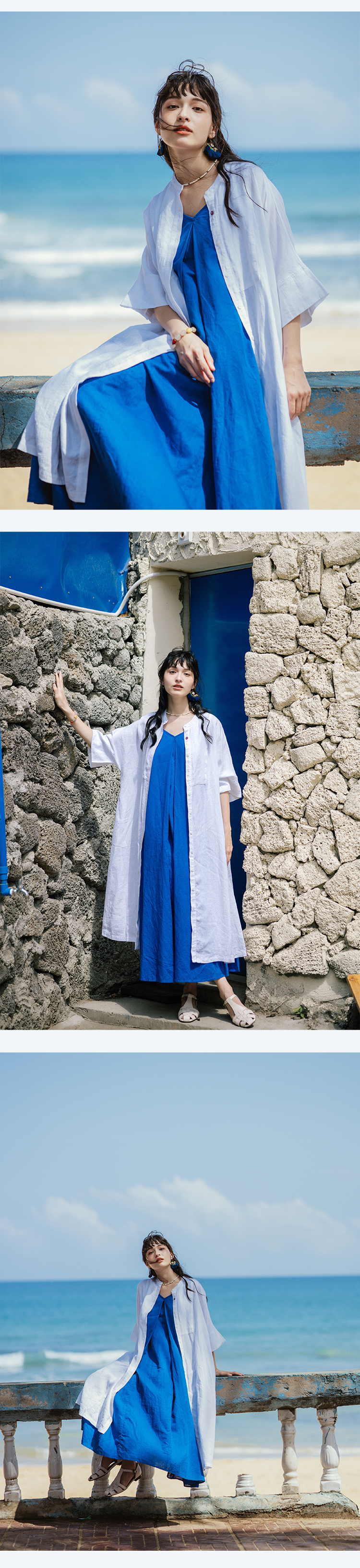 绽放351朵【入蓝系列】100%砂洗亚麻立领翻领两穿宽松休闲连衣裙