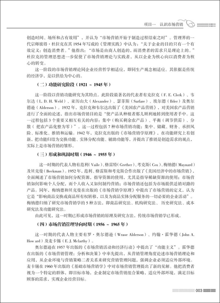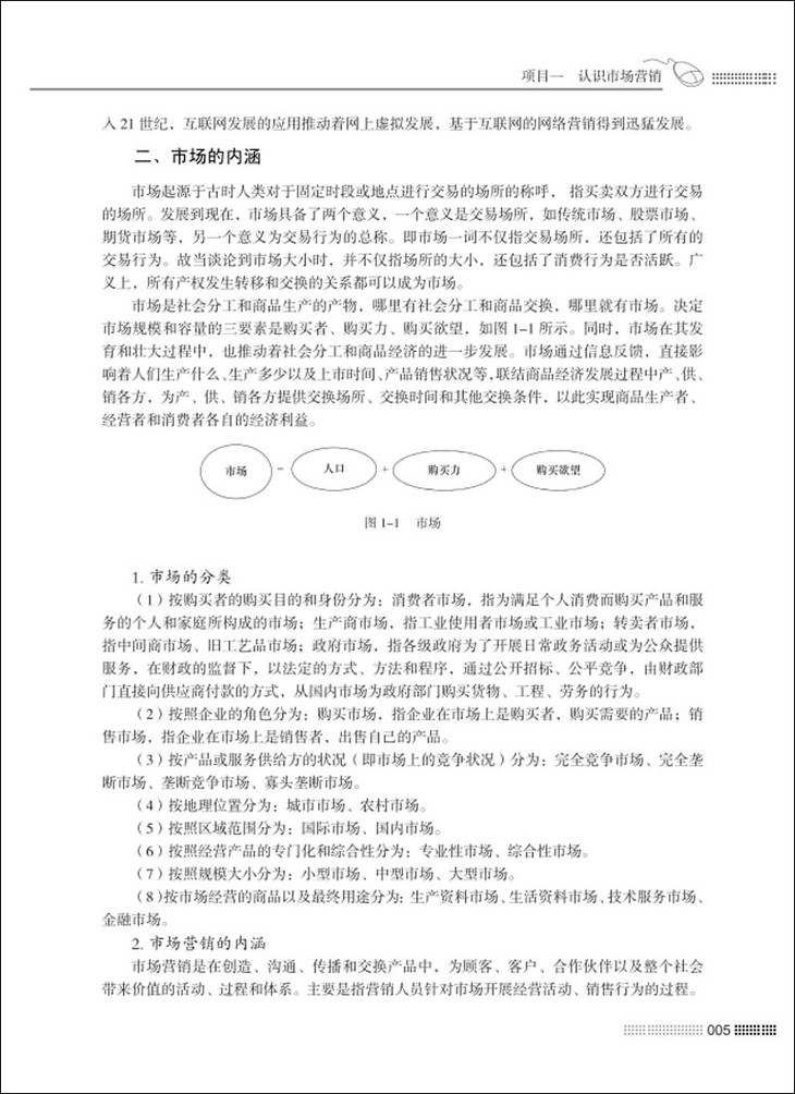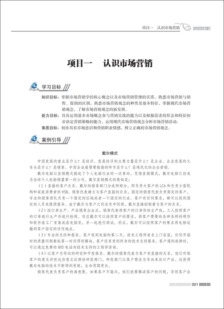 本书的特色主要体现在:第一,在理论上,兼顾知识的系统性、前瞻性和实用性。在突出经典的市场营销理论之外,吸收市场营销学理论的最新成果,保持体系的完整、新颖,内容上的丰富而实用,让学生感受到市场营销学理论的经典价值与创新魅力。第二,在实务上,突出现实性、可操作性和应用性。根据各章内容,针对性地穿插足够数量并具典型意义的案例和相关知识介绍。第三,在激发学生的学习兴趣上,注重体现知识的拓展性、案例的生动性、学习的自主性。引入新的理论、案例、材料,甚至是课后练习等,培养学生的创造激情和创造能力。在导入正式内容前给出“案例引导”,以便引起学生对本章的兴趣和关注,各章内容中穿插“案例链接”、“延伸阅读”等增加内容的可读性,在对应的理论与实践之间构建桥梁;第四,在培养学生的能力上,每章安排了“案例分析”等练习和实践,突出了知识应用能力的培养;第五,本书在每个项目之后提供相当数量的练习题,在附录部分还加入了习题答案和模拟试卷及答案,同时编者还为本书配备了电子课件供读者在中国建材工业出版社的官方网站上免费下载。