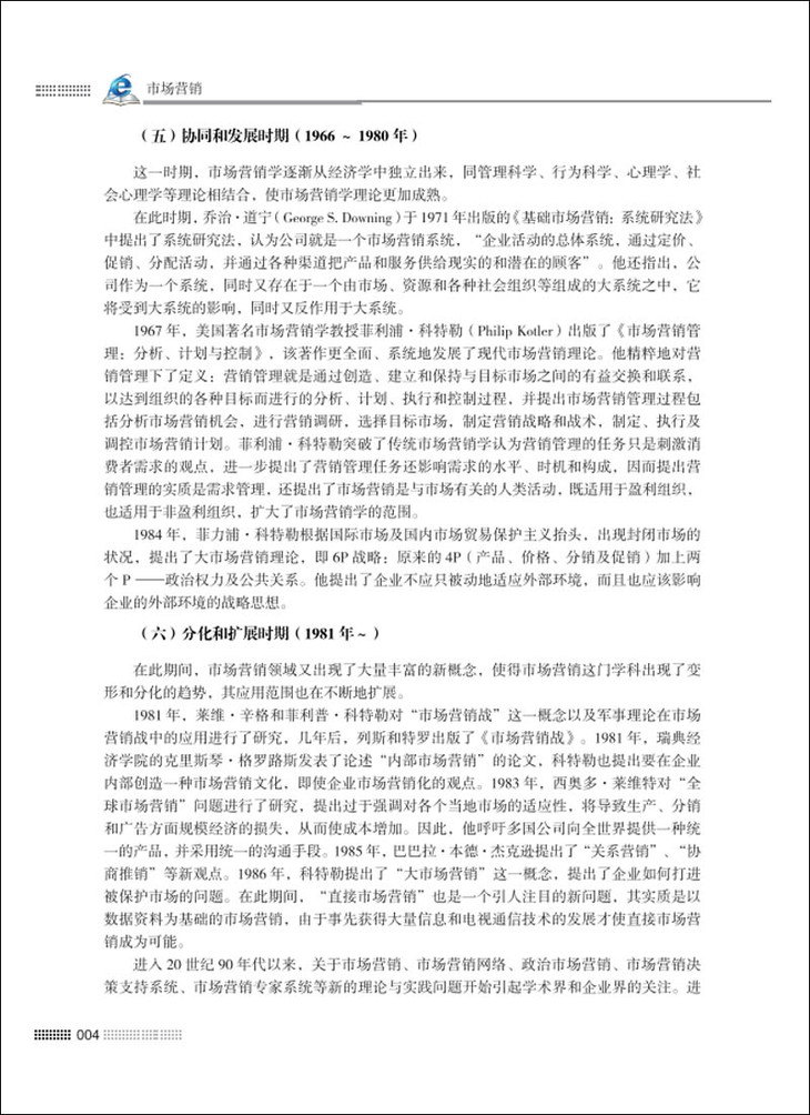 《市场营销?高职高专电子商务专业规划教材》一书在体系结构上,保持了市场营销学体系的基本构架,在内容上进行了整合和提炼,既突出市场营销学的实用性,又体现它的持续发展性。本书吸收顾客价值理论、竞合战略理论、整合营销传播理论的最新成果,并在最后一章专门介绍了当代营销的新领域,包括关系营销、直复营销、体验营销、服务营销、网络营销等理论。