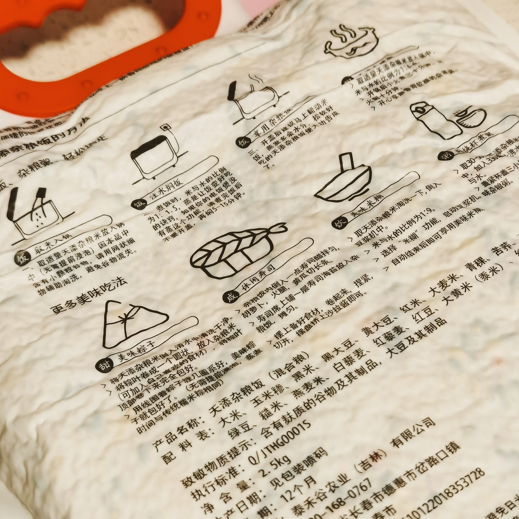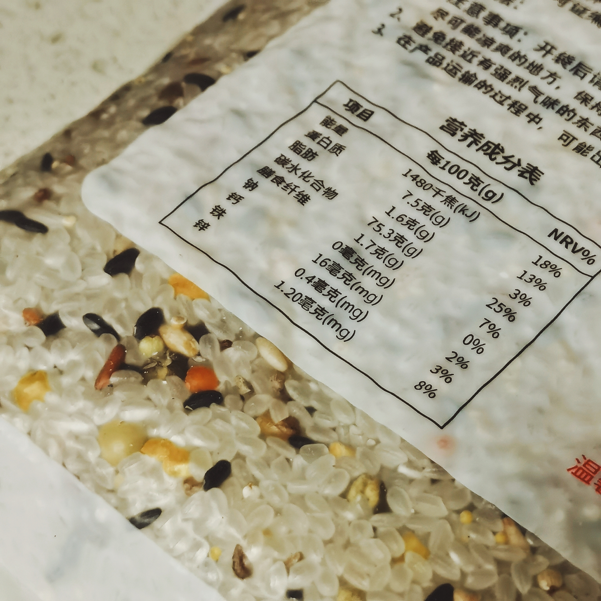配料表:大米、玉米糁、黑米、黑大豆、黄大豆、红米、大麦米、青稞、苦荞、高粱米、荞麦、绿豆、糙米、燕麦米、藜麦、红豆、大黄米、红扁豆、小米