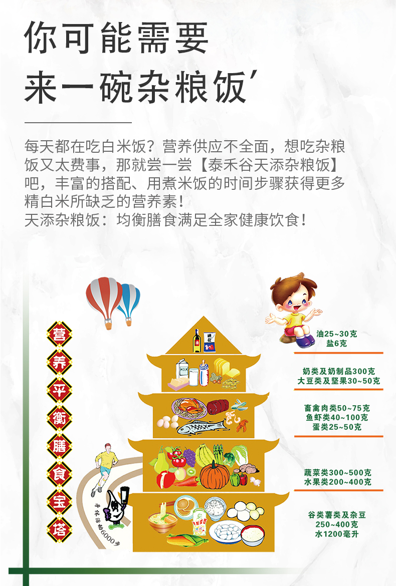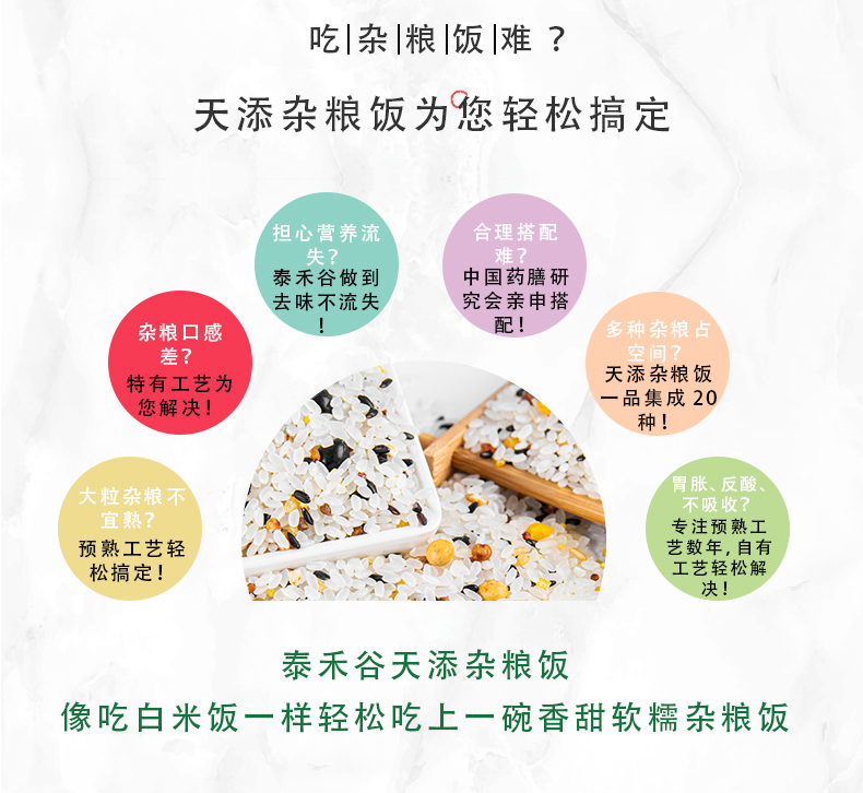 这款免泡好熟的杂粮饭来自泰禾谷,它是拥有自己的生产工厂及粮食种植基地、食用菌种植基地,并取得了食药监局批准的食品生产许可证的一个农产品品牌,并联合农科院食品科学的专家,依托农科院食品科学专家的技术支撑,由营养师的科学配比而成。通过采用先进的设备和工艺,泰禾谷在不改变杂粮外观及营养成分的前提下,让不容易煮熟的多种杂粮提前预熟,能和大米同煮同熟,达到粗细搭配、营养均衡。