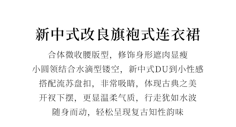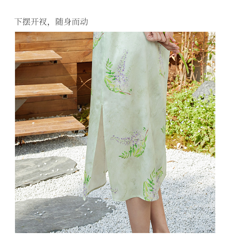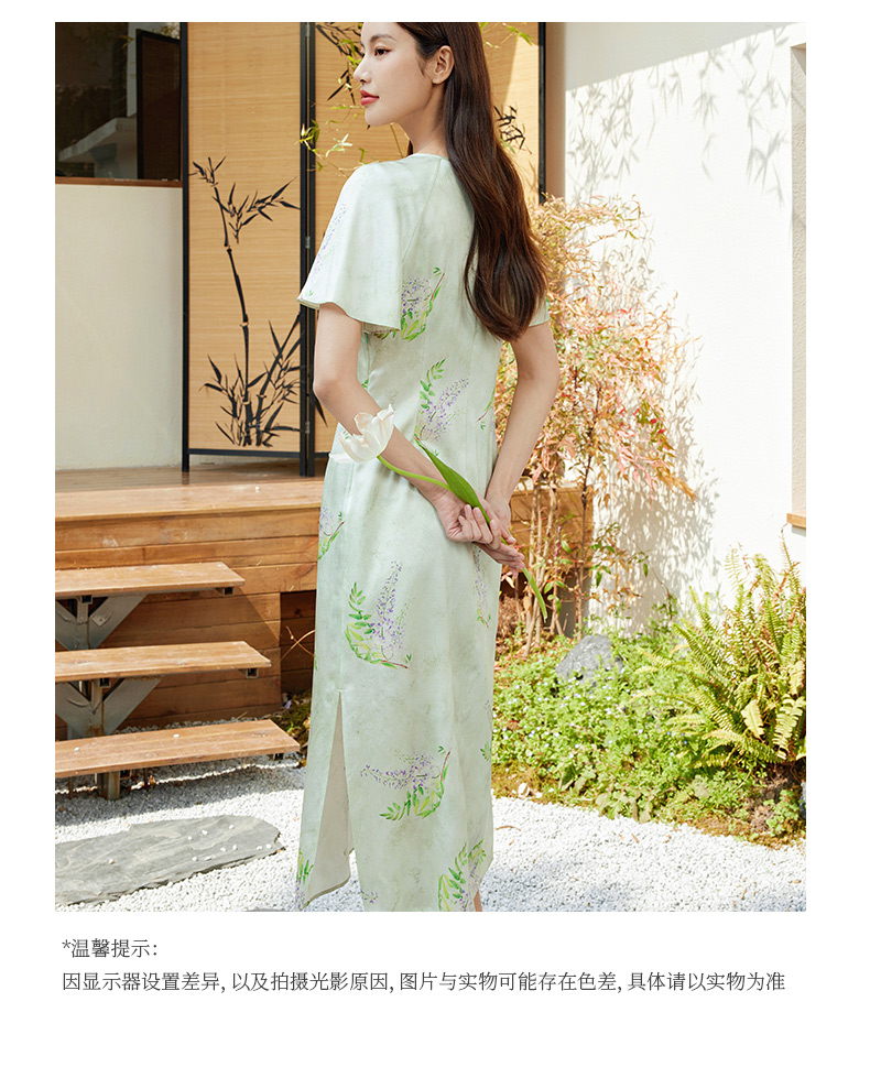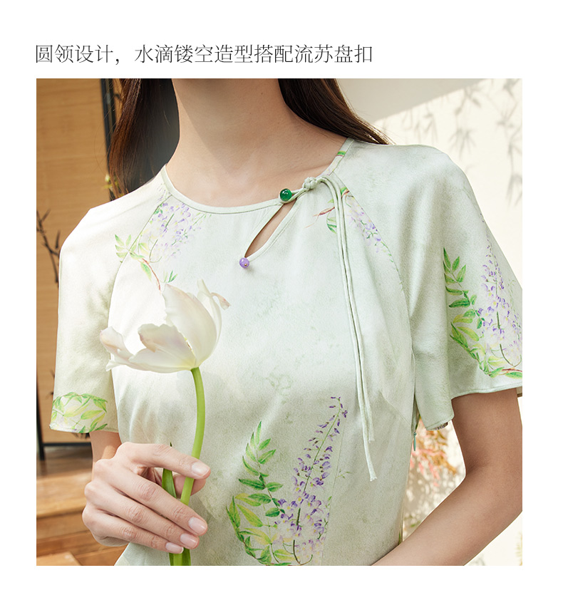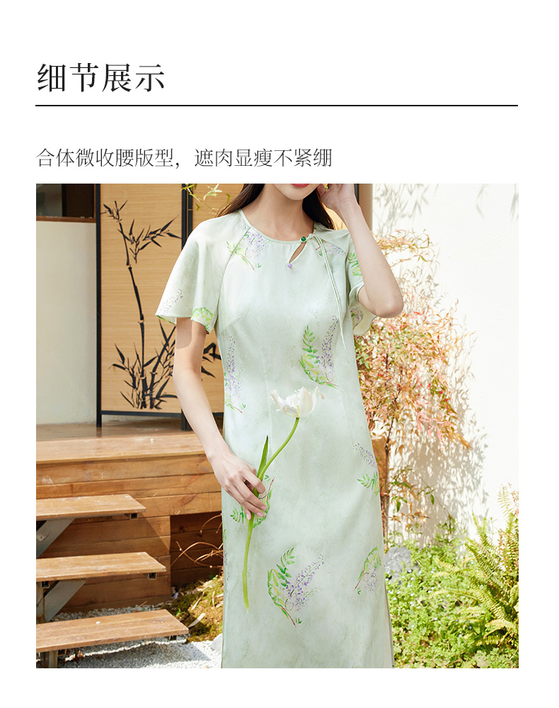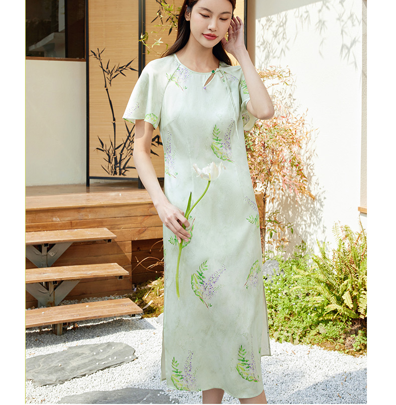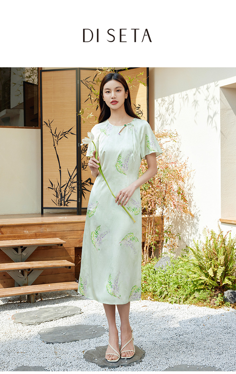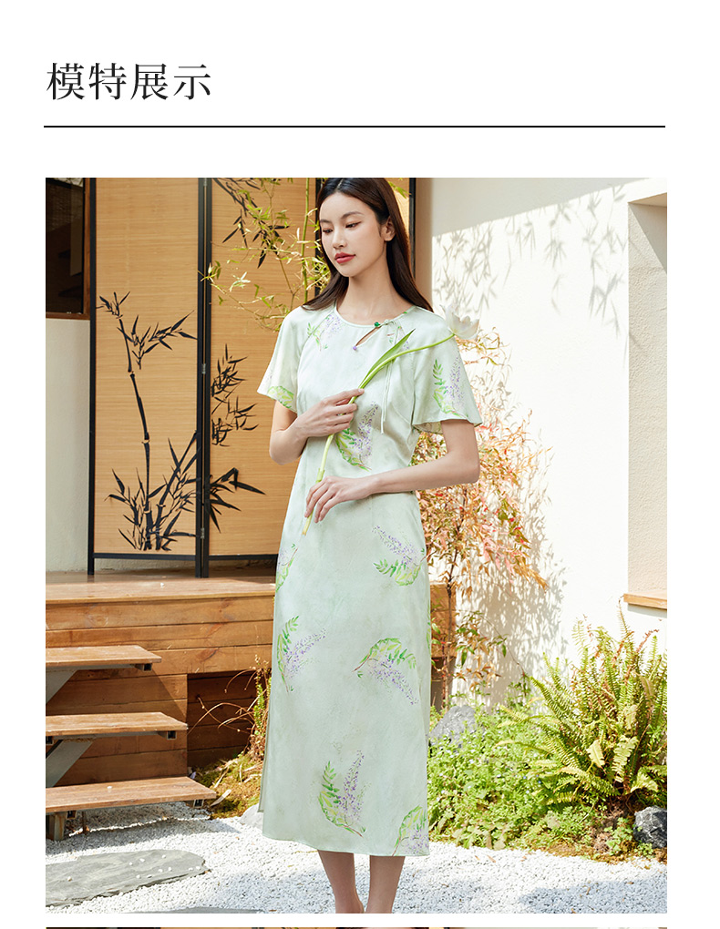 玳莎新中式改良旗袍式真丝连衣裙2024夏季新款印花短袖圆领中长裙 EB35103