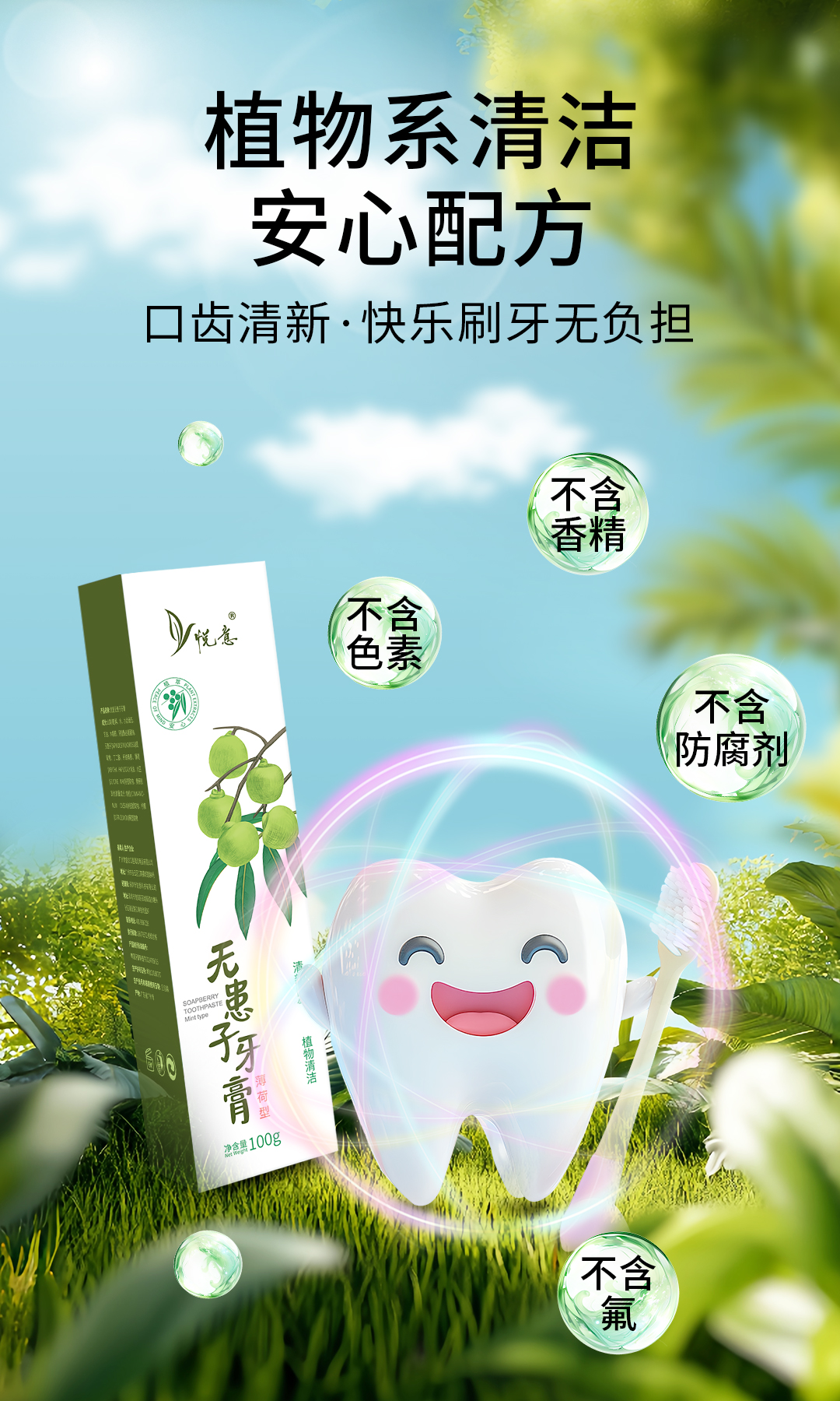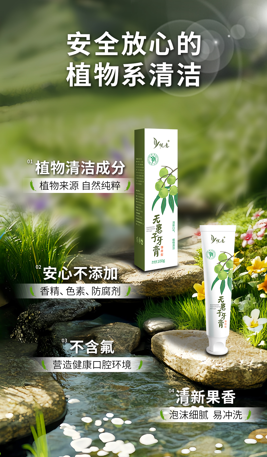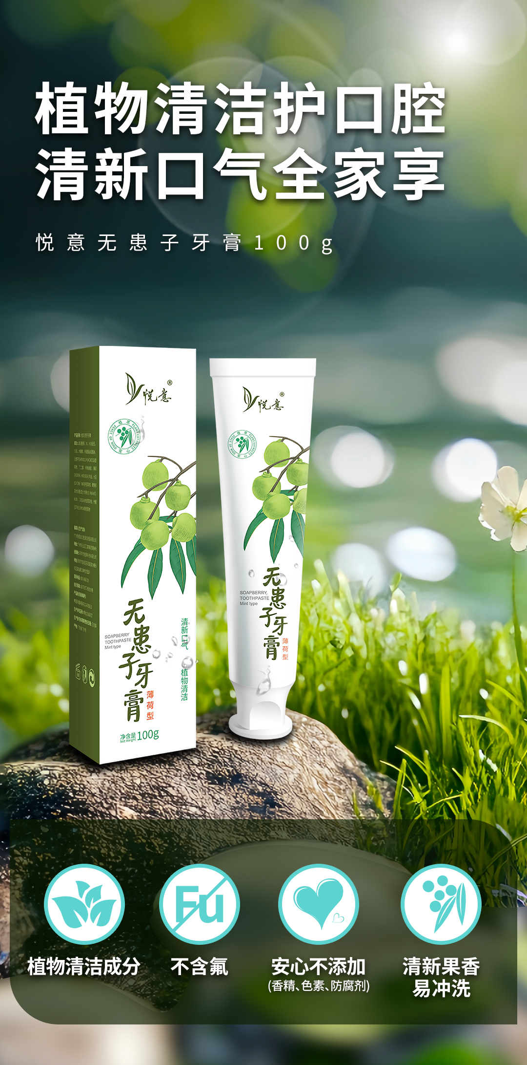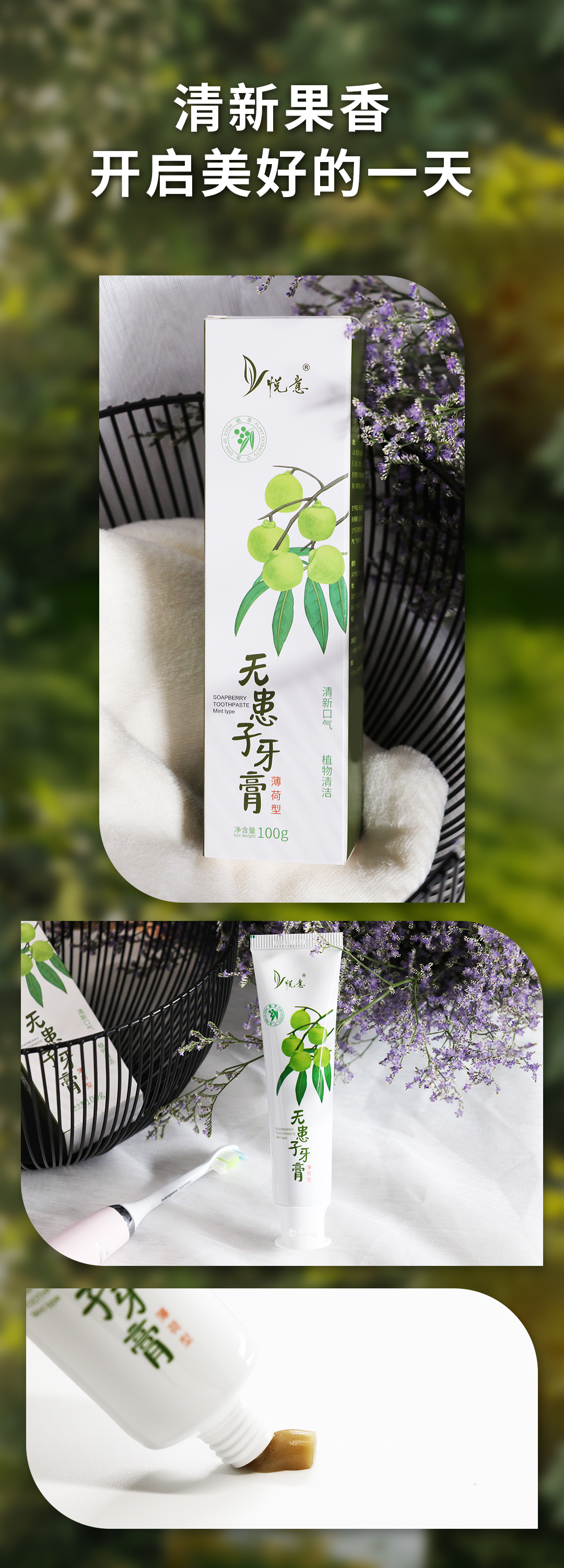 悦意无患子牙膏薄荷型100g*2支 植物清洁护口腔 清新口气全家享