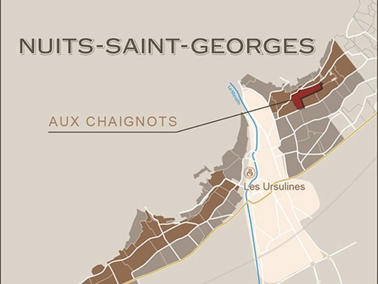 Aux Chaignots在古法语中意为“古老橡树林”,位于夜圣乔治酒村北部Meuzin斜谷中坡段,朝向东偏南,主要以棕色石灰质和砂砾土壤为主,粘土成分偏低,富含大量冲积形成砾石。该园酒风圆润扎实,以芳香细腻的优雅闻名,同时带有迷人花香,陈年潜力极佳。