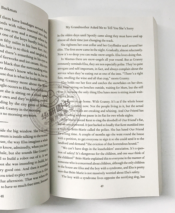 Granny is seventy-seven years old, going on seventy-eight. She’s not very good at it either. You can tell she’s old because her face looks like newspaper stuffed into wet shoes, but no one ever accuses Granny of being grown-up for her age. “Perky,” people sometimes say to Elsa’s mum, looking either fairly worried or fairly angry as Mum sighs and asks how much she owes for the damages. Or when Granny’s smoking at the hospital sets the fire alarm off and she starts ranting and raving about how “everything has to be so bloody politically correct these days!” when the security guards make her extinguish her cigarette. Or that time she made a snowman in Britt-Marie and Kent’s garden right under their balcony and dressed it up in grown-up clothes so it looked as if a person had fallen from the roof. Or that time those prim men wearing spectacles started ringing all the doorbells and wanted to talk about God and Jesus and heaven, and Granny stood on her balcony with her dressing gown flapping open, shooting at them with her paintball gun, and Britt-Marie couldn’t quite decide if she was most annoyed about the paintball-gun thing or the not-wearing-anything-under-the-dressing-gown thing, but she reported both to the police just to be on the safe side.