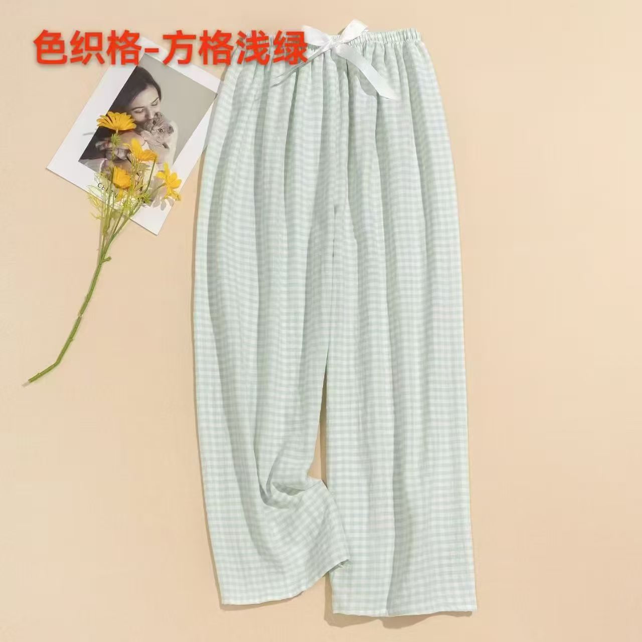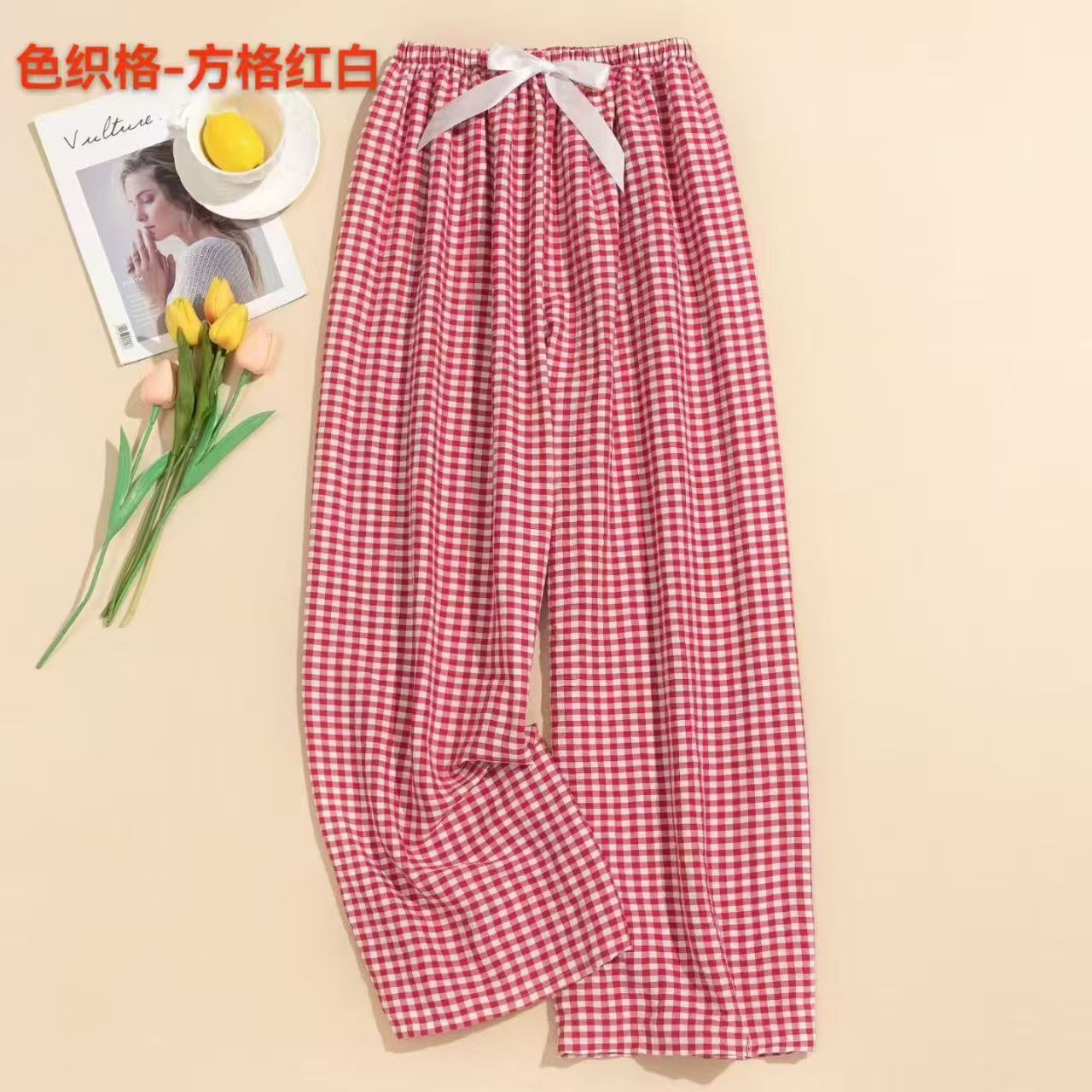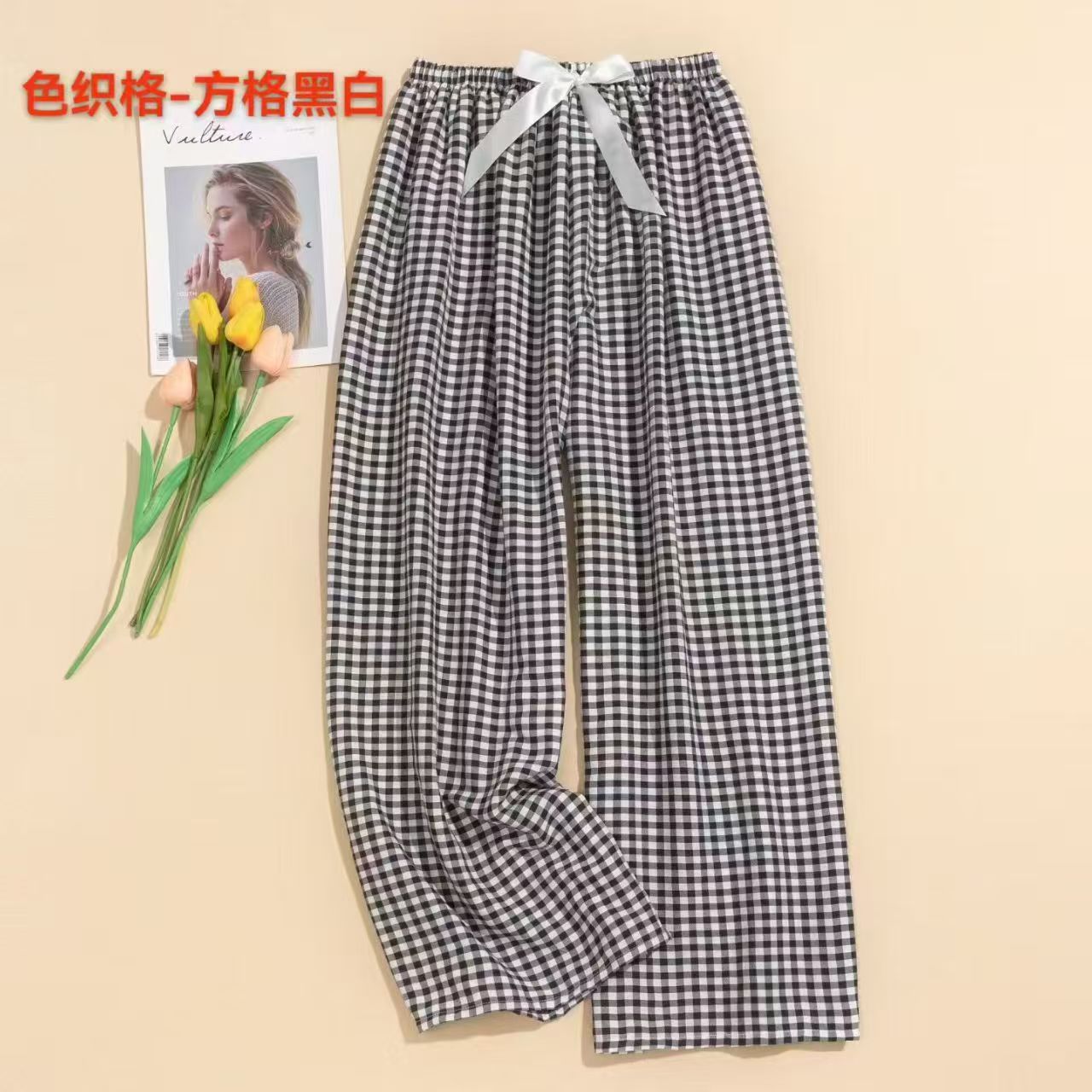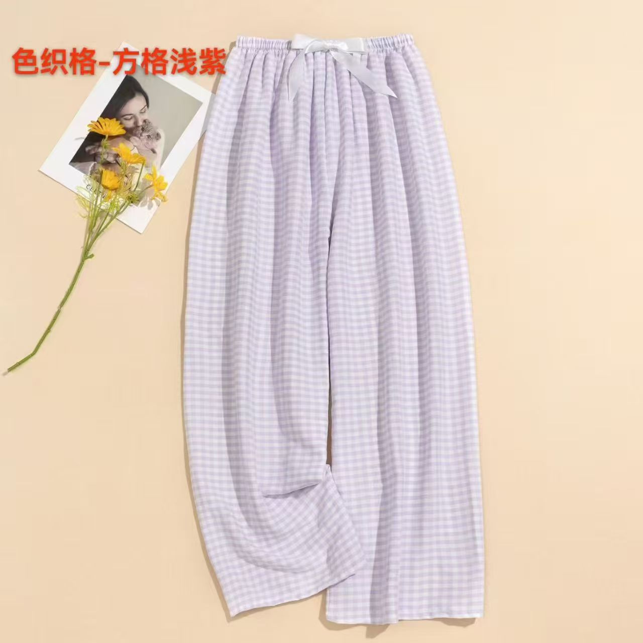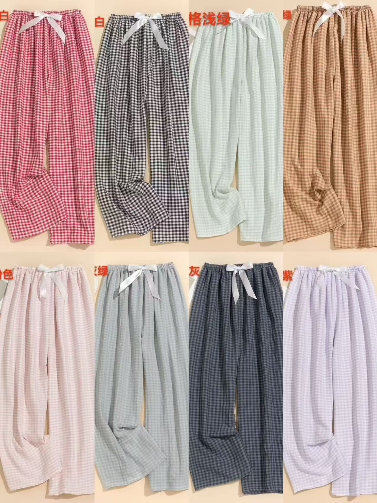 棉绸阔腿格子裤舒适透气12526903