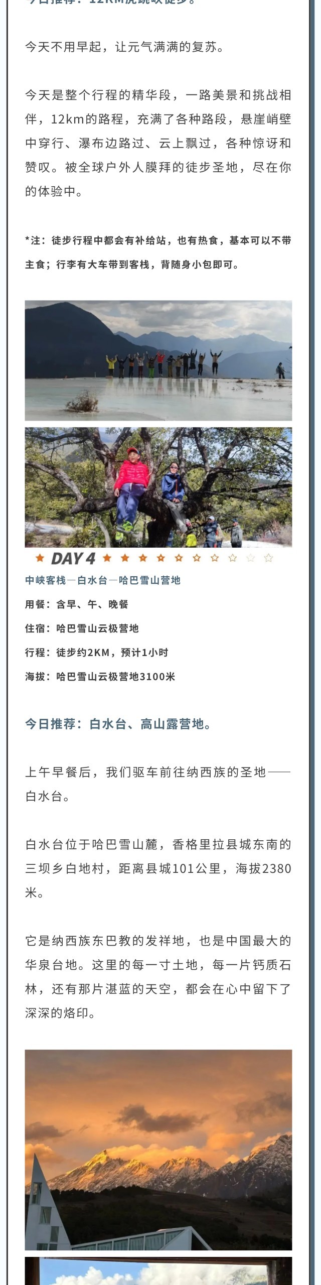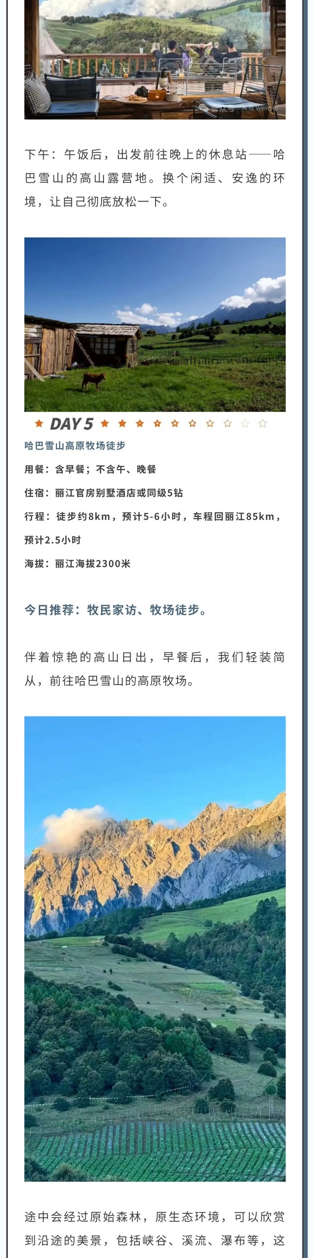共5晚住宿:1晚四钻,1晚五钻,两晚客栈,一晚帐篷露营,包括丽江古城多弗酒店/官房酒店或同级4钻,中途客栈或同级,中峡客栈或同级,哈巴雪山轻和营地,丽江束河官房别墅酒店或同级5钻。
