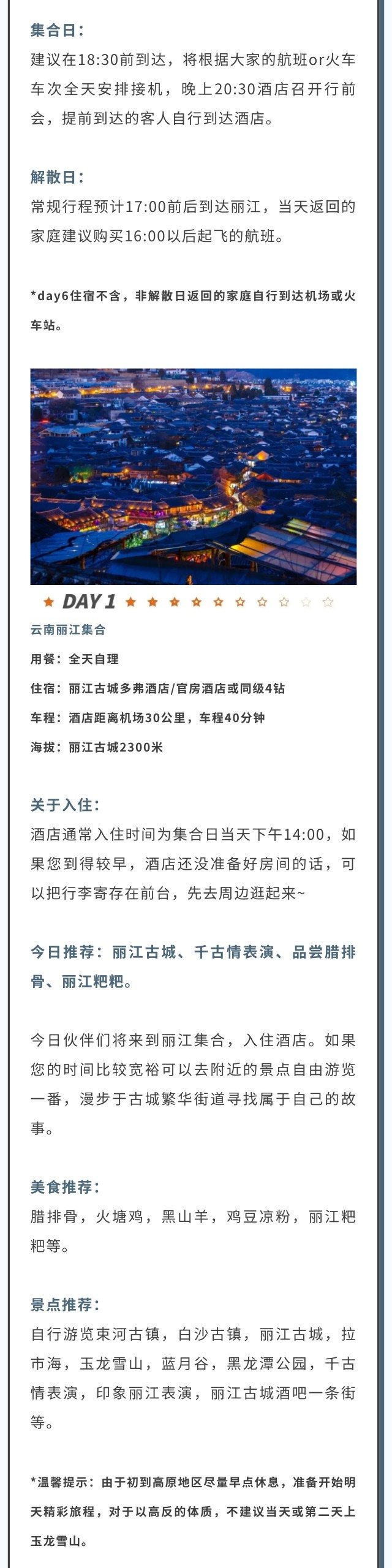 接送机:丽江机场/火车站集合日一个家庭安排一次接机,解散日统一送机一次;如为火车返程,需自行前往高铁车站。