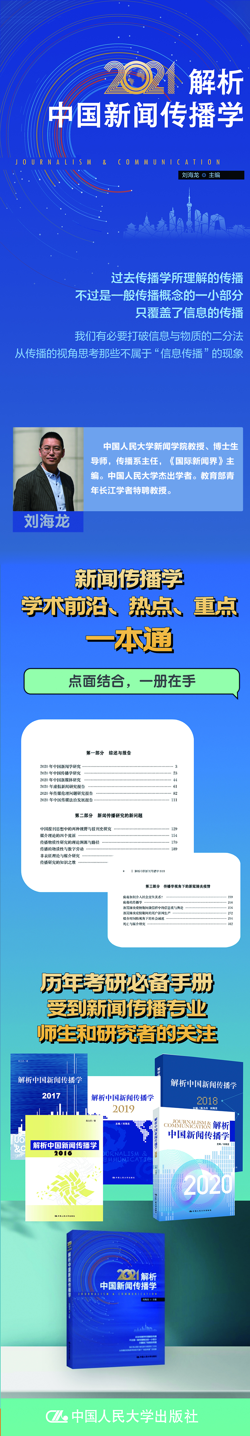 《解析中国新闻传播学2021》从学术层面、热点话题研究层面对2020年我国新闻传播学研究做了概述。书中不仅收录了多篇关于新闻传播学理论研究和新媒体研究的综述、研究报告,而且,书中多篇论文展望新的研究方向,对前沿领域的研究话题做了集中展示,论文的议题选择、研究方法起到了很好的示范作用。其中“传播学视角下的新冠肺炎疫情”是有别于往年的特色或亮点,这一板块基于2020年暴发新冠肺炎疫情的背景,收入学者们亲历后的一些学术思考,多篇富有思想深度,读后令人深受启发。