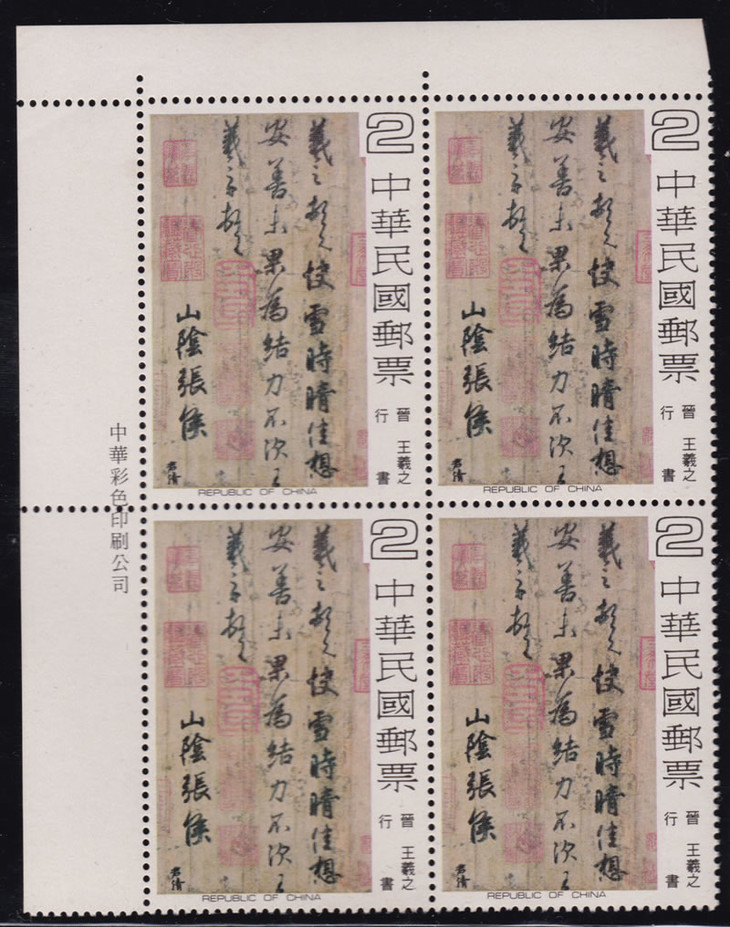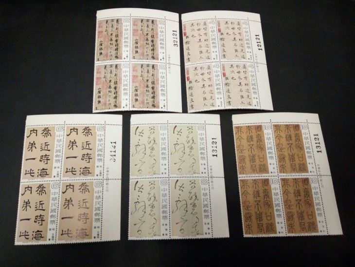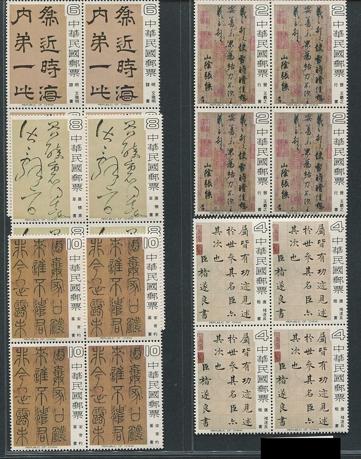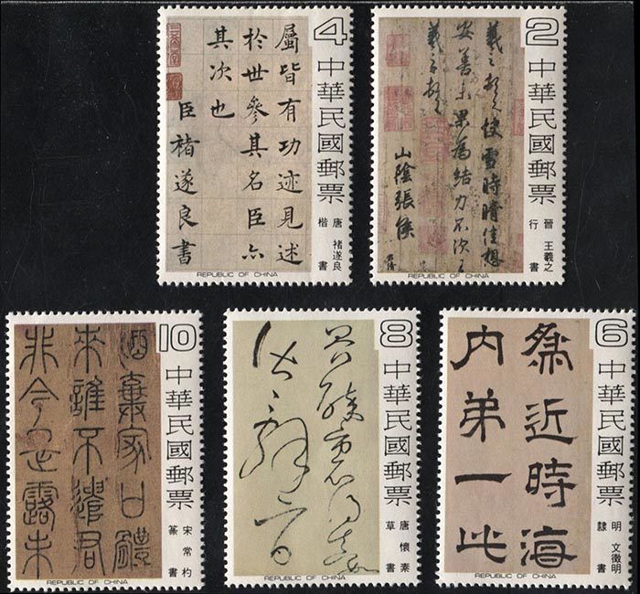 1978年中华邮政发行,邮票图案选取自故宫博物院的五幅最珍贵书法藏品。一套5枚,每一枚邮票呈现一种的书法字体,且分别来自不同的古代书法家: